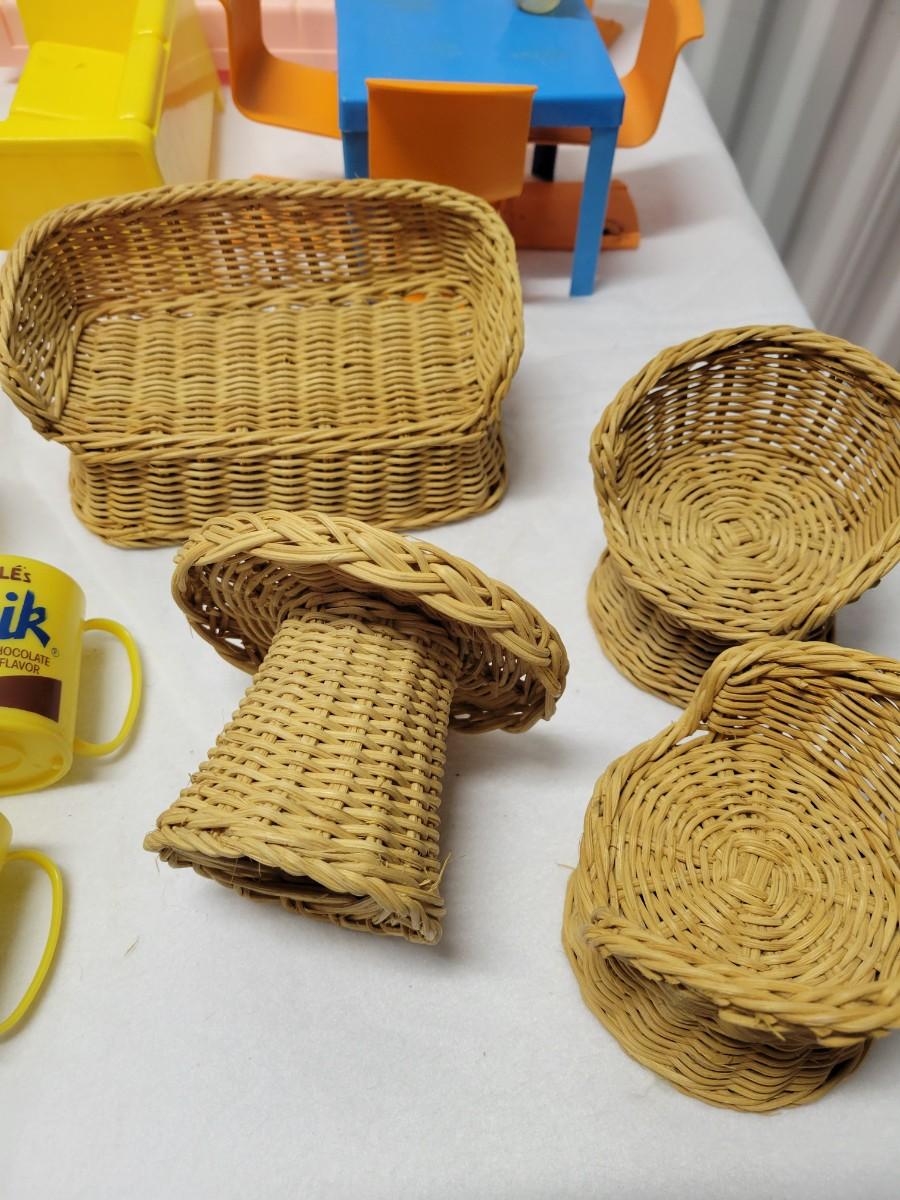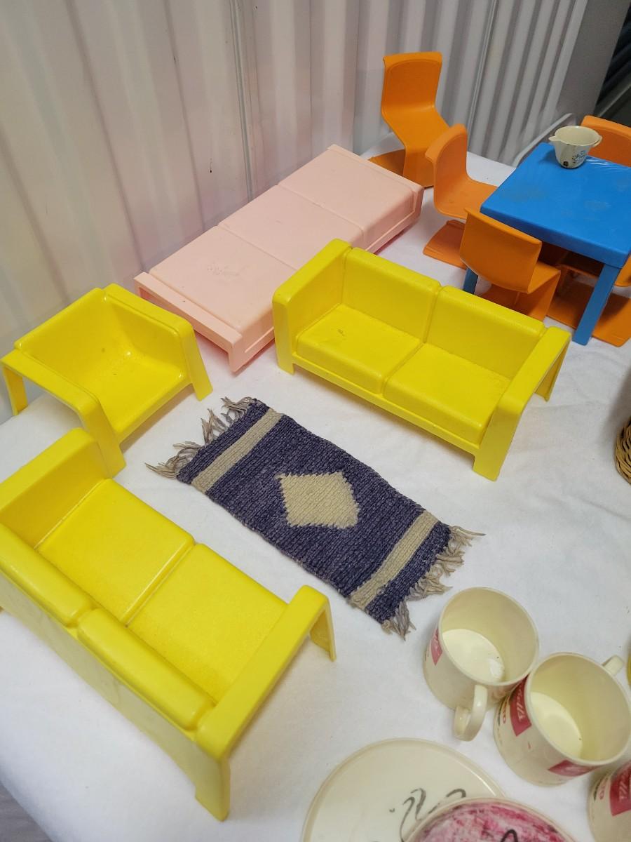 Plastic doll furniture - bed, 2 sofas, chair and rug, kitchen table with 5 chairs, wicker chairs, table and sofa.