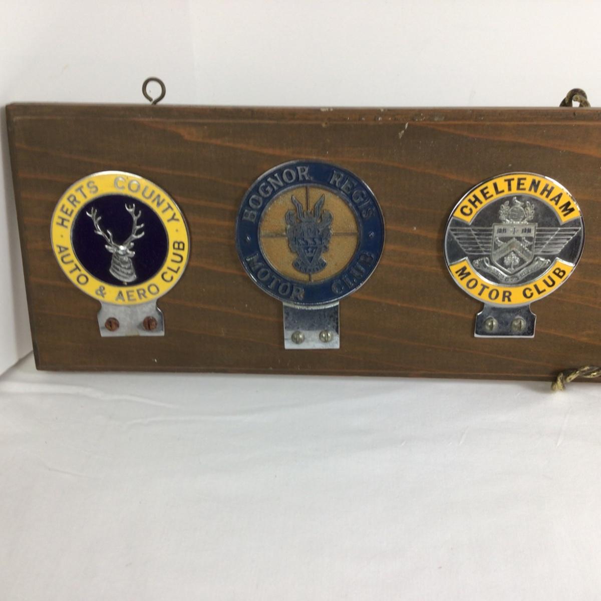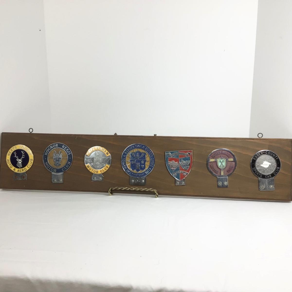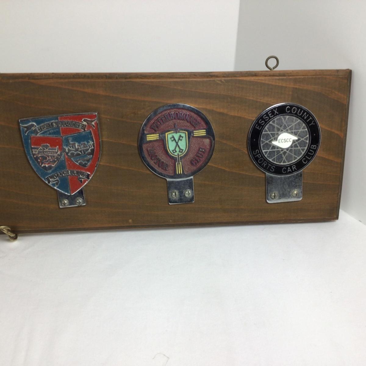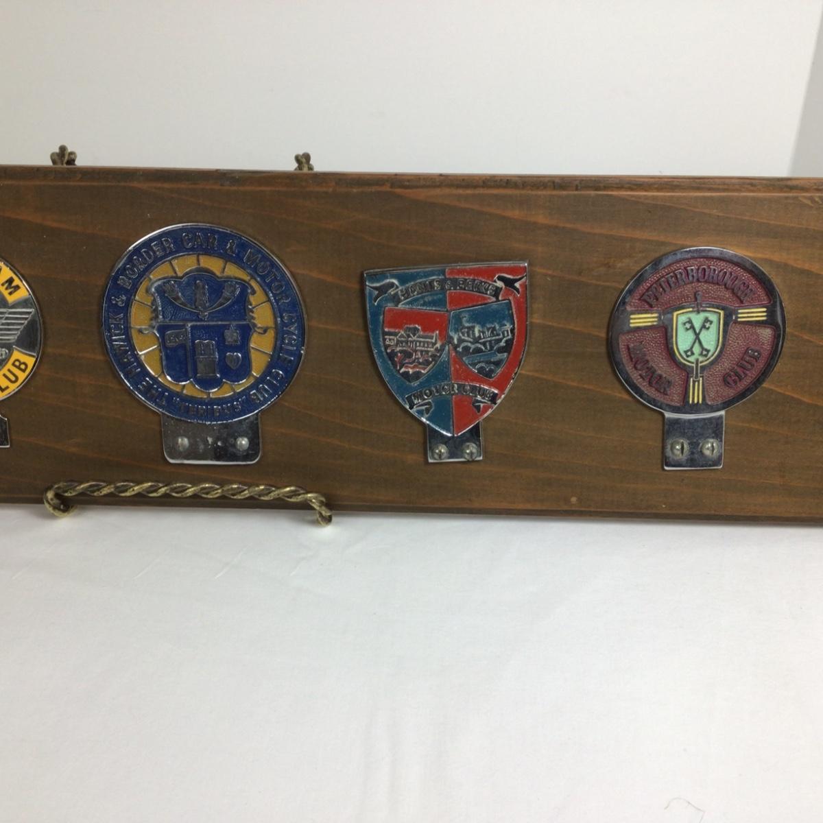 Vintage car club badges from England, places include Herts Co. Bognor Regis, Cheltenham, Hawick, Hants & Berks, Peterborough and Essex. They are mounted on wood, ready to hang. Wood measures 30” x 6”.