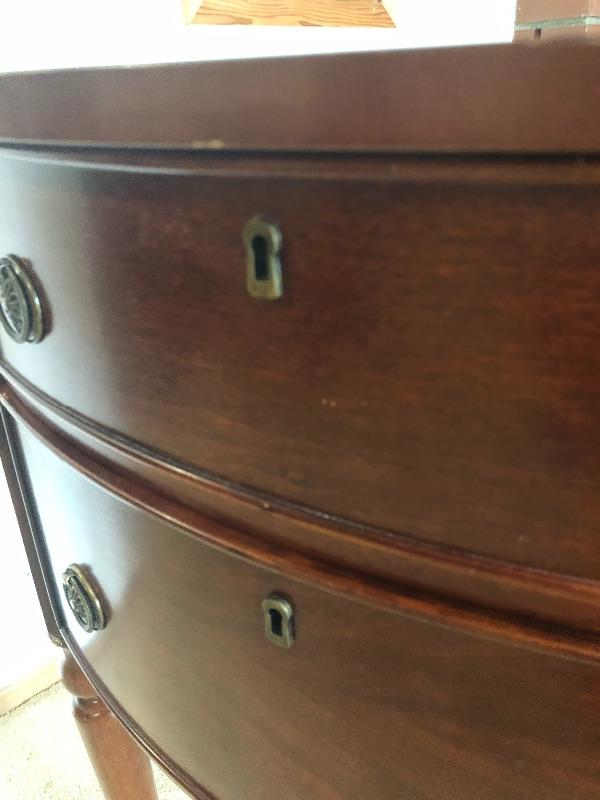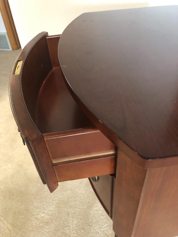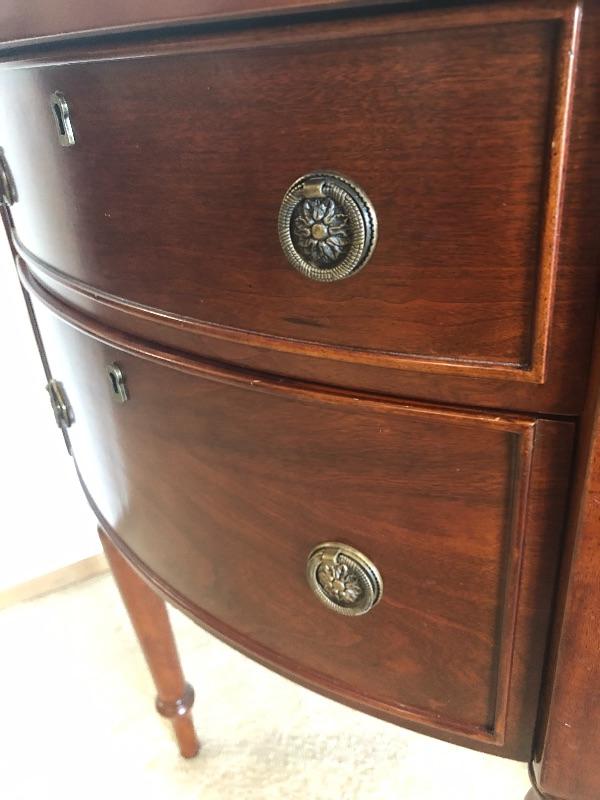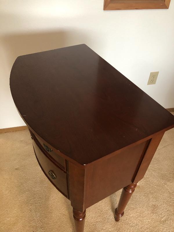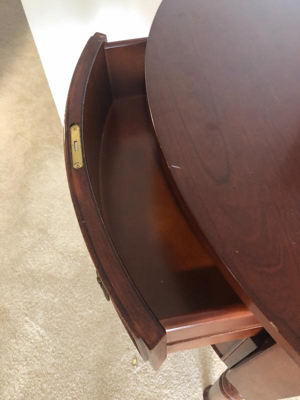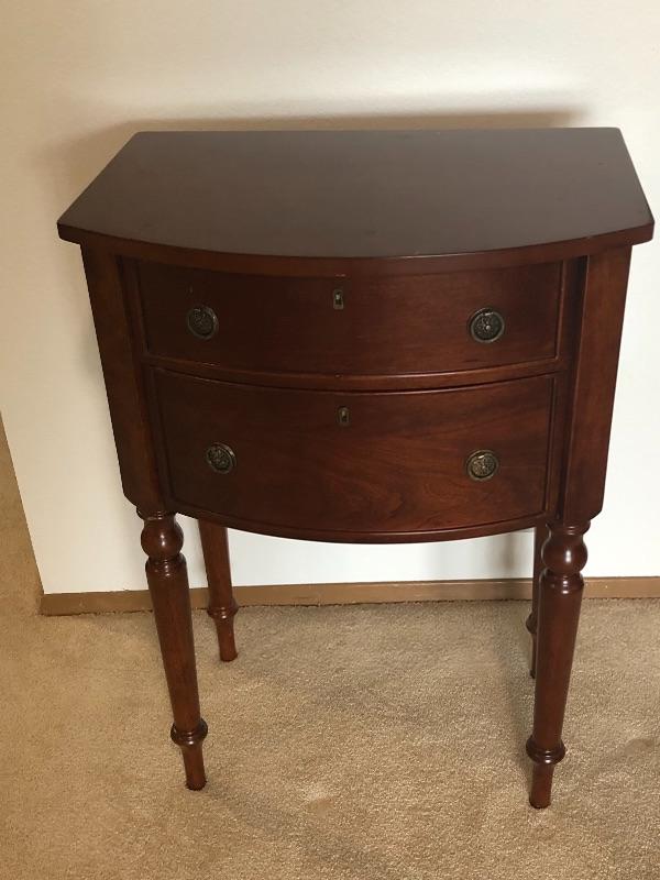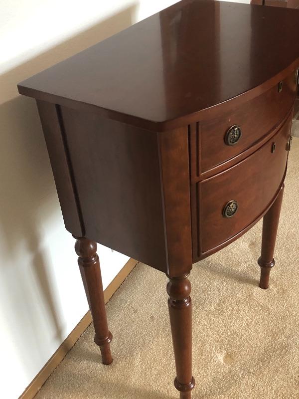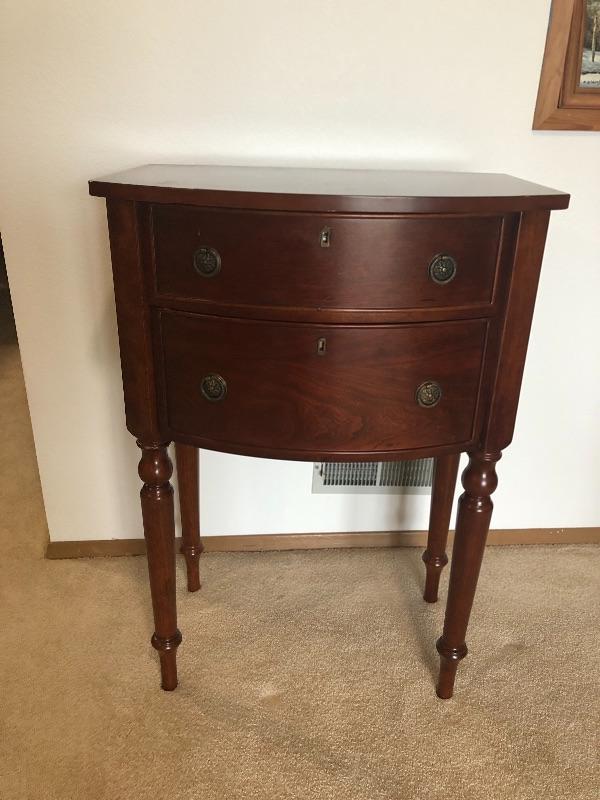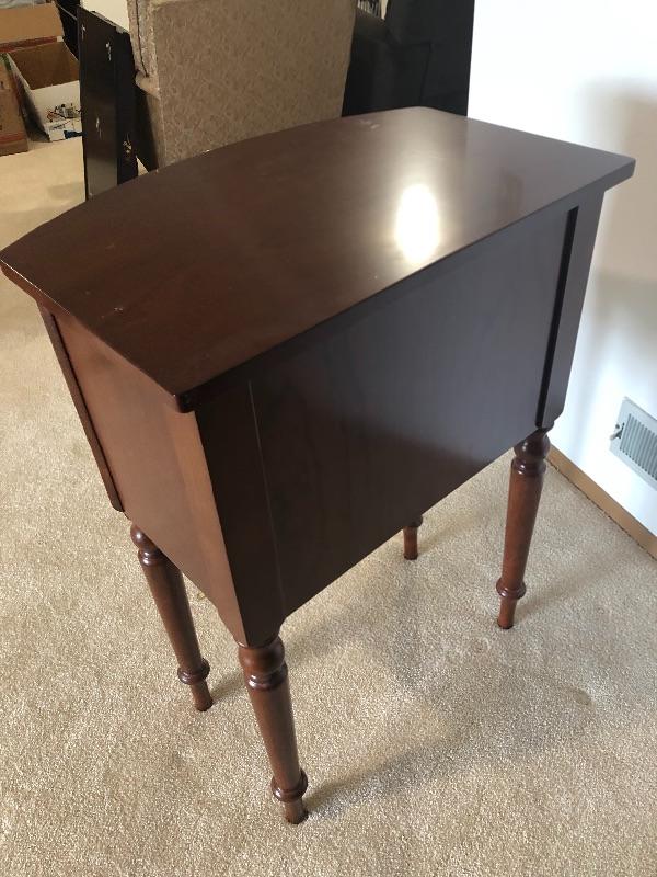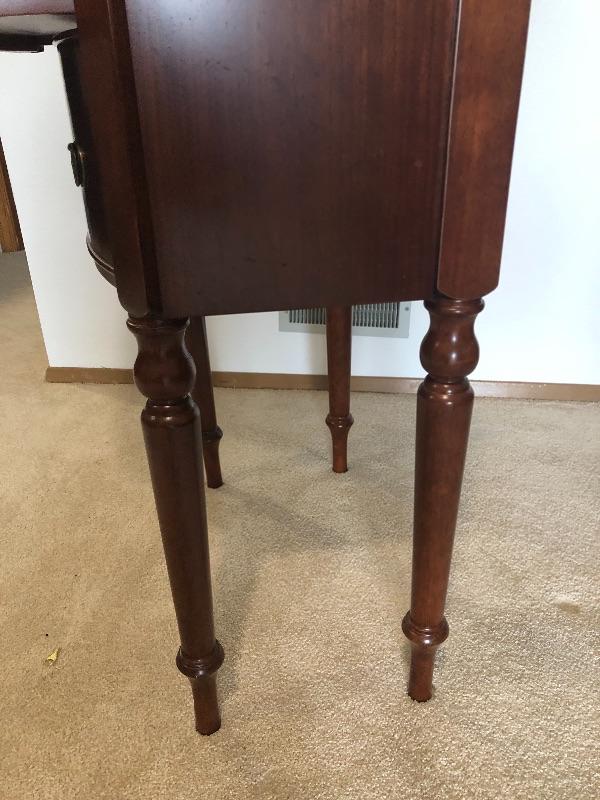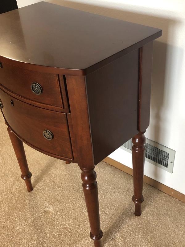 Small entry or side table made by the Bombay company. Appears to be solid cherry wood. 22,5 W 15.25 D x 32.25 H very good condition.