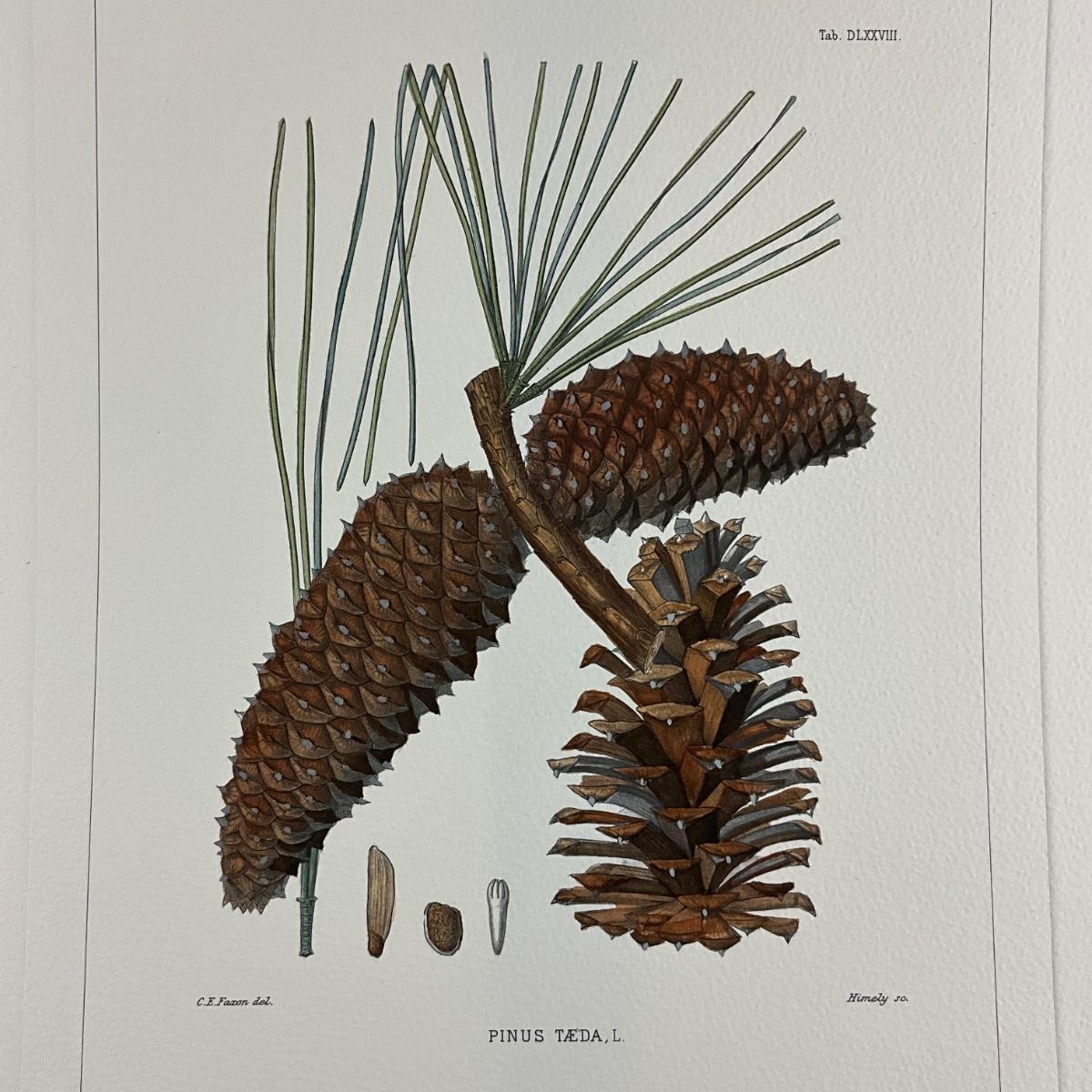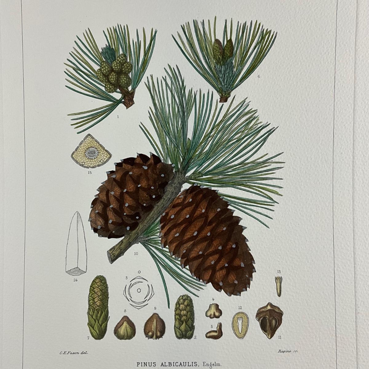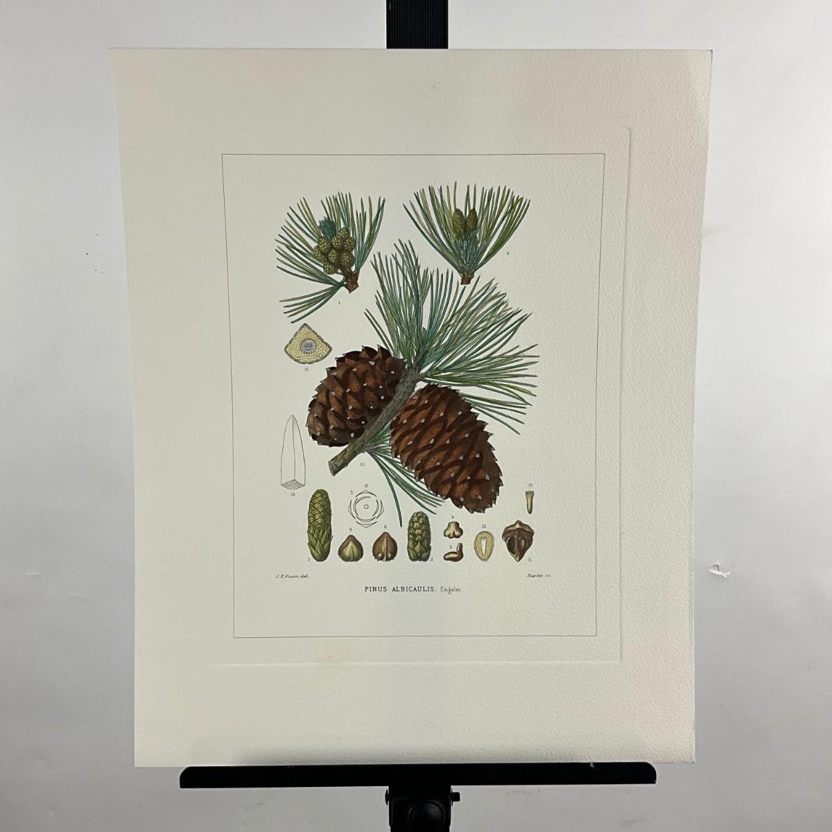 Loblolly pine cone from Pinetum Britannicum by W. Richardson, Ravenscroft, and Lawson. vintage botanical illustration print of the whitebark pine (Pinus albicaulis). The text at the bottom identifies it as "PINUS ALBICAULIS. Engelm.