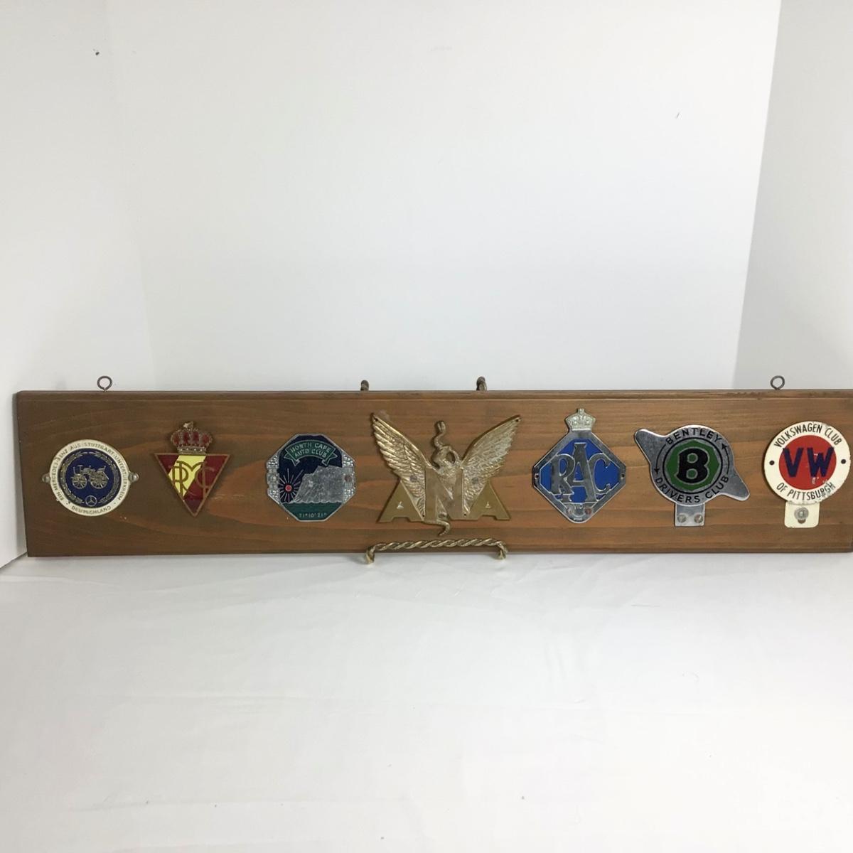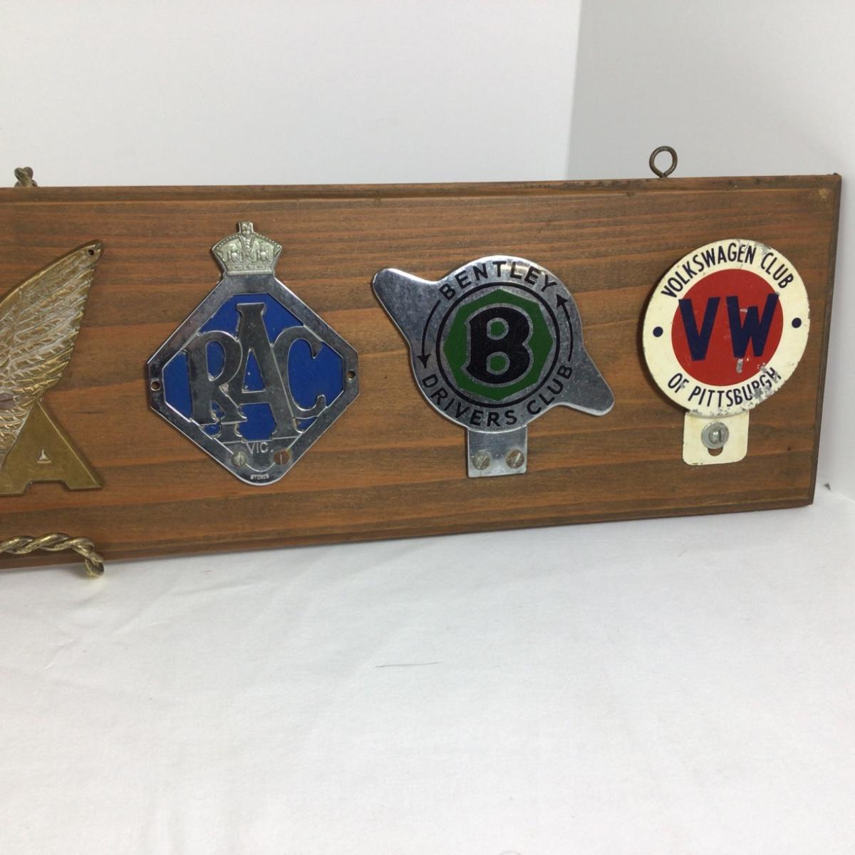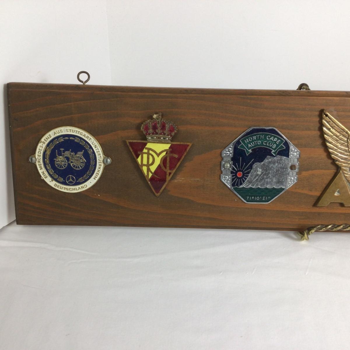 Badges are mounted on wood, 30” x 6”, badges from RMC, North Cape, Bentley, Pittsburgh, ANA, and Stuttgart.