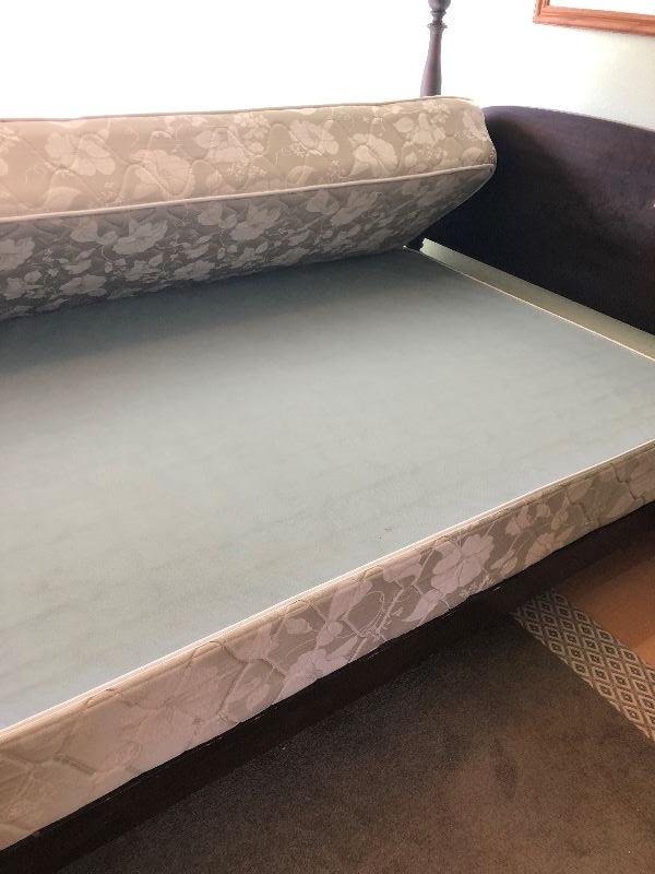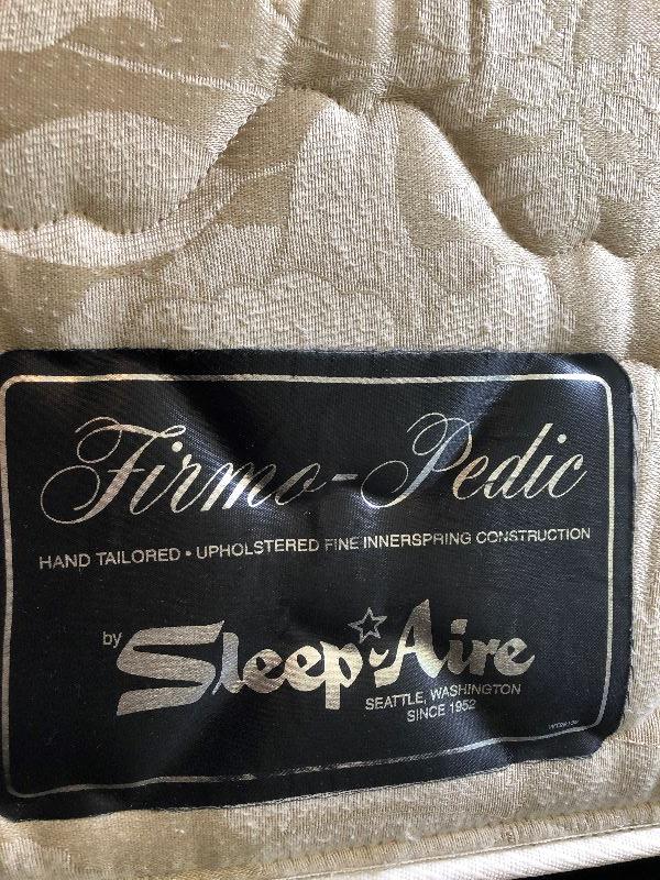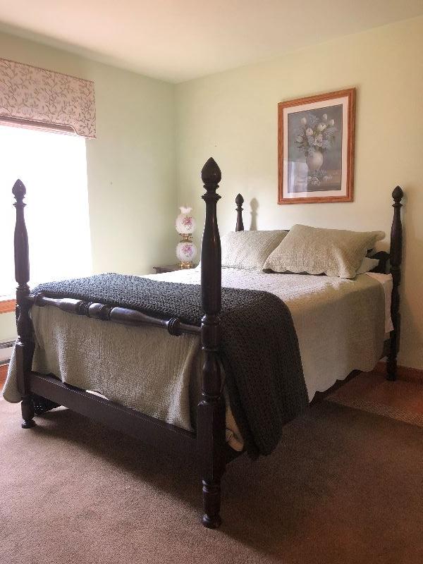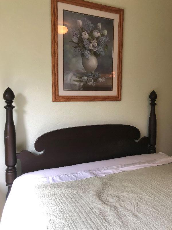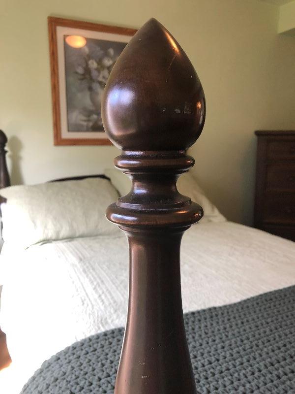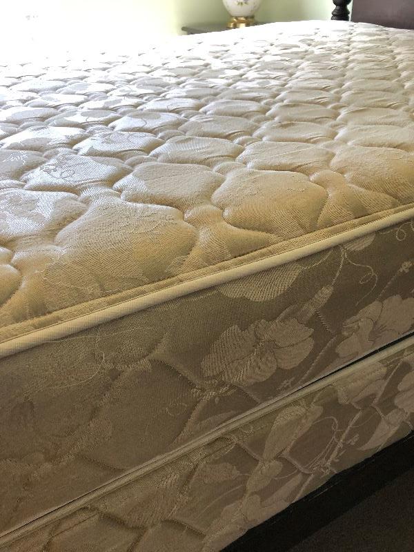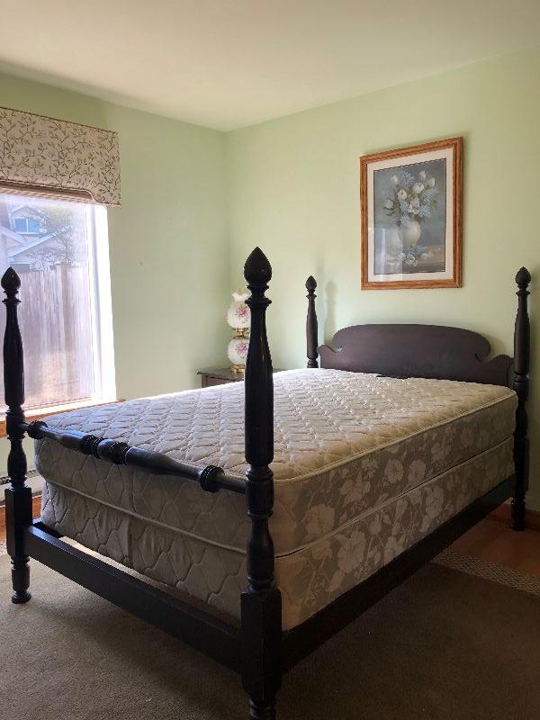 Ethan Allen 4 poster queen size bed solid wood and hand crafted in the United States. Includes all bedding shown in picture and hand tailored Firmo-Pedic Sleep*Aire queen size mattress and box spring made in Seattle WA. Note: lot does not include picture and lamp shown in picture.