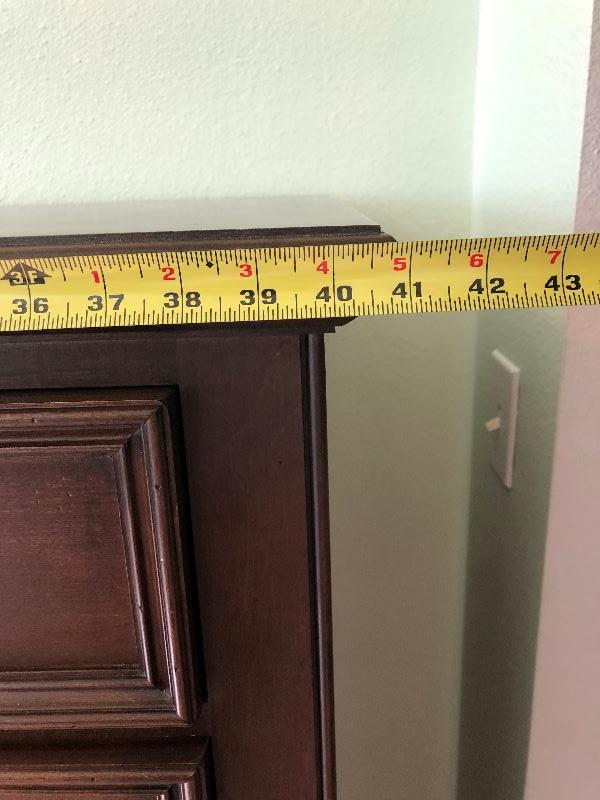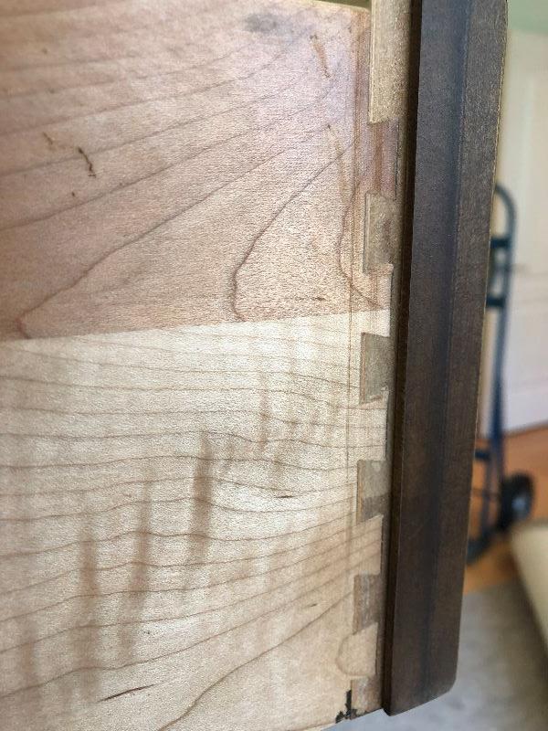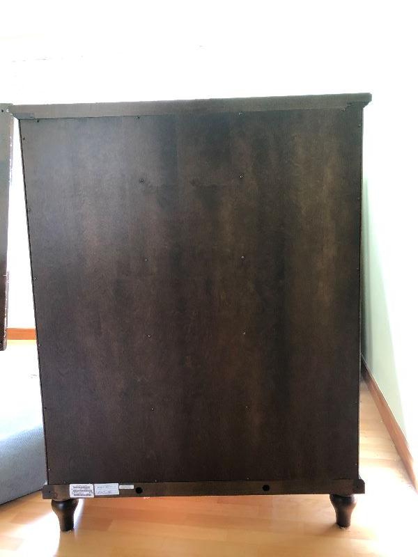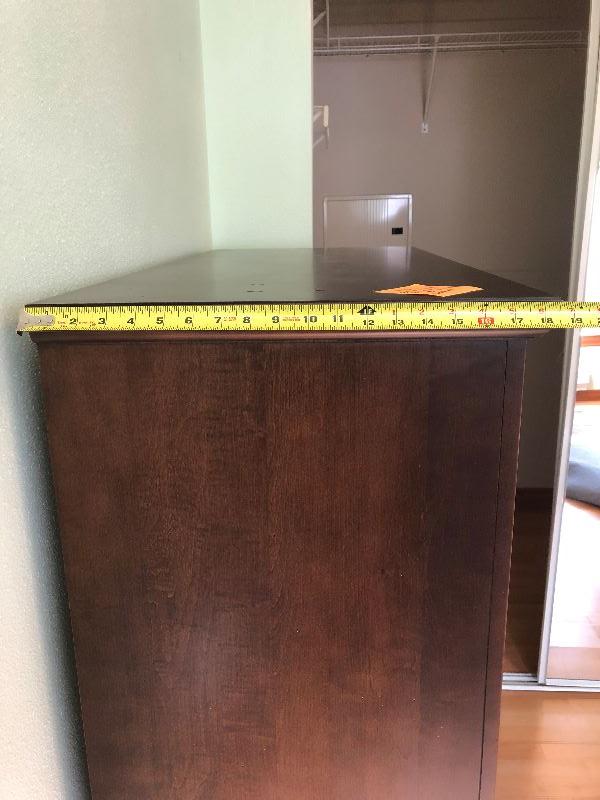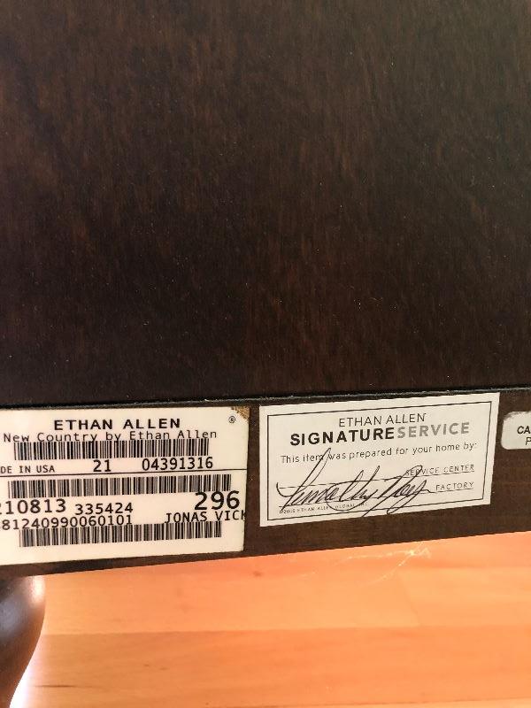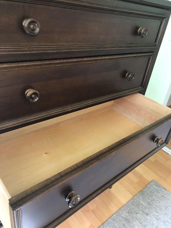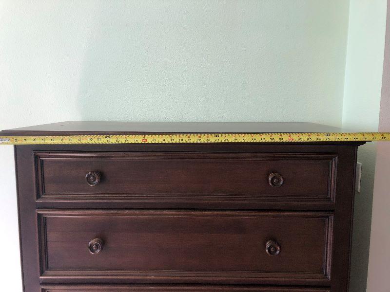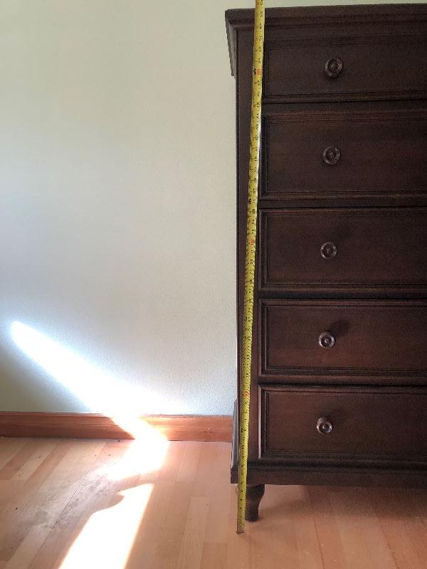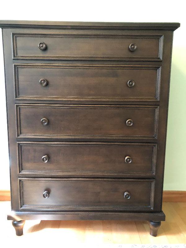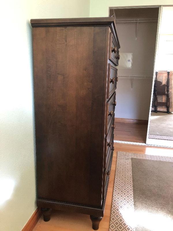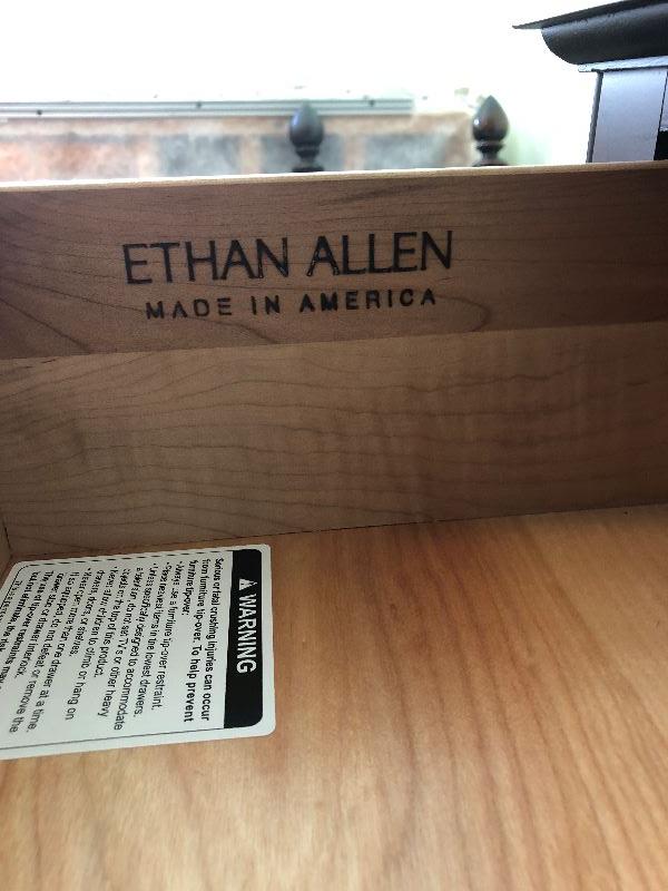 Ethan Allen tall bedroom dresser with 5 drawers solid wood and hand crafted in the United States. Drawers are built with dove tail corners. Measurements shown in pictures.. .