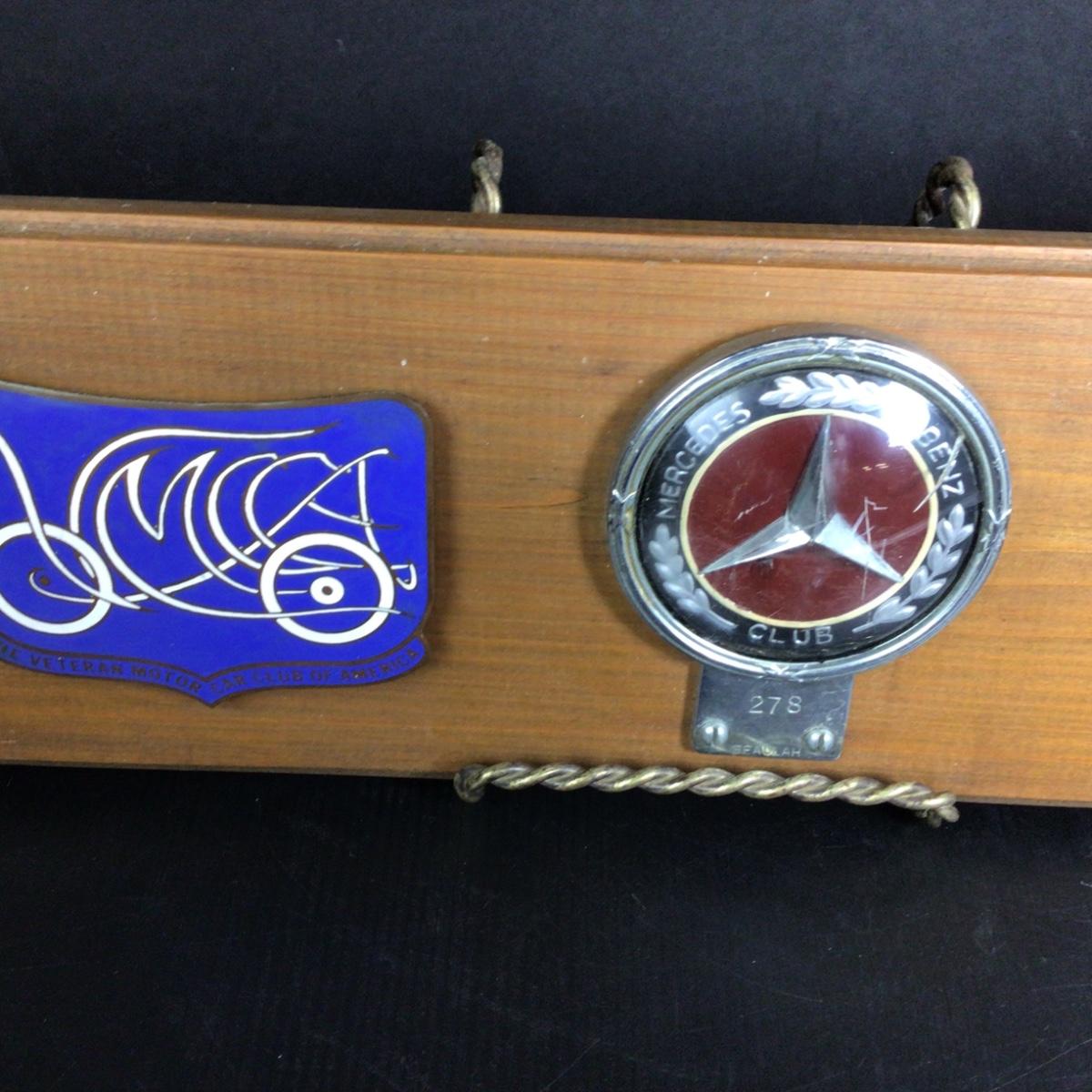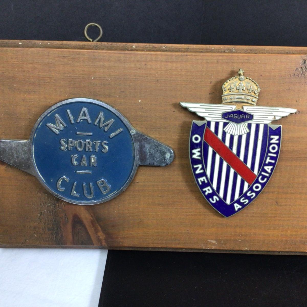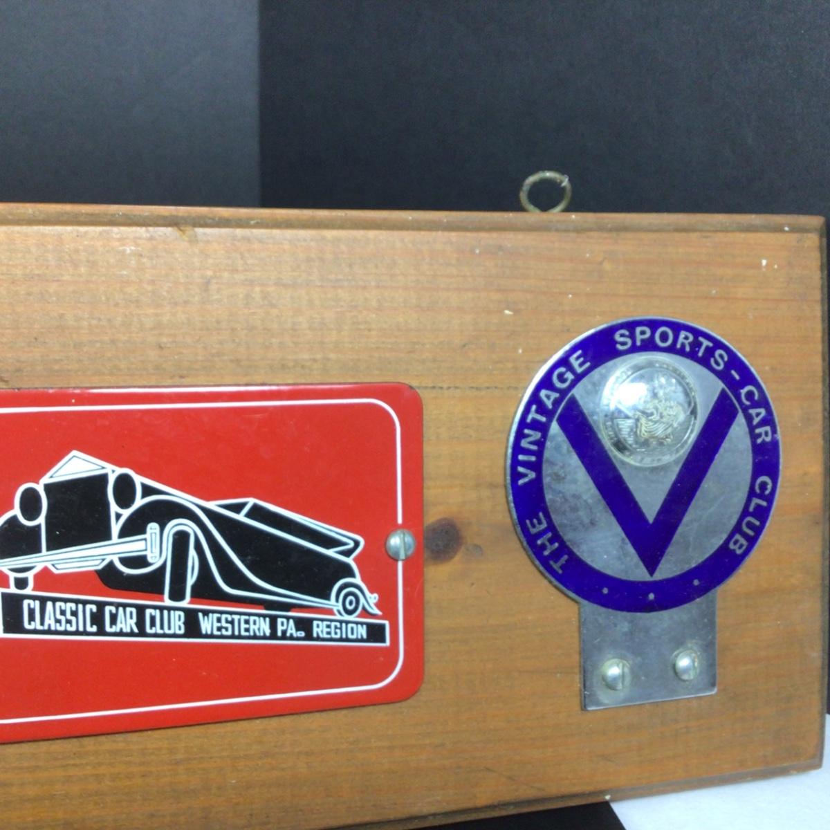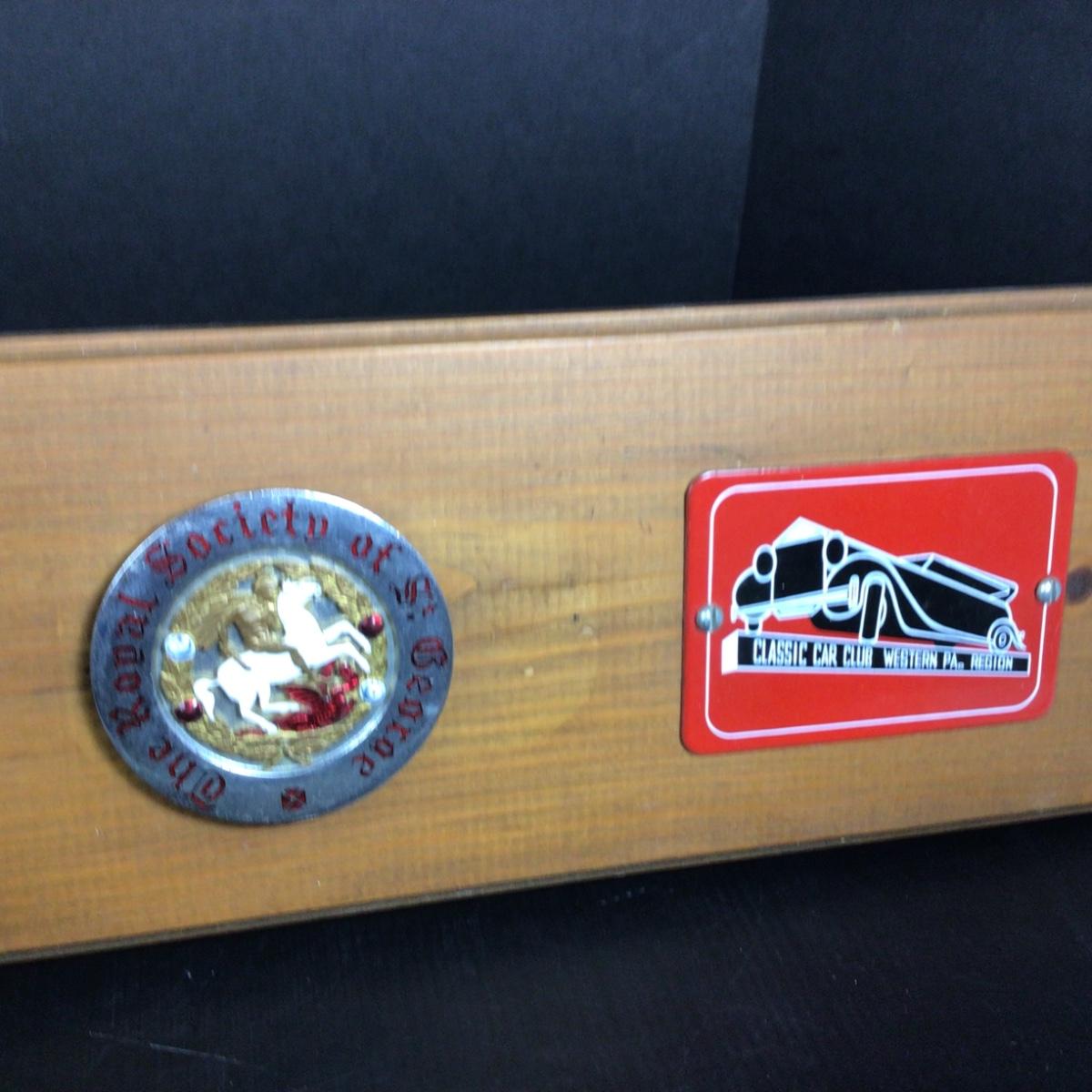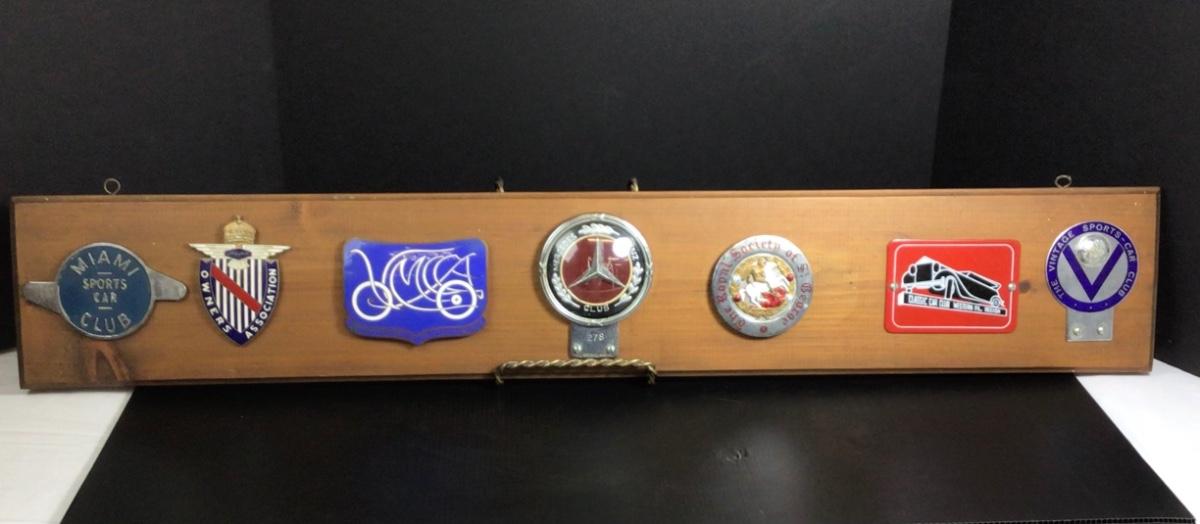 There are 7 badges that are mounted on wood that is 36” x 6”. Badges included are Miami, Jaguar Owners Association, Veteran Motor Club of America, Mercedes Benz Club, Royal Society of St. George, Western Pennsylvania vintage sports car club.
