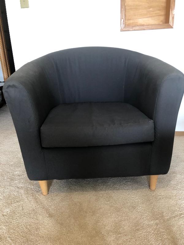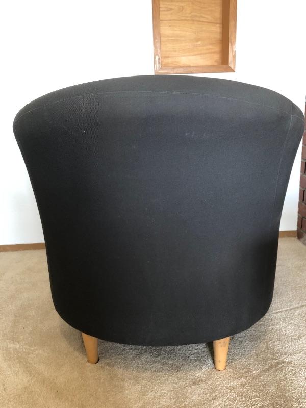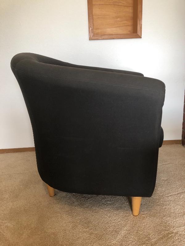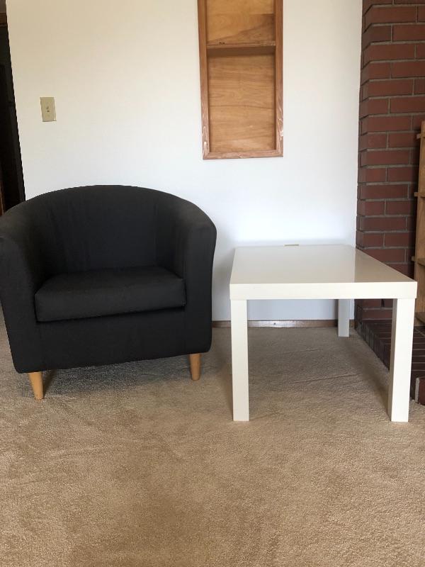 Chair is a dark gray cloth, slightly faded but not that bad. Table is a lightweight man made material. Chair 30 W x 29 H x 21 D