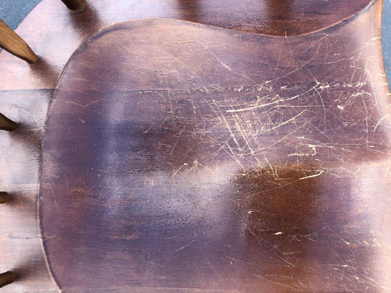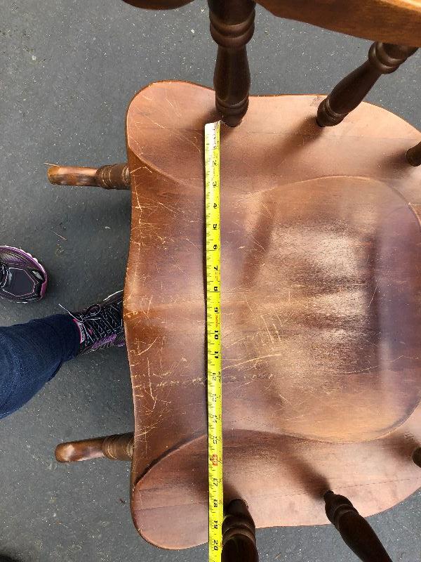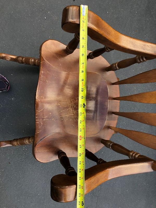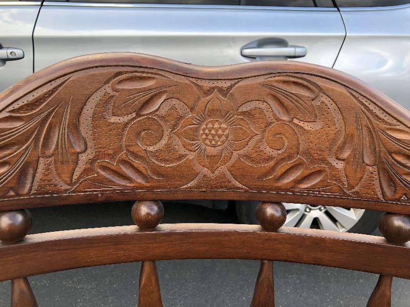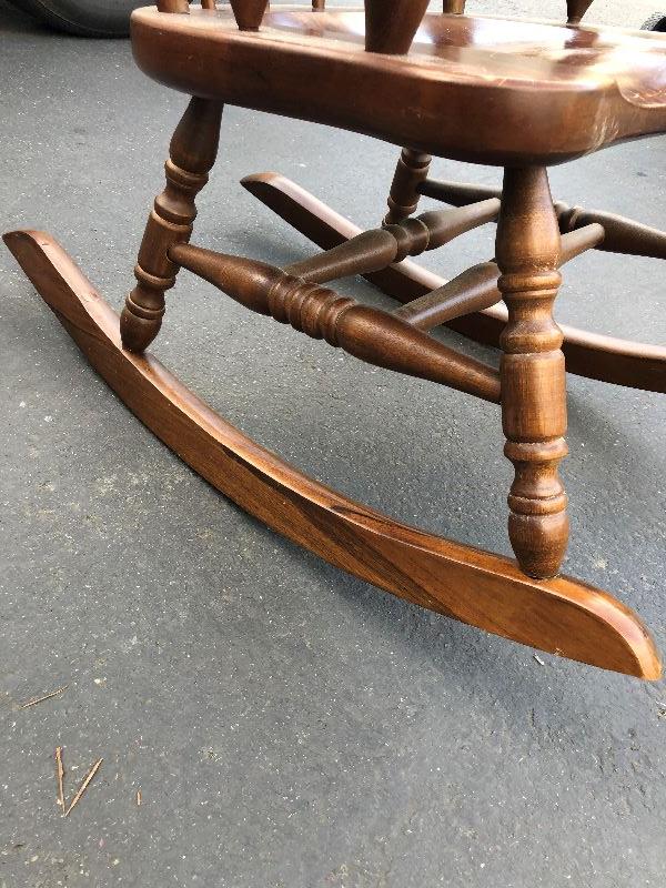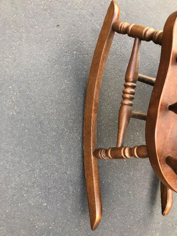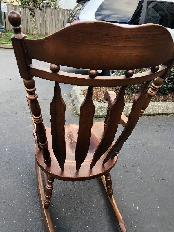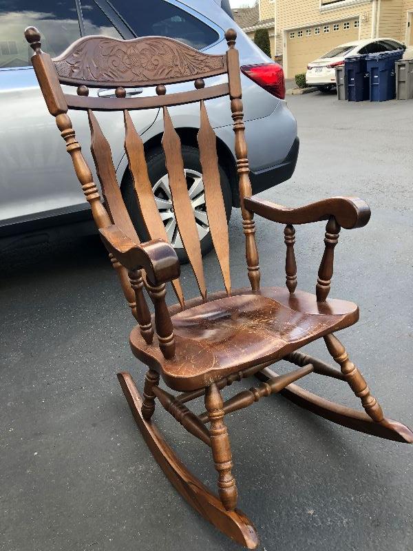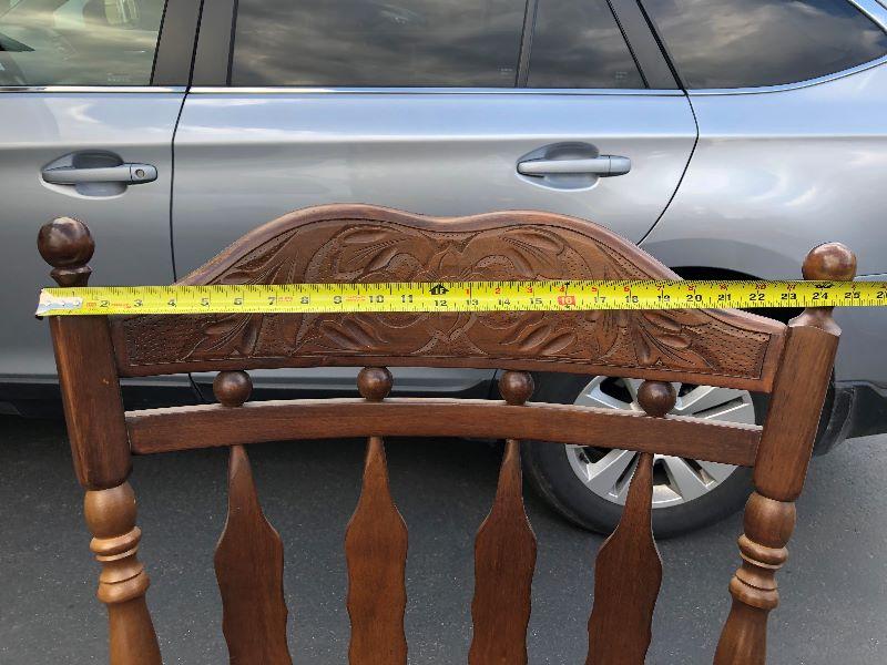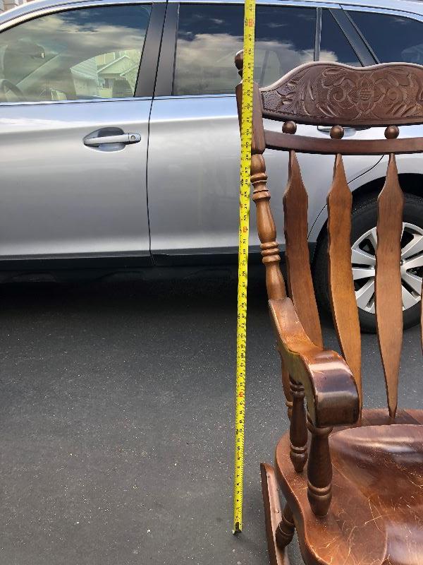 Solid wood carved rocking chair some scratches on the seat that can easily be refinished. Measurements shown in pictures.