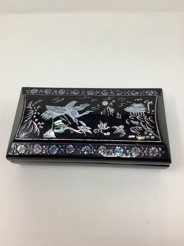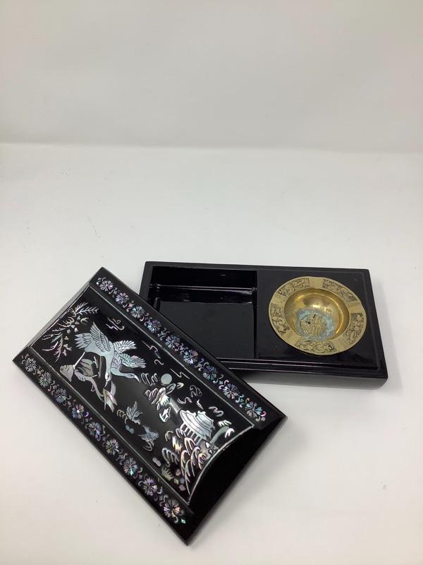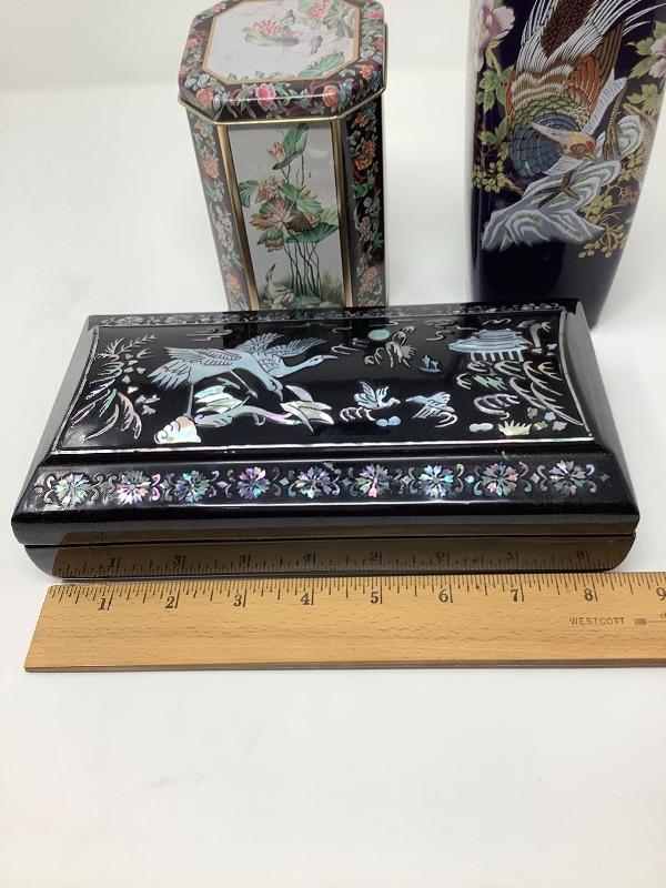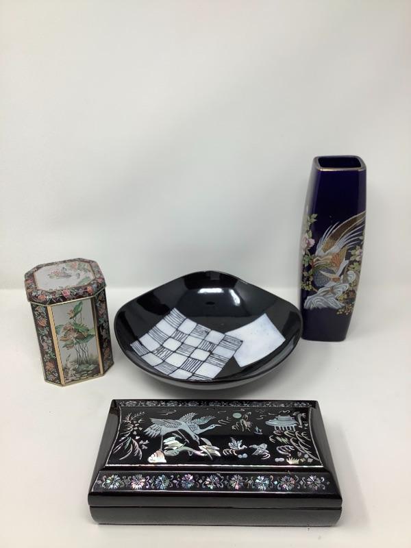 Black Japanese Hand Crafted Stoneware, Abalone shell and Lacquer box, Vase and Tin.