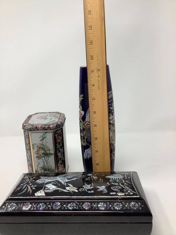 041: Black Japanese Hand Crafted Stoneware, Abalone shell box, Vase and Tin