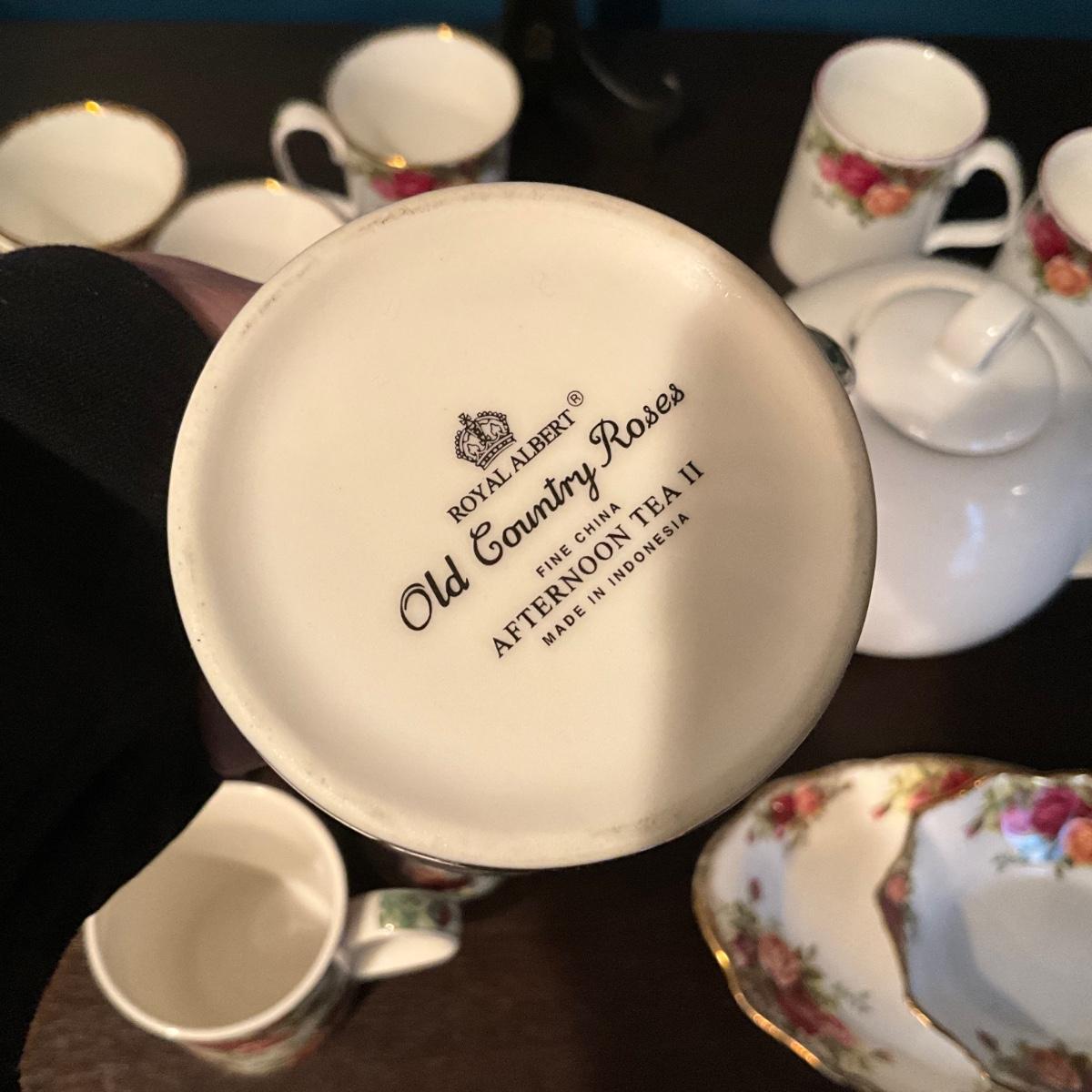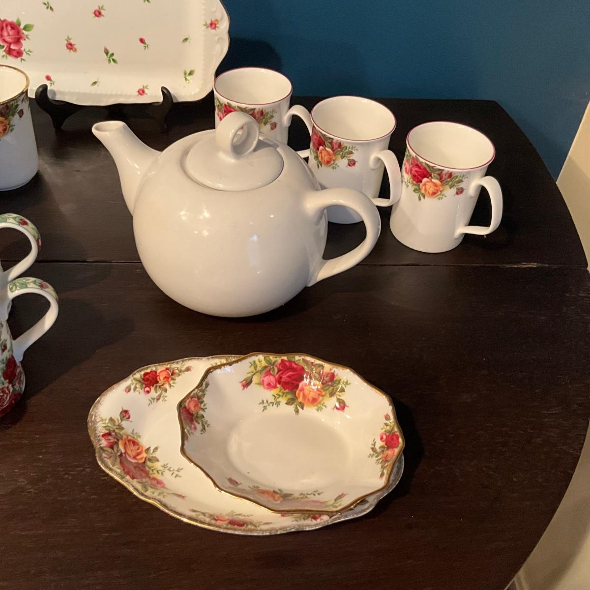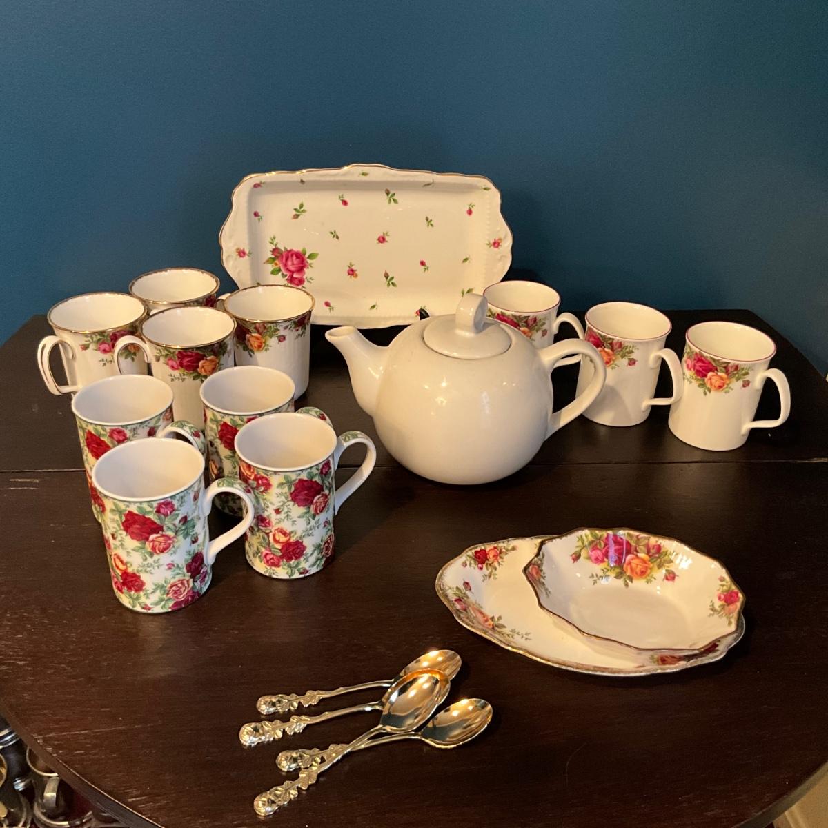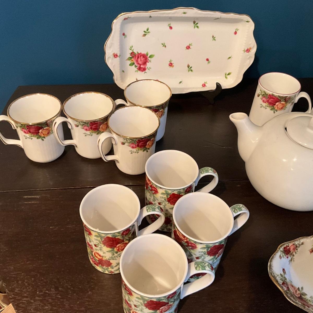 Two Sets of 4 mugs, with 3 mugs with white westwood teapot, with 2 oval trays and one rectangle tray