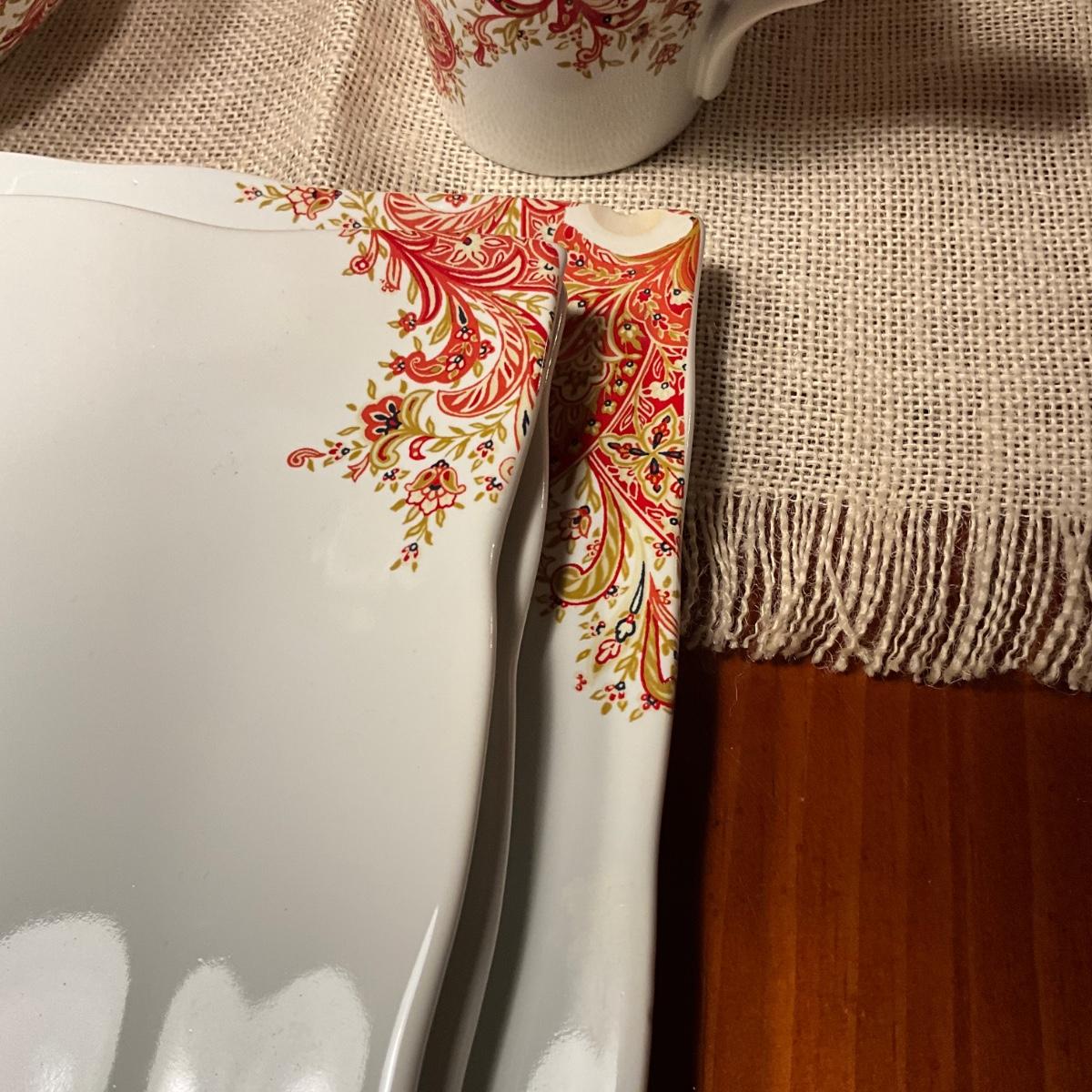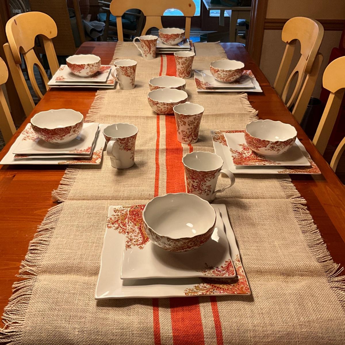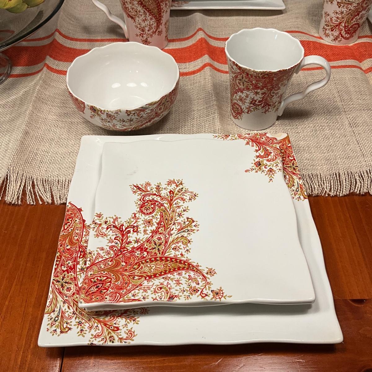 Dishwasher and microwave set 8- bowls 5.75" round , 6 mugs, 8 dinner plates 10.25" square, 8 salads 8" square, with new orange runner