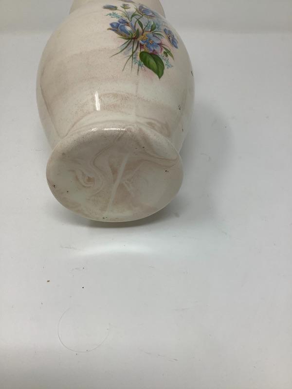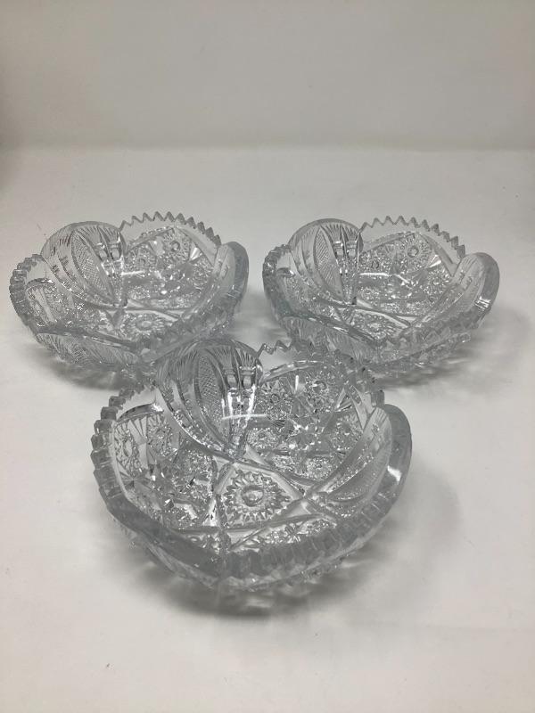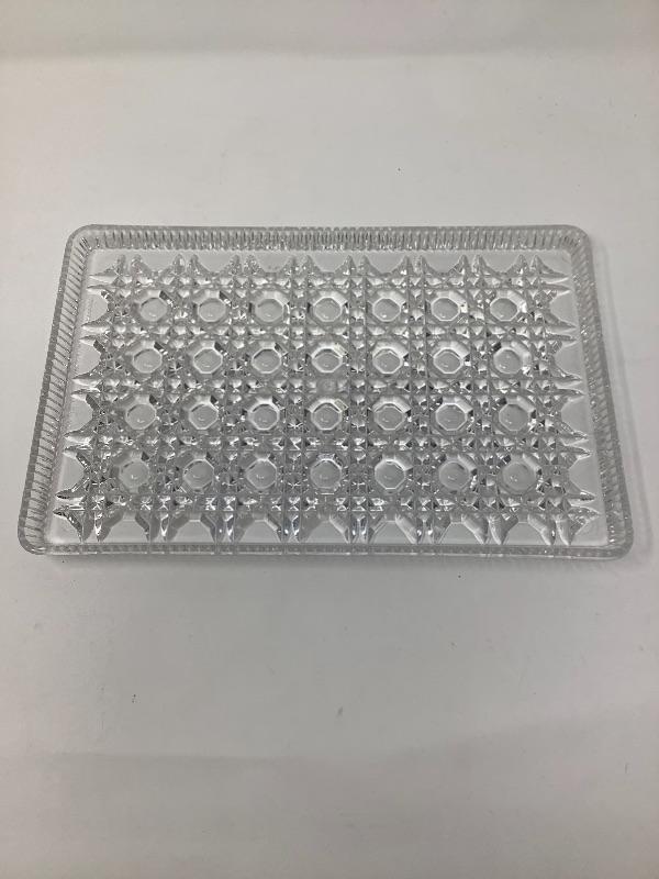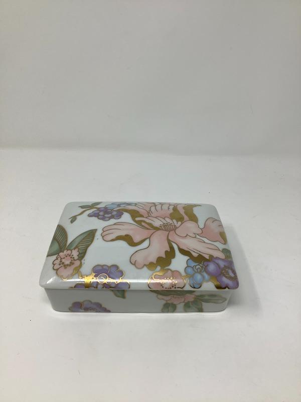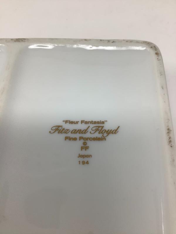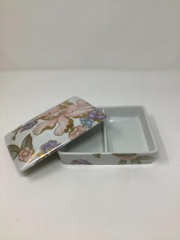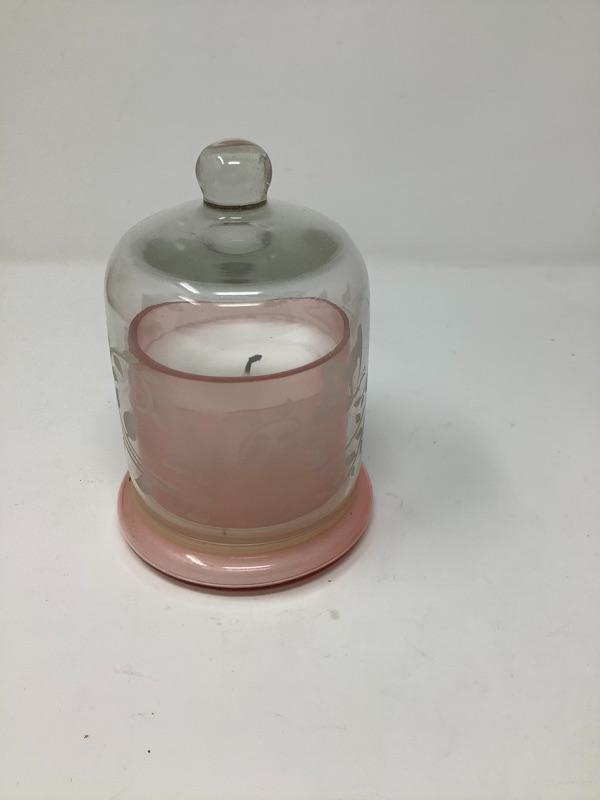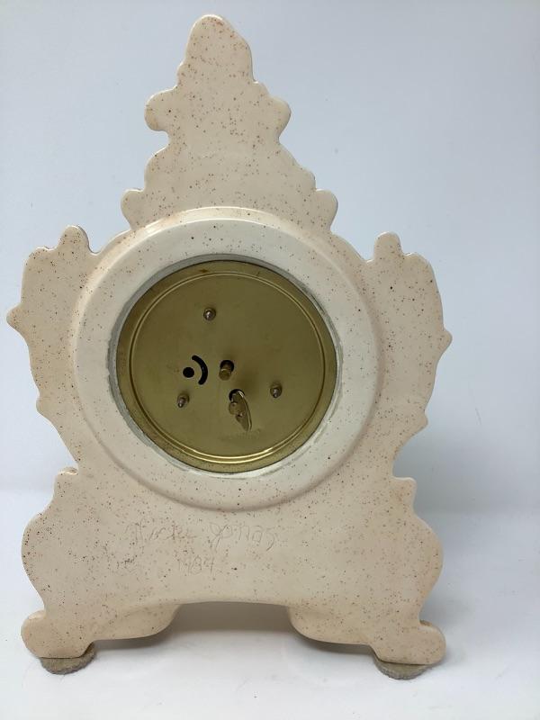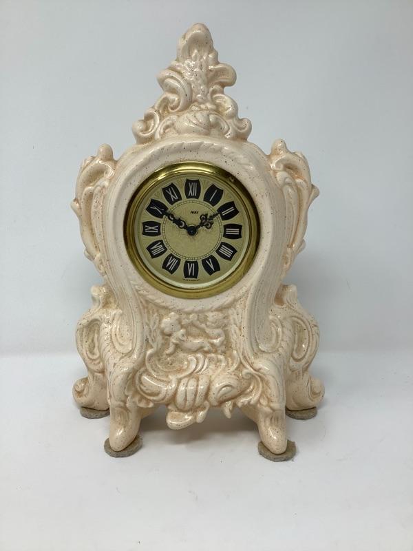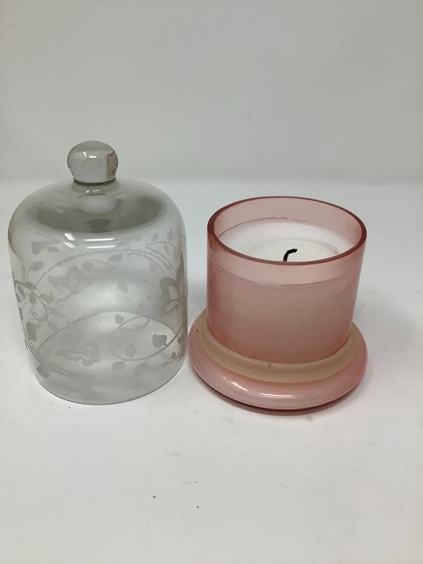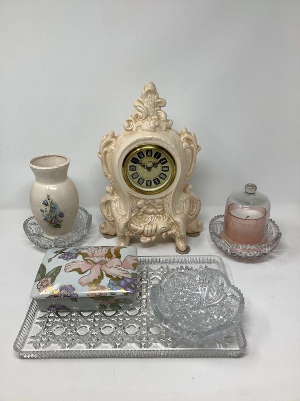 Victorian style ceramic clock 11” tall, ceramic flower vase 6” tall, Fitz and Floyd fine porcelain box 6”x4.75” plastic tray 11.5”x7.5”, 4 cut glass bowls 5”, pink candle