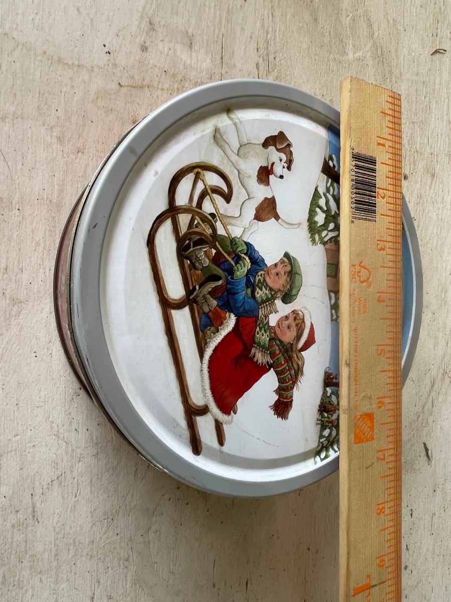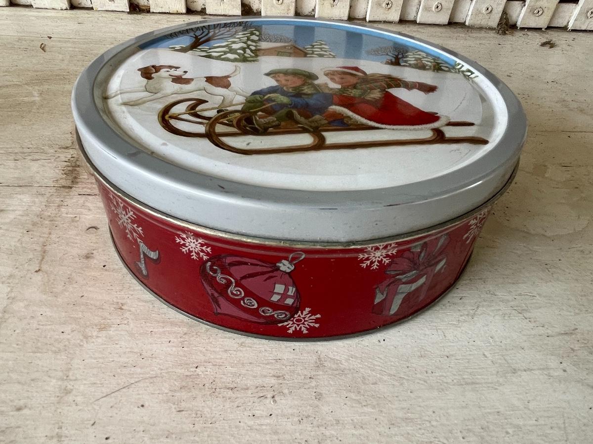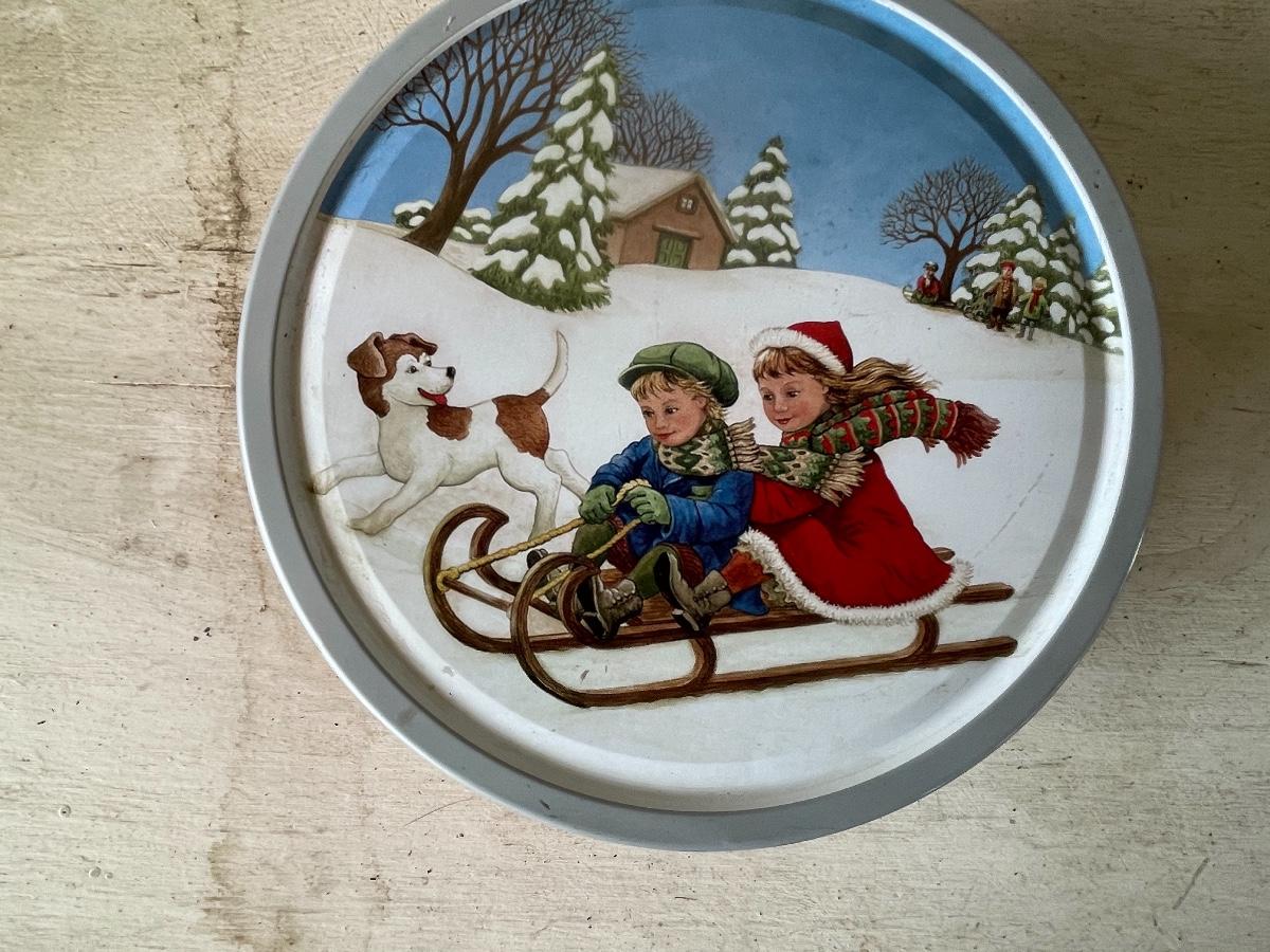 Christmas holiday tin featuring happy kids sledding. Round, good condition.