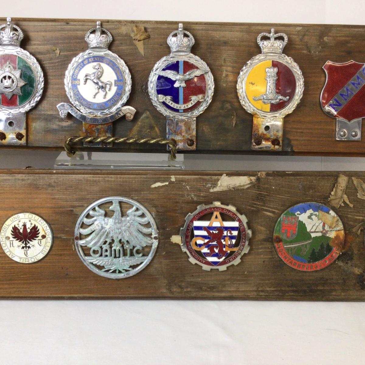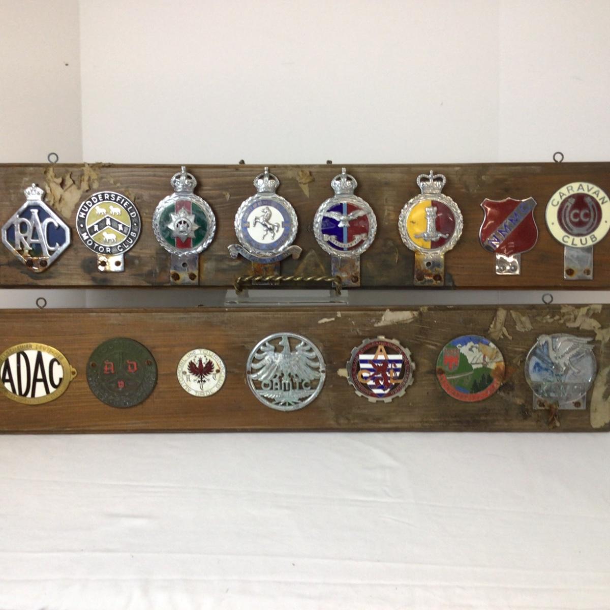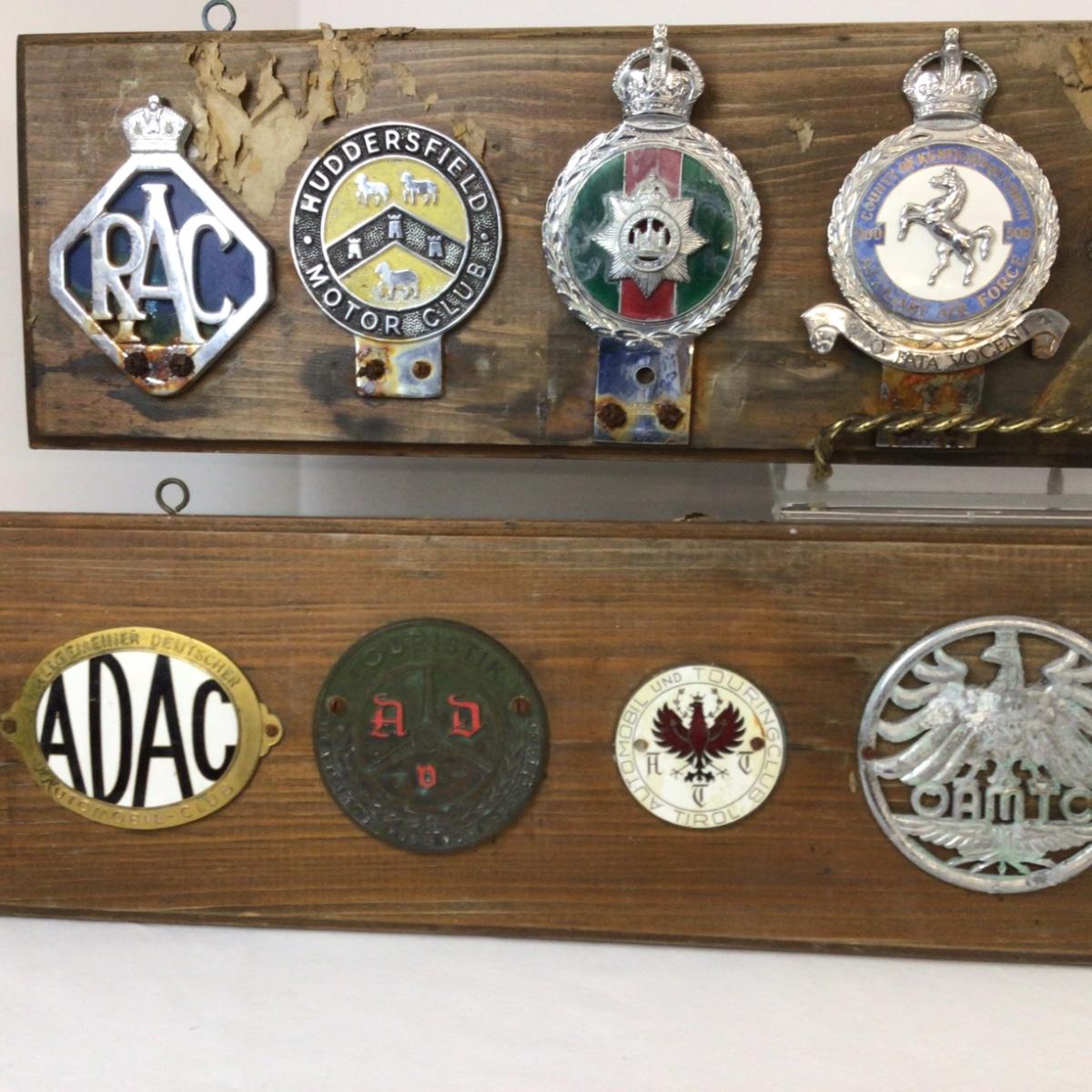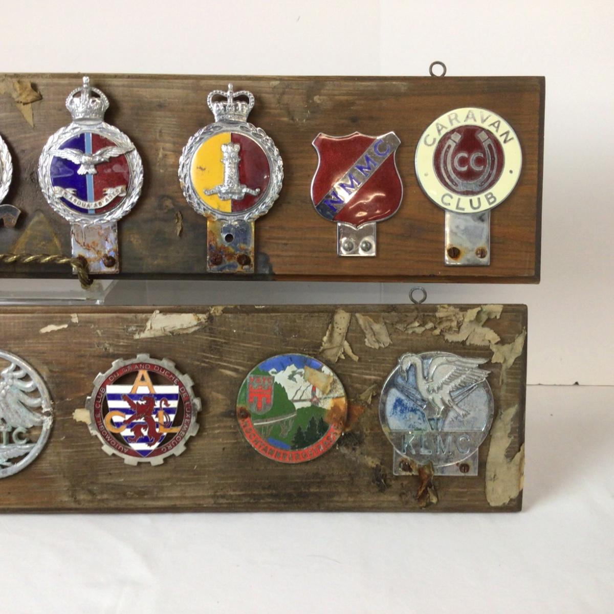There are 2 plaques with assorted car badges, wood and badges have wear and damage from storage.