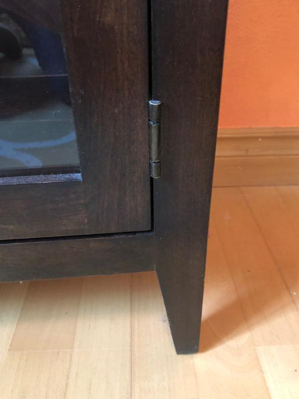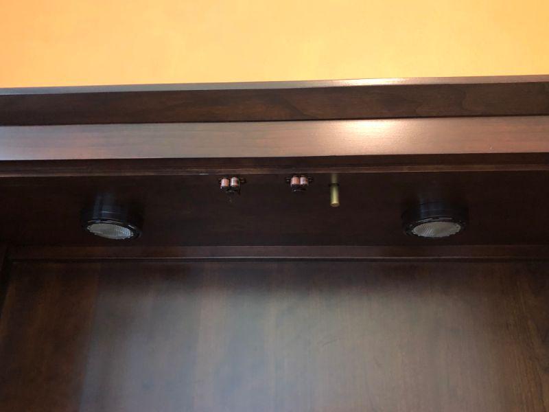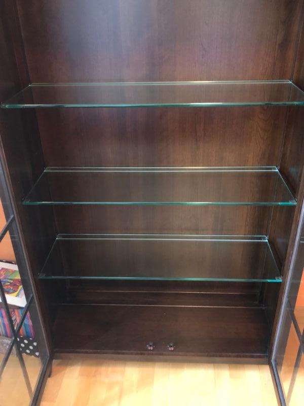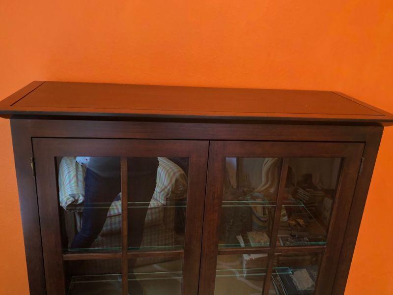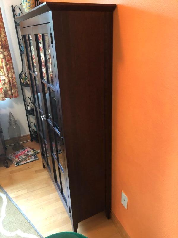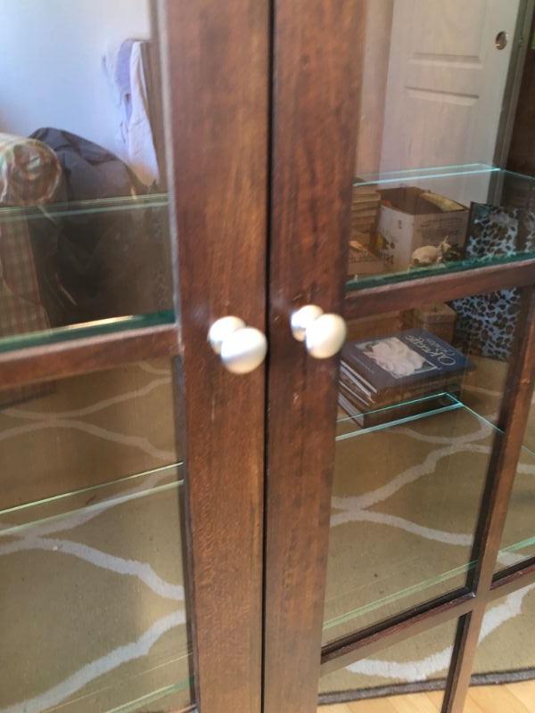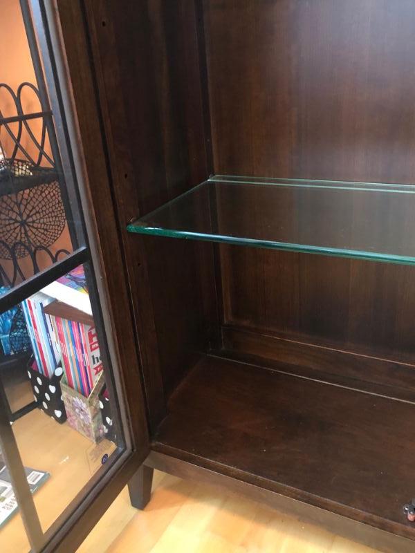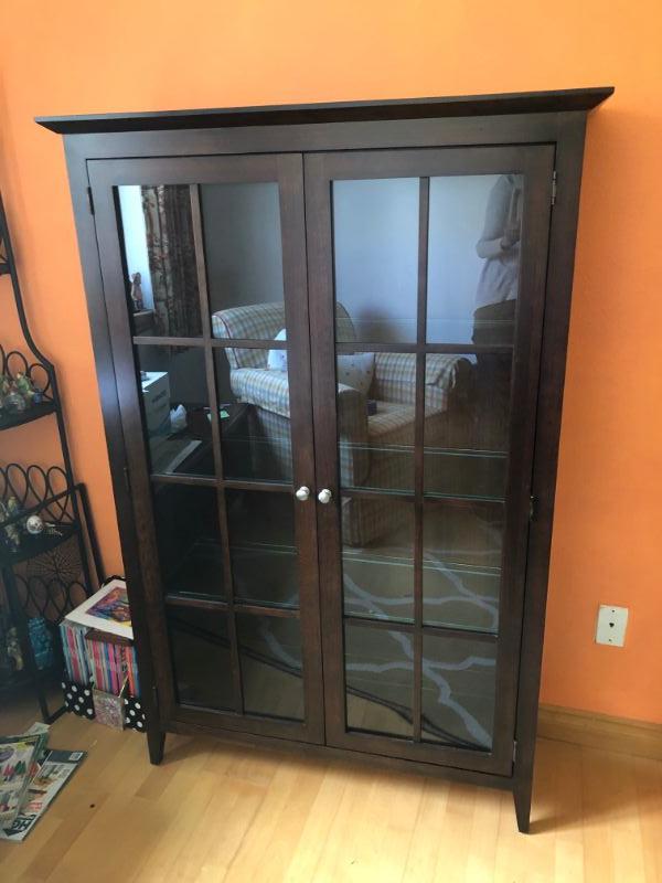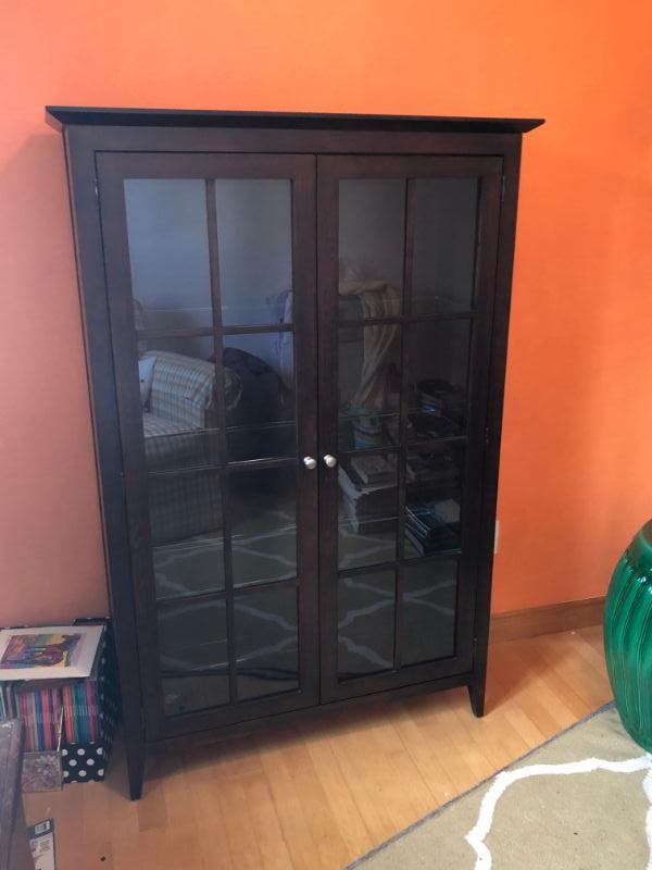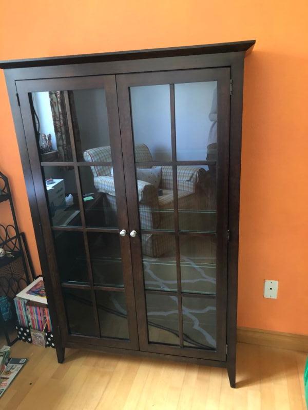 Beautiful espresso stained glass enclosed lighted cabinet. Very good condition (new bulbs needed)