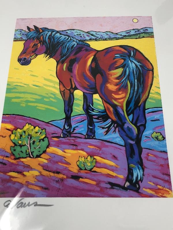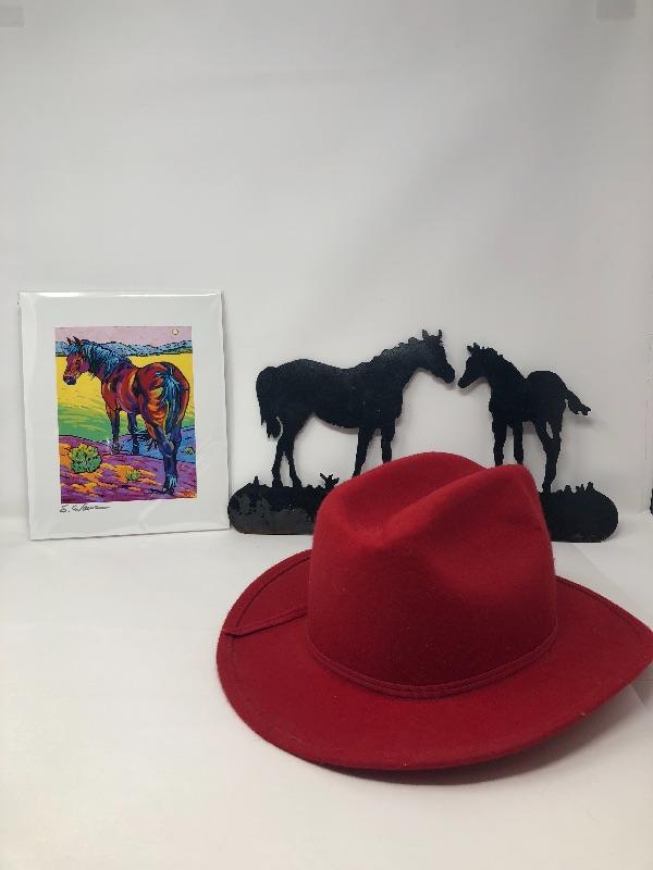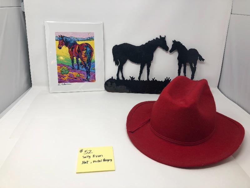 Dally C Evans Horse Print, Metal Horse Art, and John R Craighead Red Western Hat.