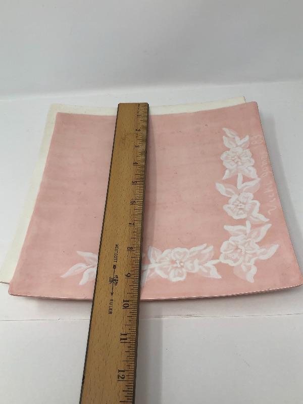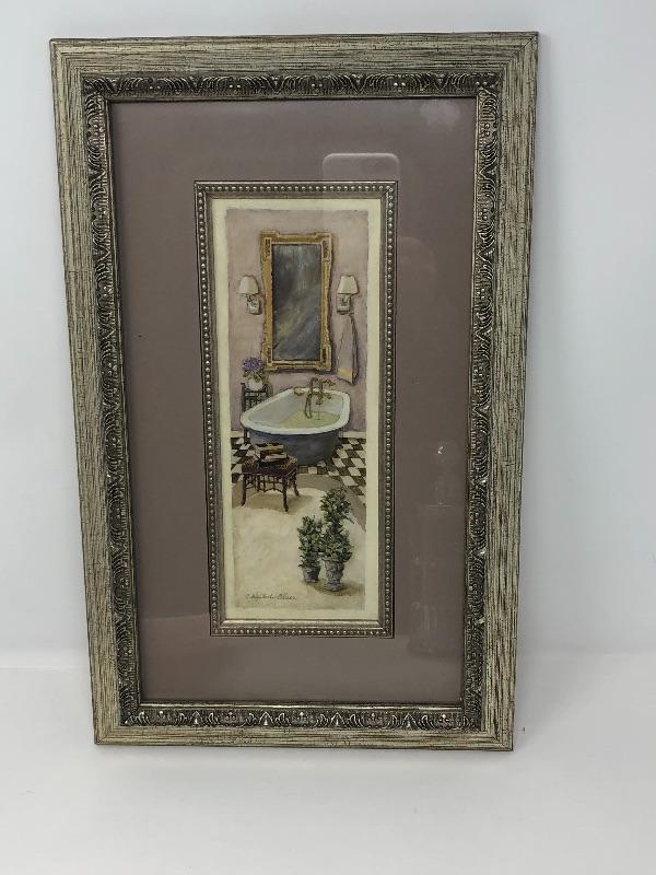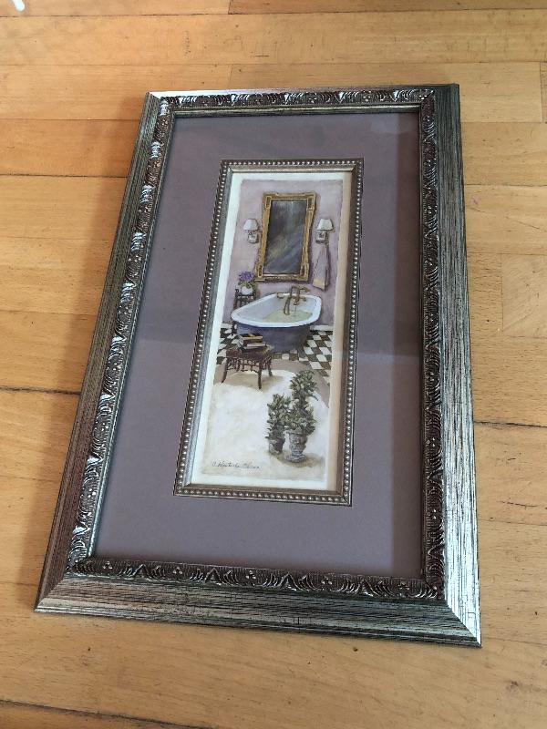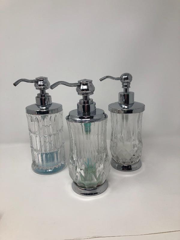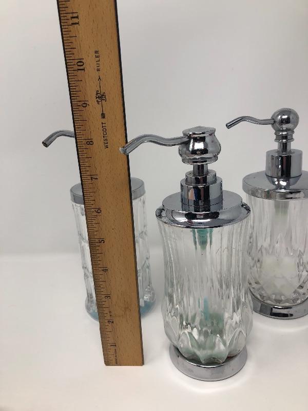 Three Glass soap dispensers, One ceramic Dish and one framed and matted wall picture. 16 x 10