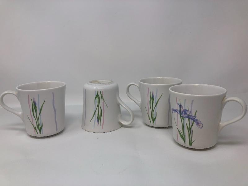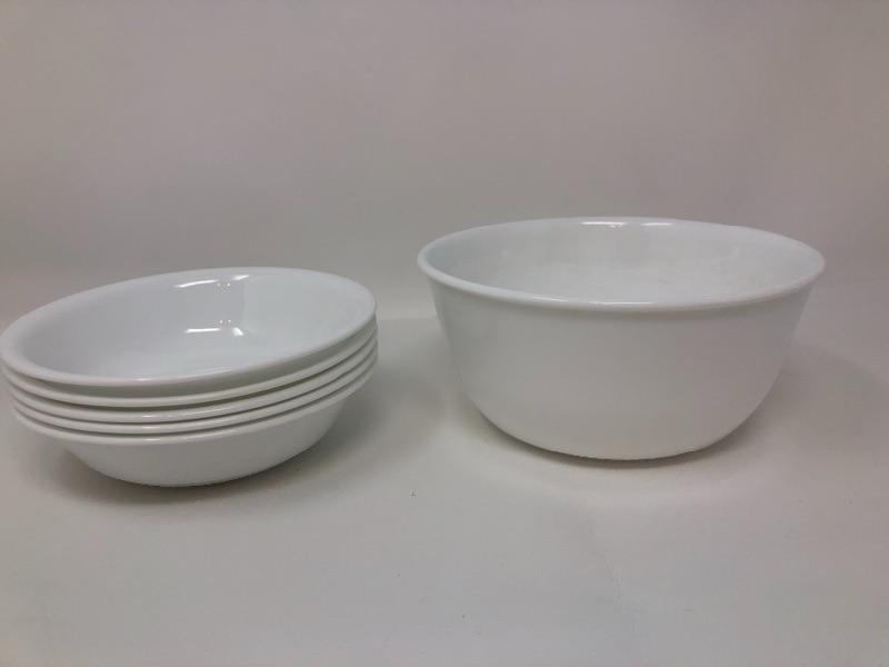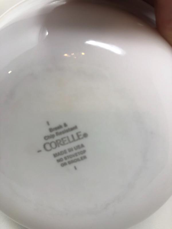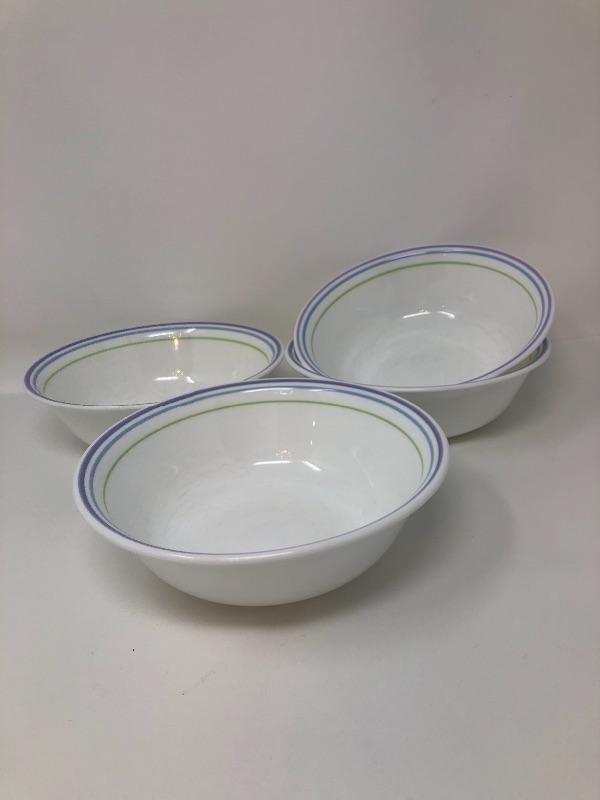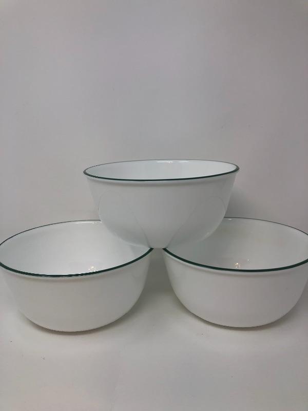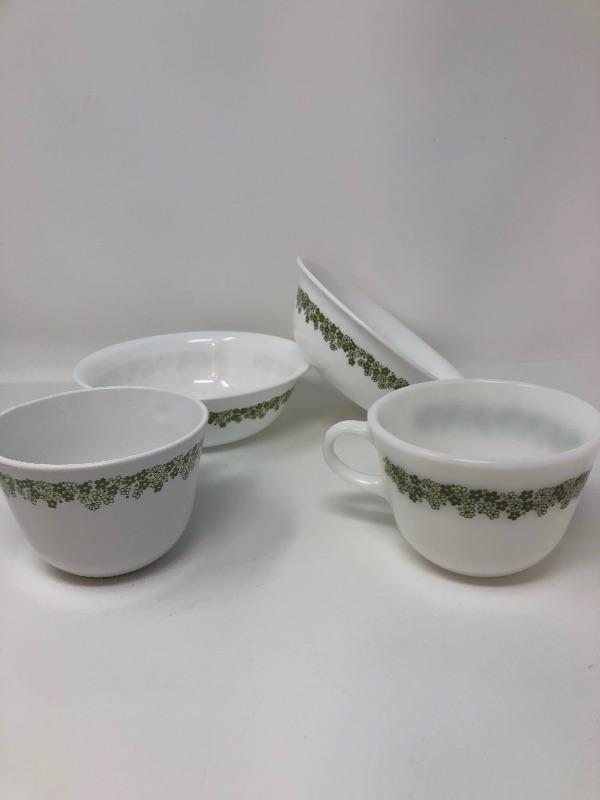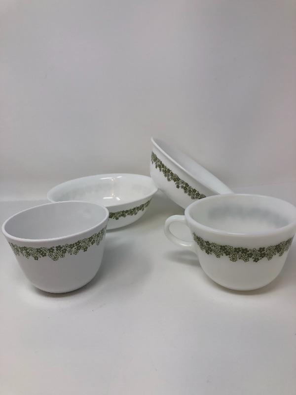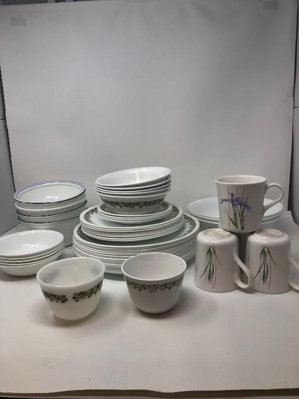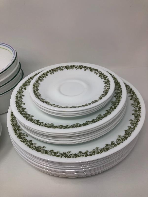 An assortment of Corelle Dishes. The green rimmed pattern comes with 16 large plates, 8 medium and 4 saucer, only two mugs.
