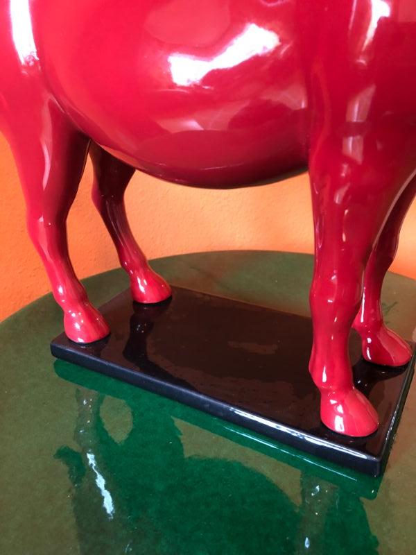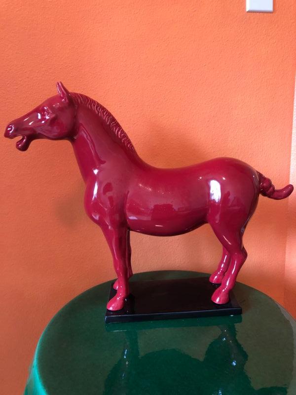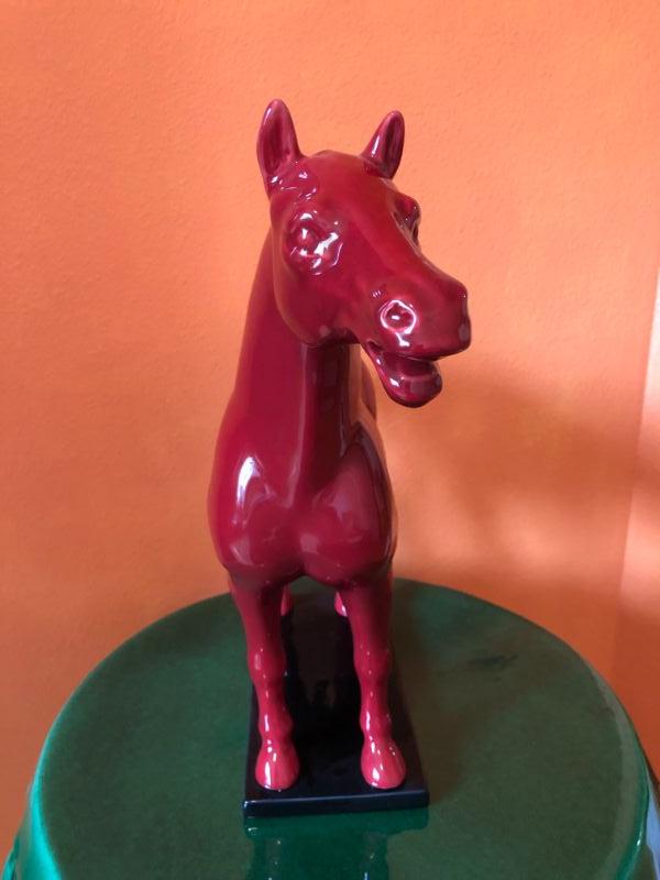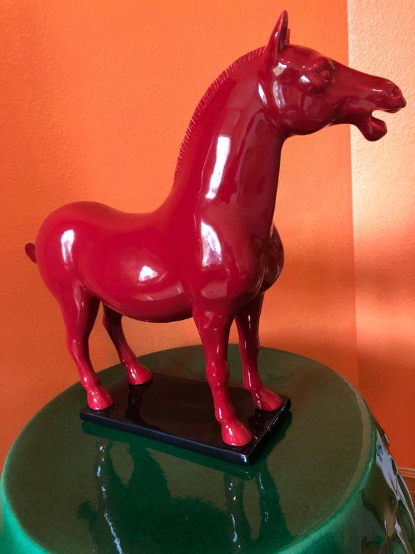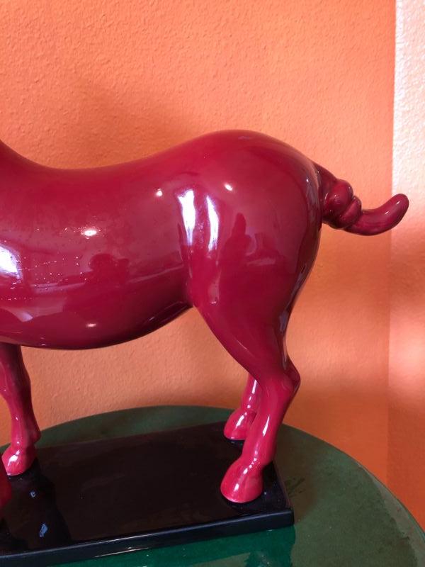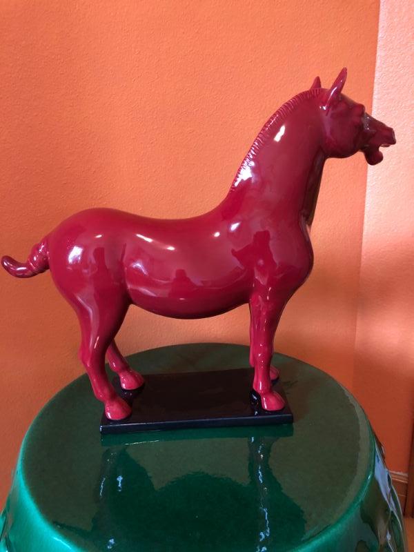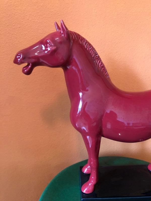 Glazed ceramic horse in cranberry color. with a black ceramic base.