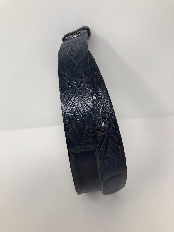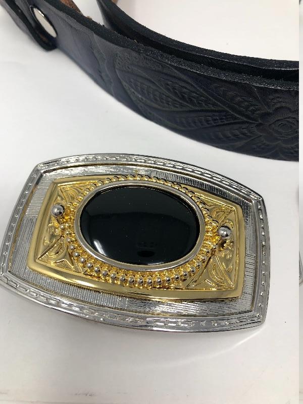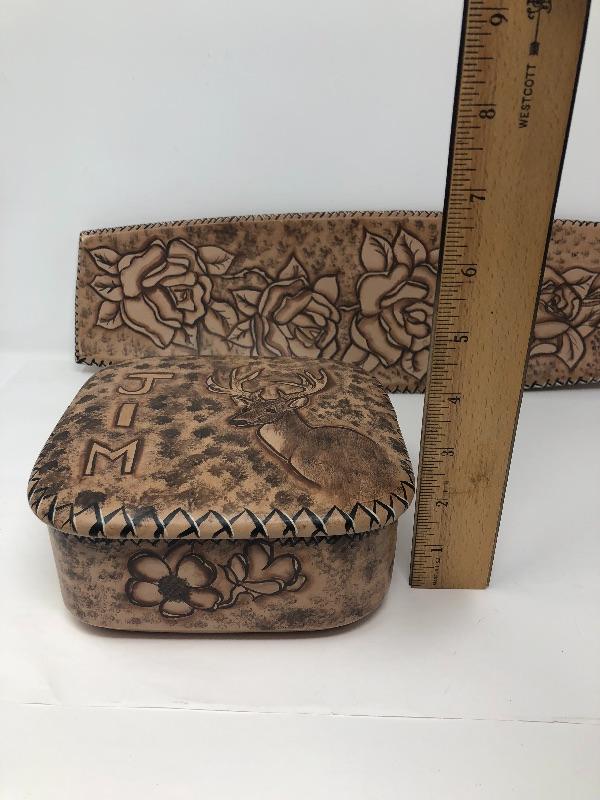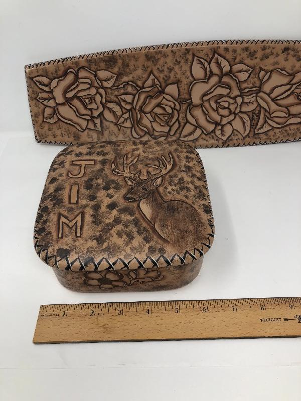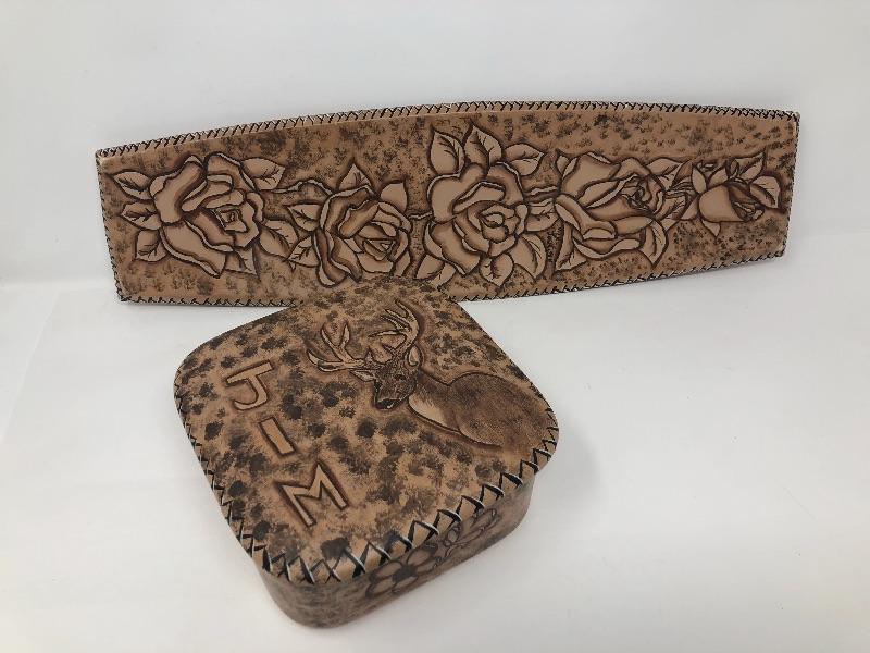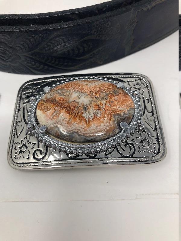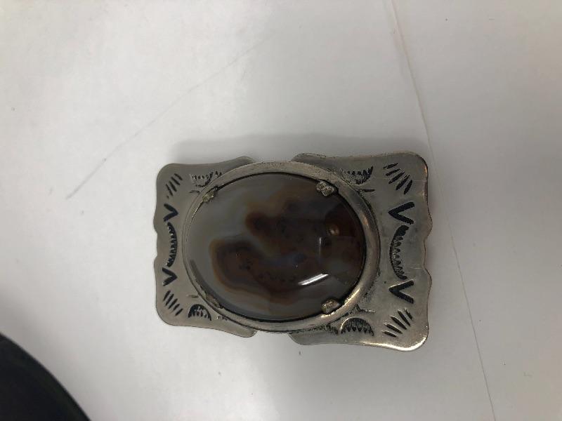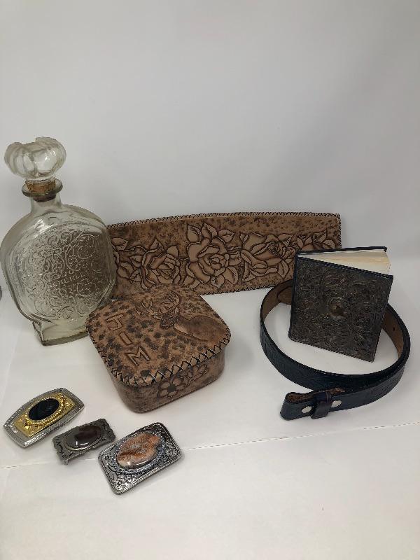Ceramic Tray and Trinket Dish (Jim) Leather belt with three hand crafted belt buckles with genuine natural stones. A vintage Schenley bottle and Leather bound address book.