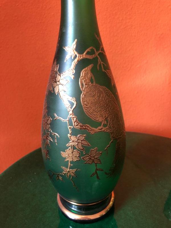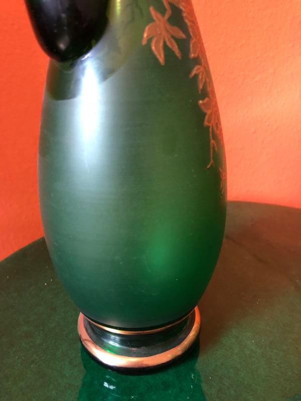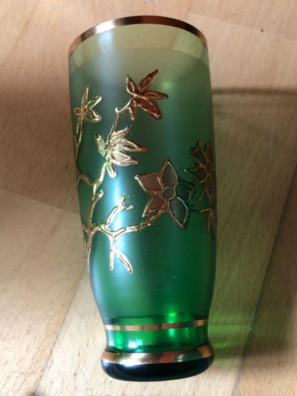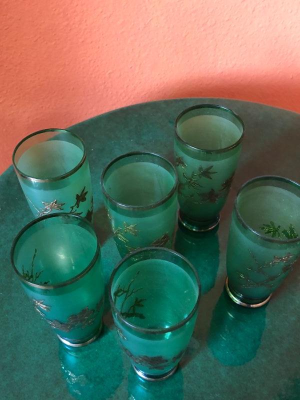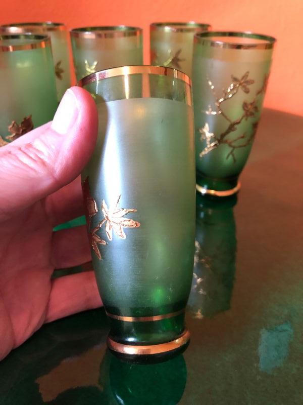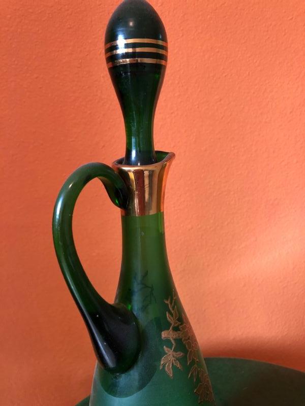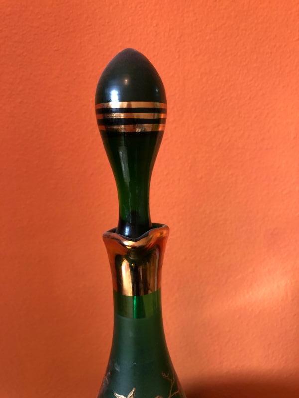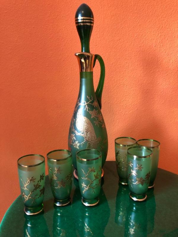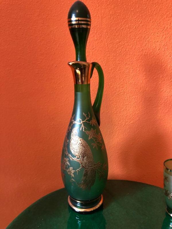 060:   Glass Bird Painted Mid Century Decanter with Six Glasses