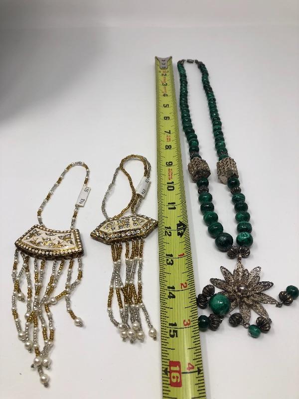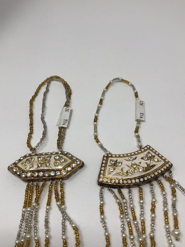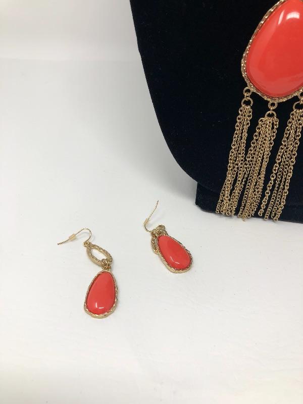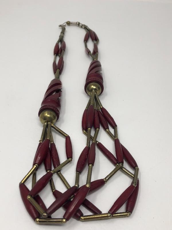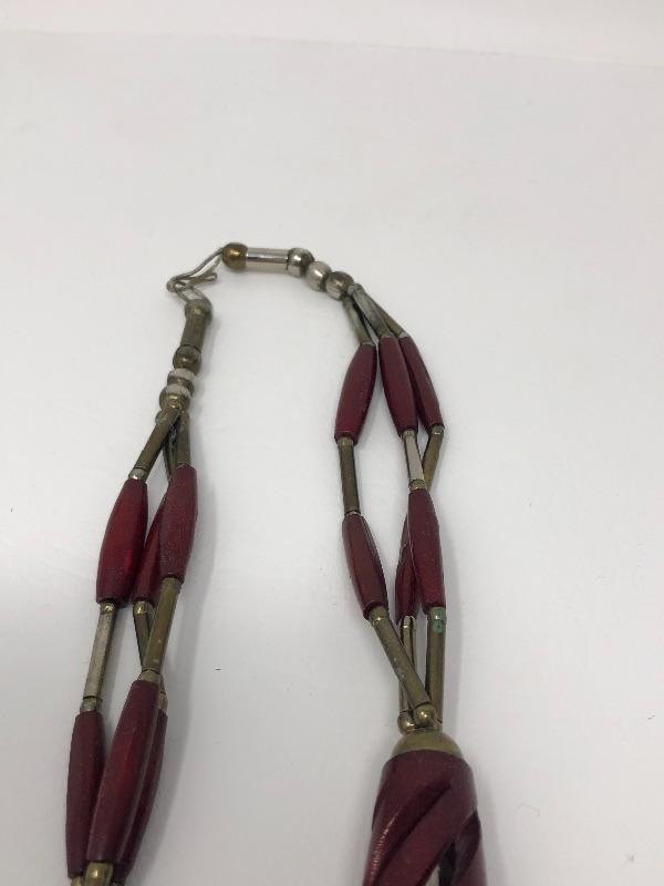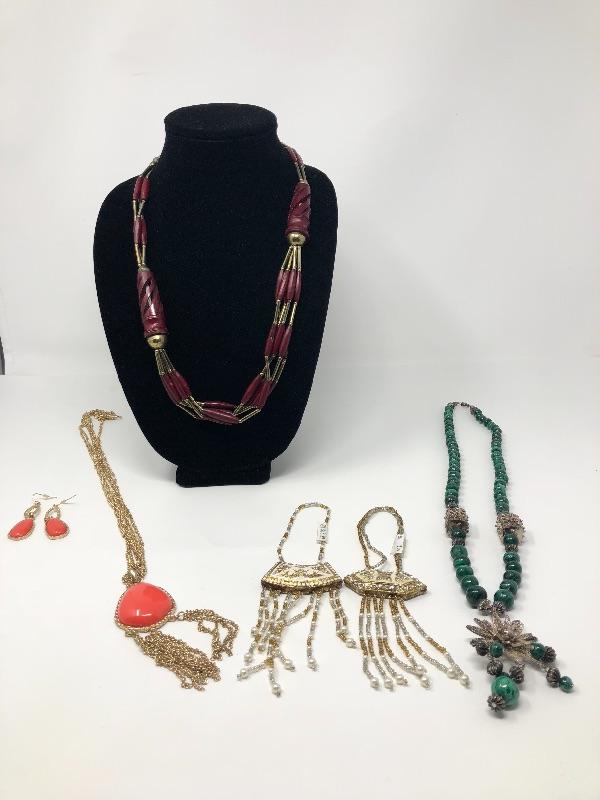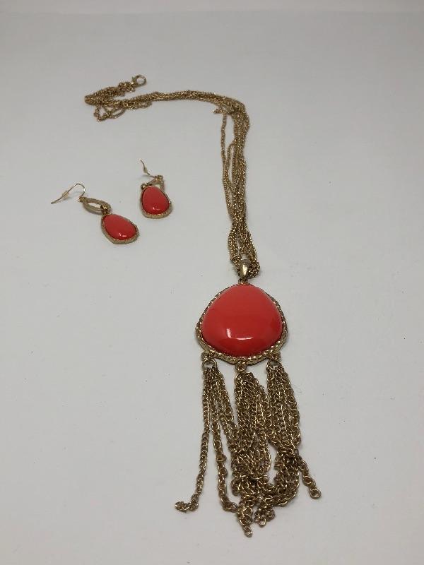 Bohemian style marooned wood and gold toned necklace, Gold toned apricot colored necklace and earring pair. Shoe adornments and turquoise beaded necklace.