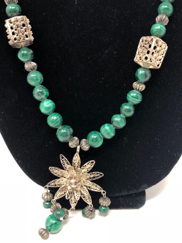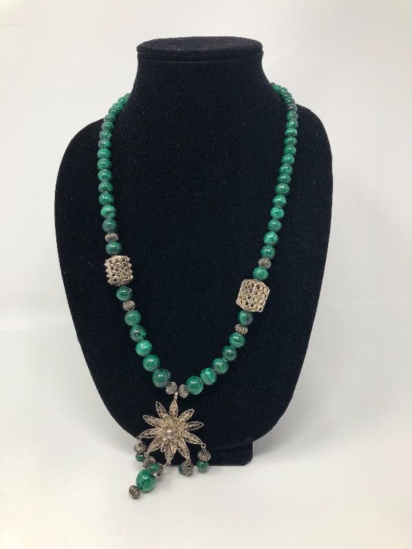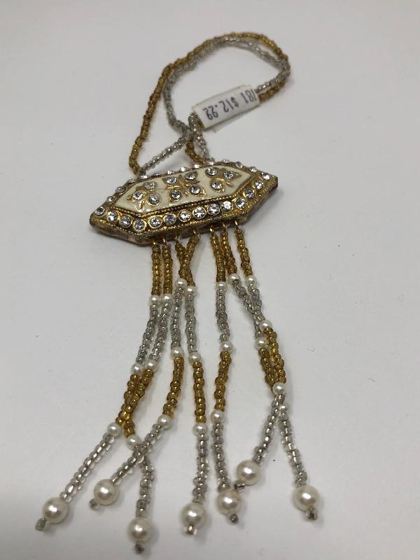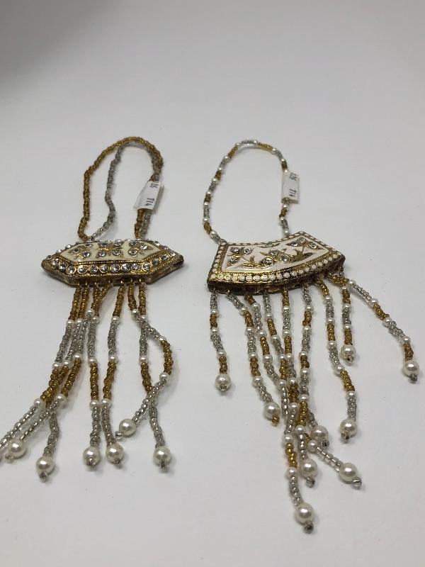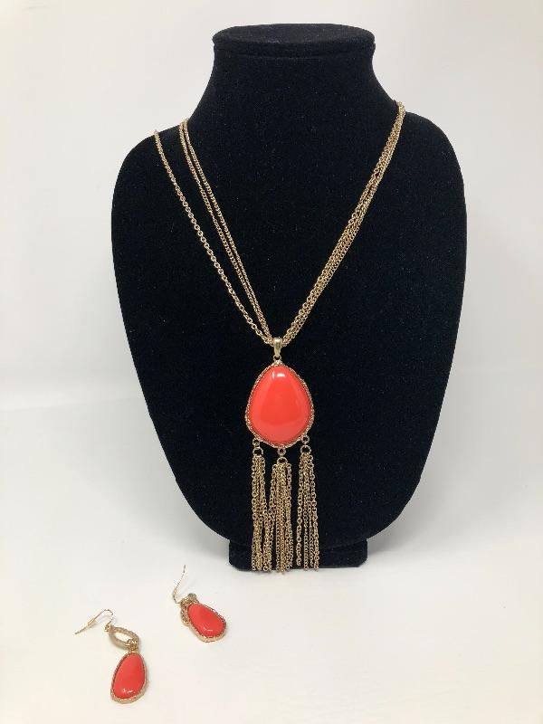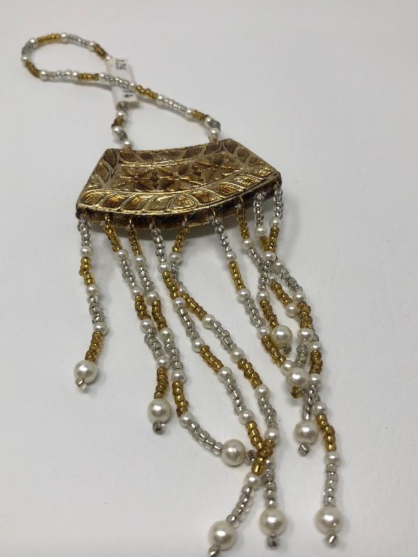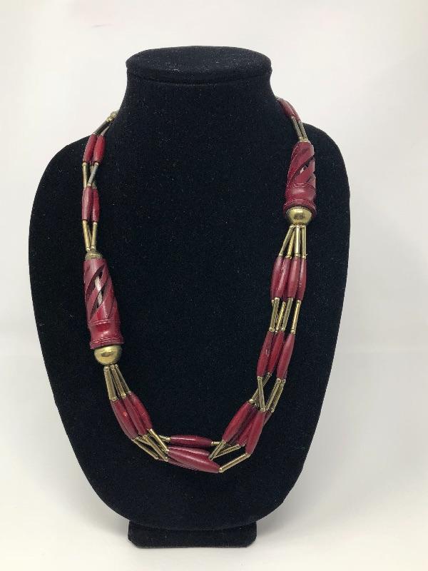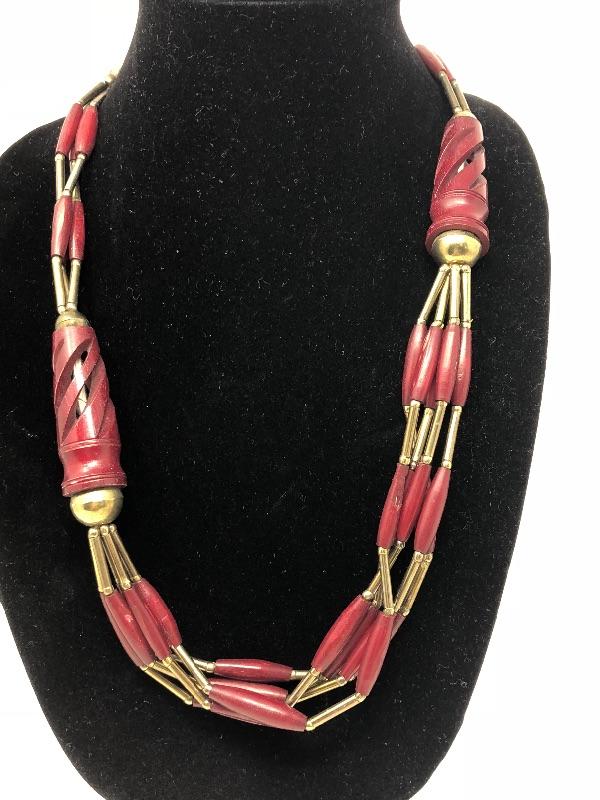Bohemian style marooned wood and gold toned necklace, Gold toned apricot colored necklace and earring pair. Shoe adornments and turquoise beaded necklace.