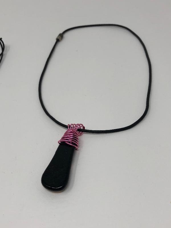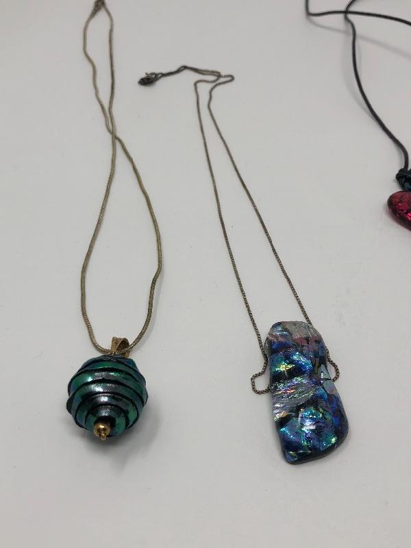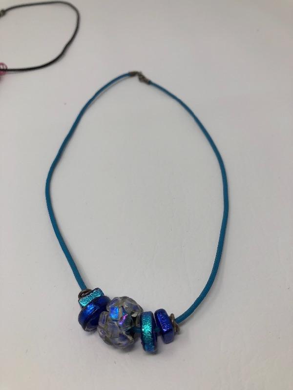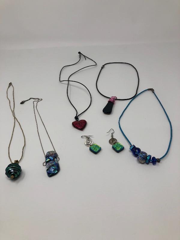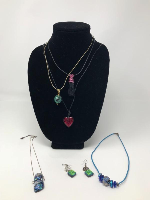 Five Necklaces and one pair of earrings. Glass and beaded material