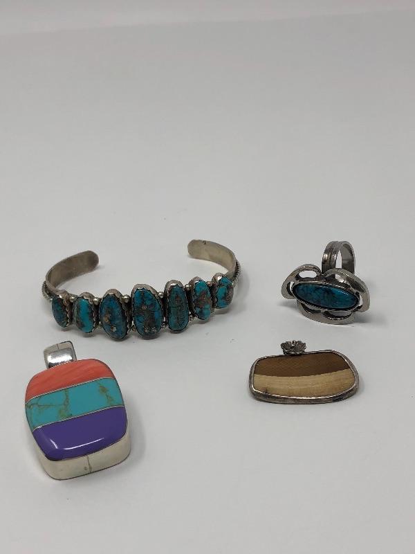 063:  Sterling Pendant, Turquoise Bracelet and Silver Toned Gem Stone Ring