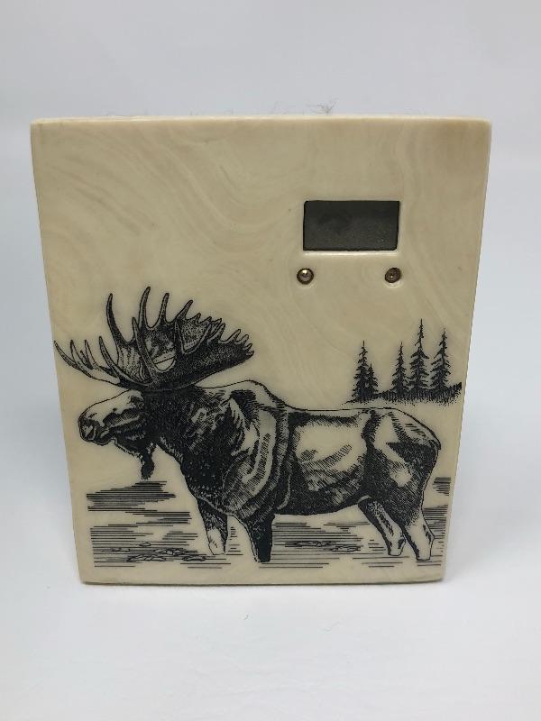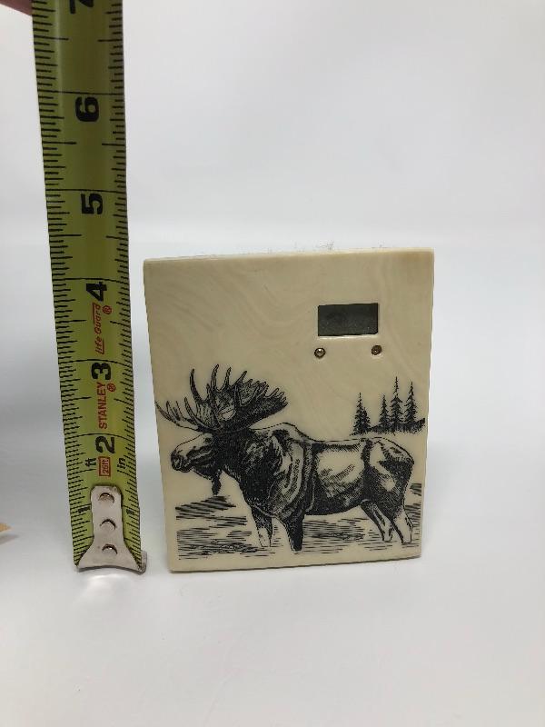 067:  Moose Stone Digital Clock, Bakelite Pin and Bracelet.