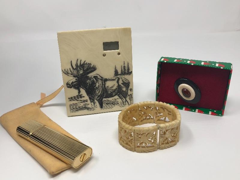 Moose Digital Clock (needs batteries) Bakelite Pin in box, Bakelite elastic bracelet and vintage capri what appears to be a spray bottle unsure if it is a lighter.