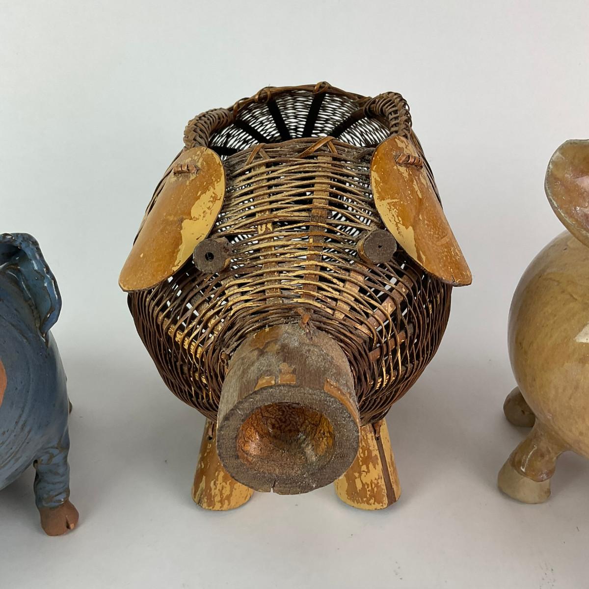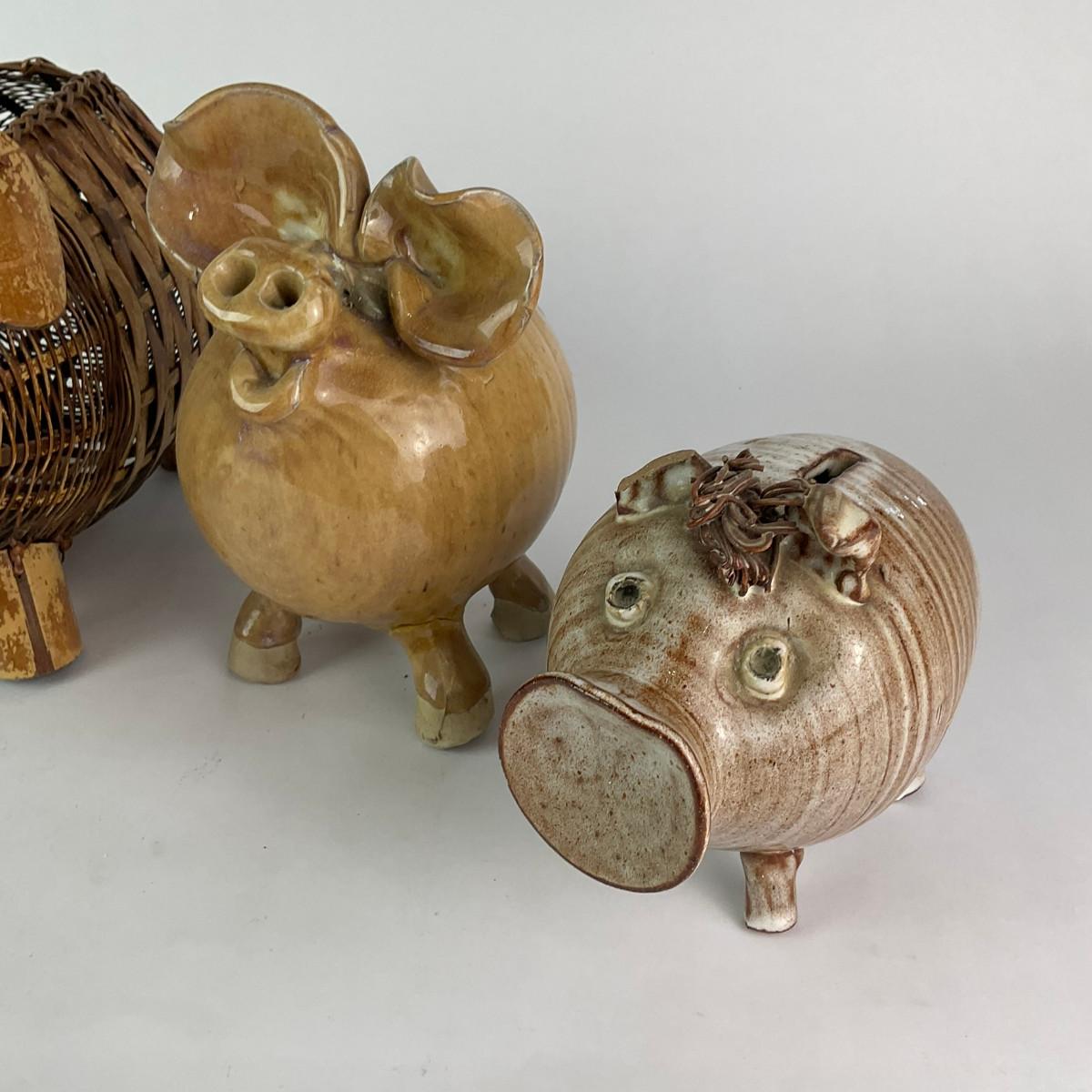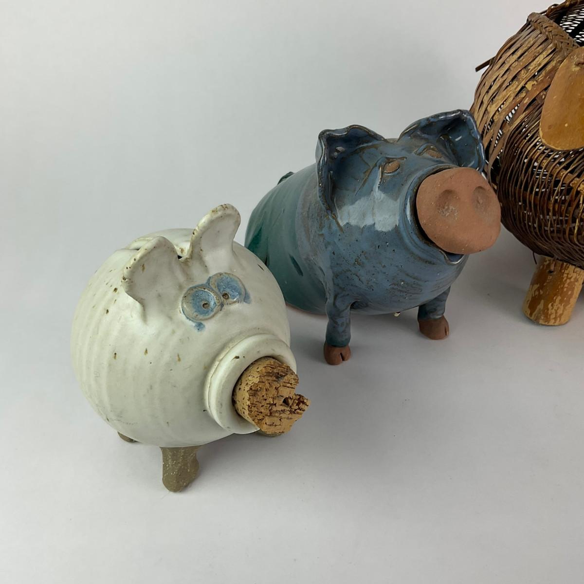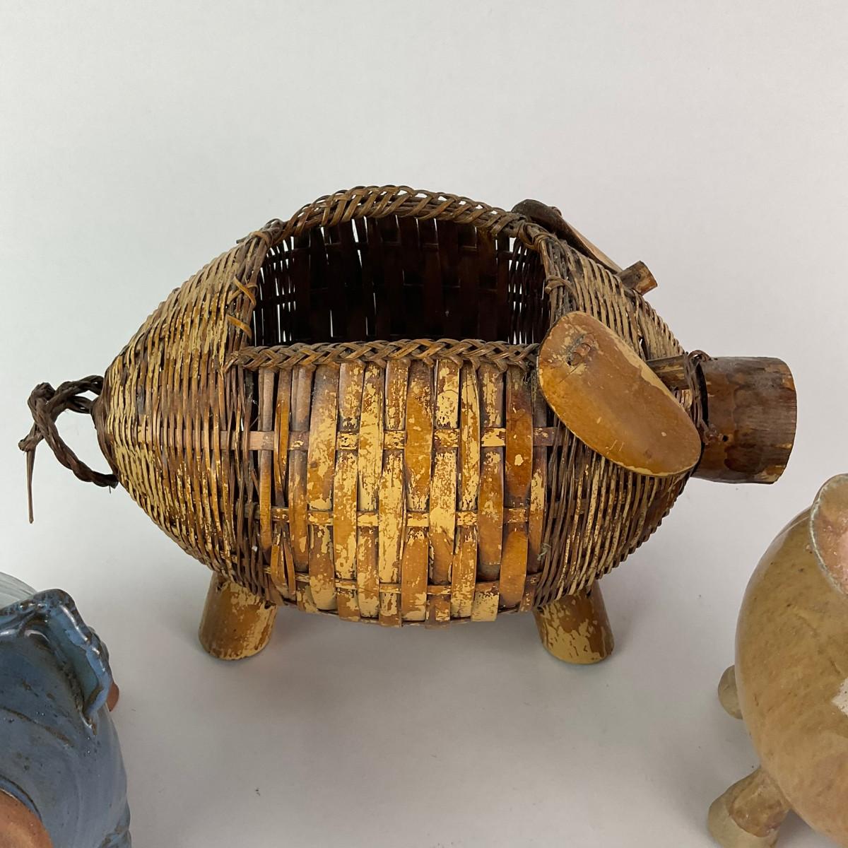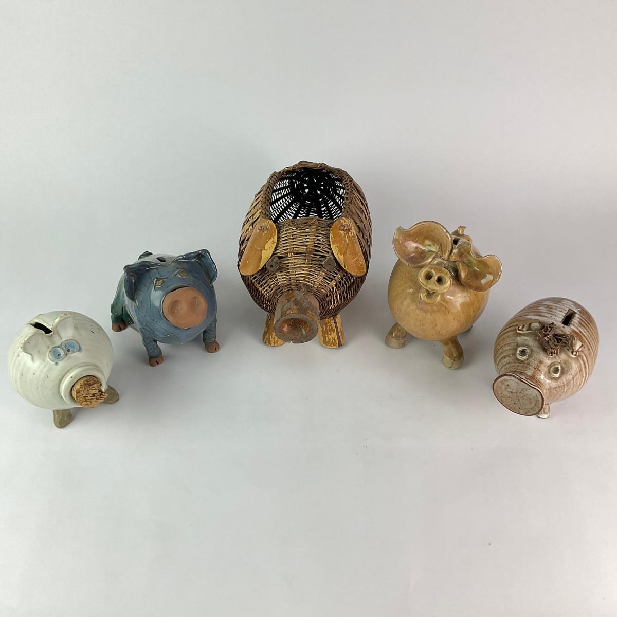 Four Pig Banks, One wicker piggy basket