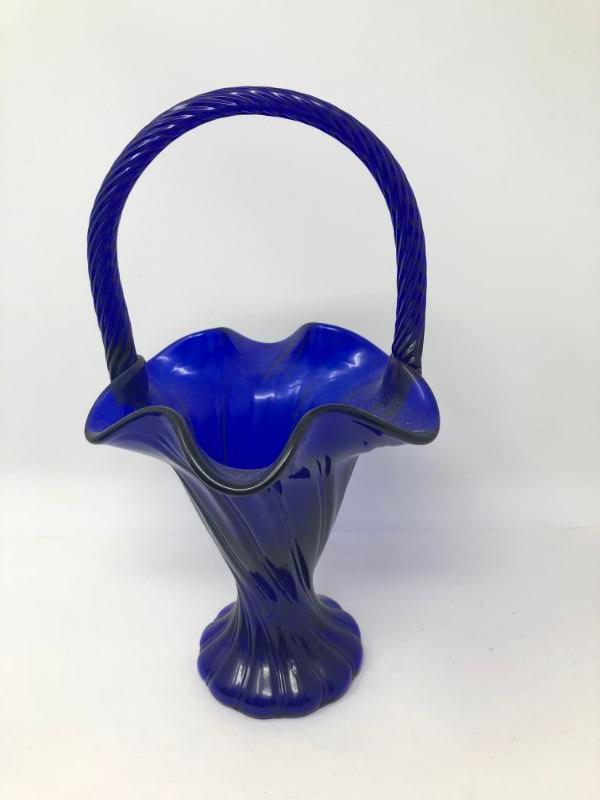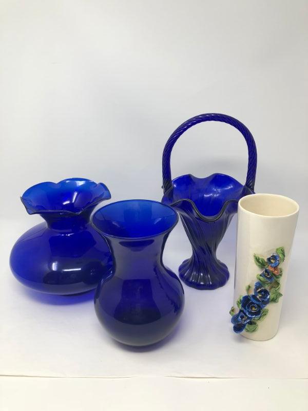 077:  Fenton Blue Cobalt Basket Vase and other Assorted  Vases