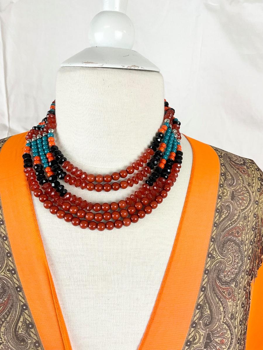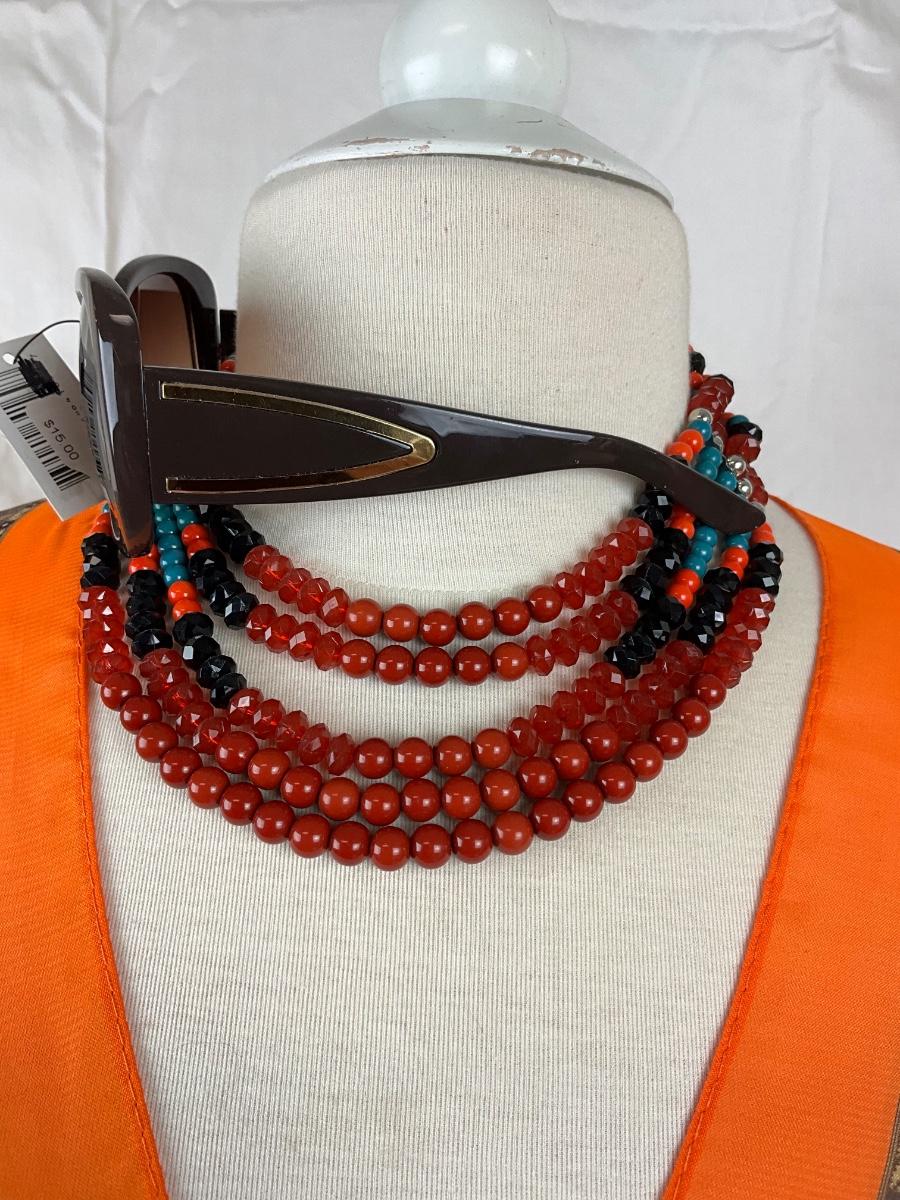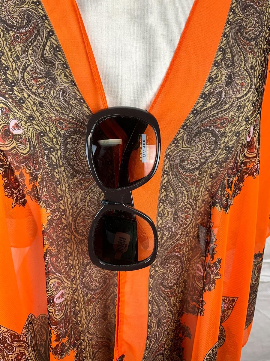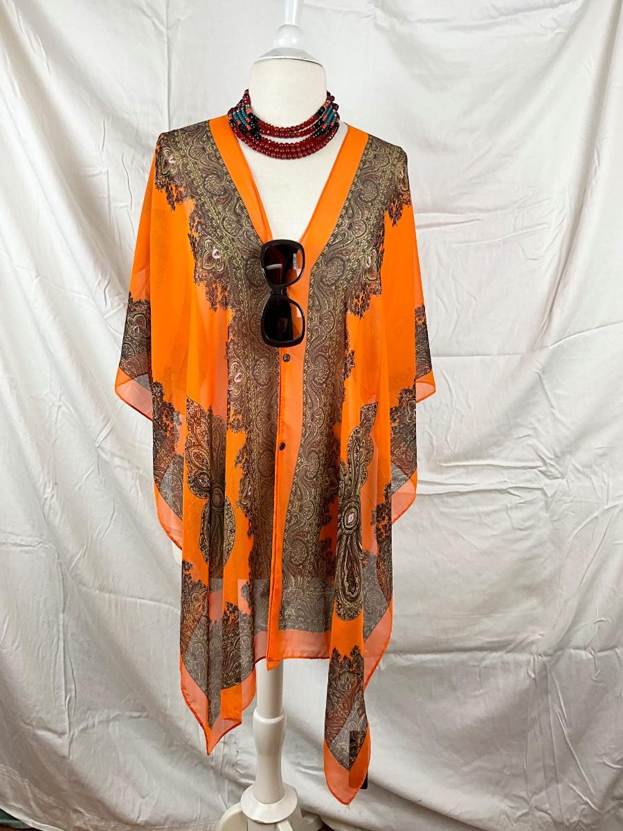Orange paisley cape/shawl ($40) beaded layered necklace ($25) black UV protective sunglasses ($15). All items are brand new from a retail store closure.