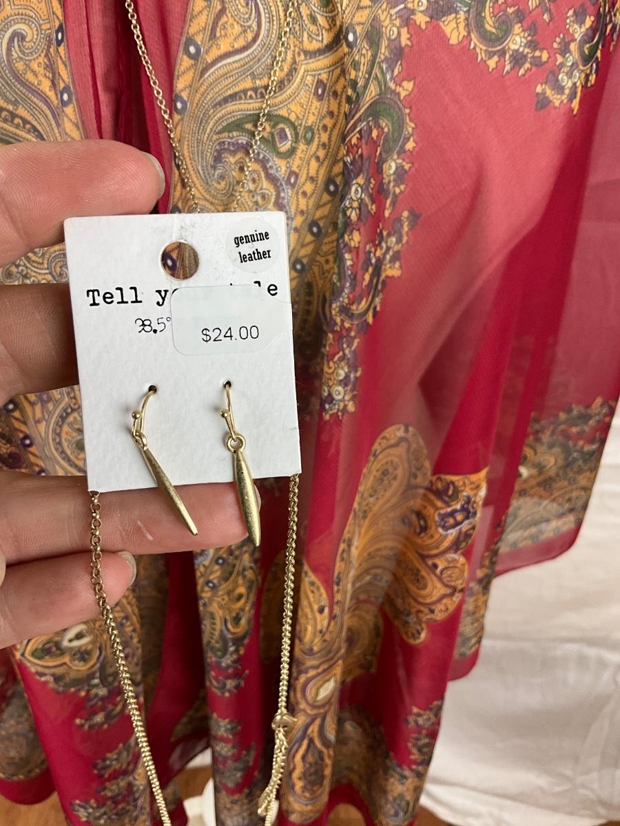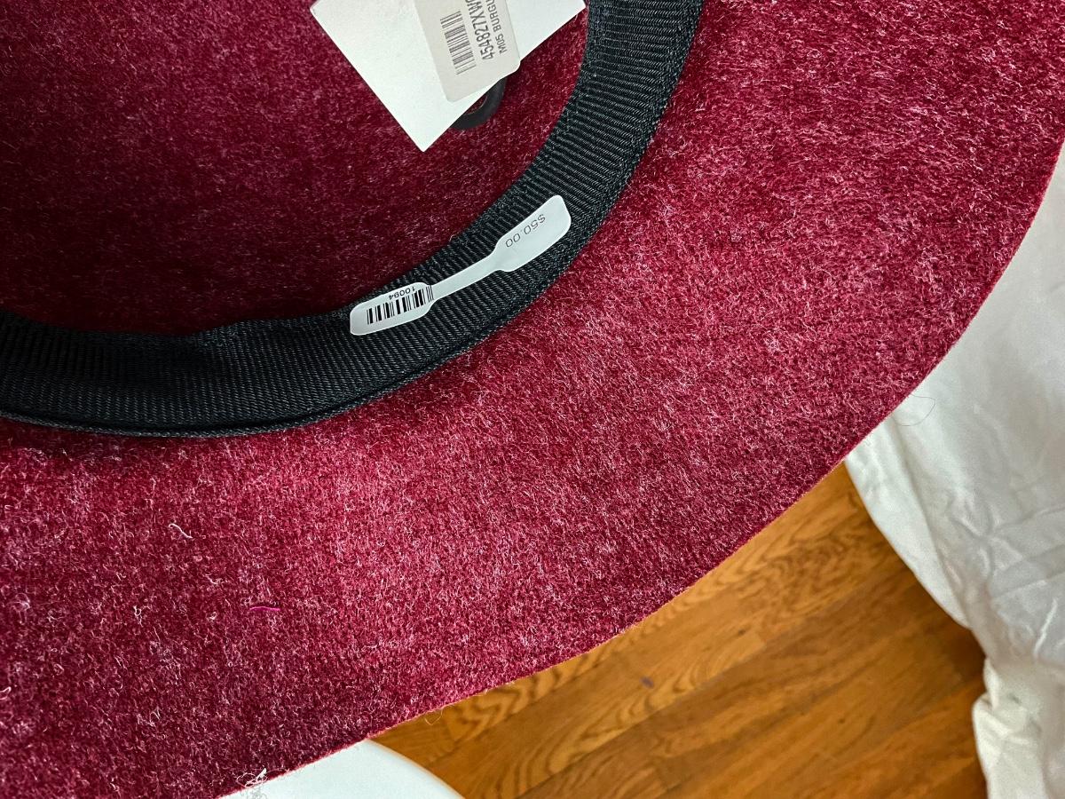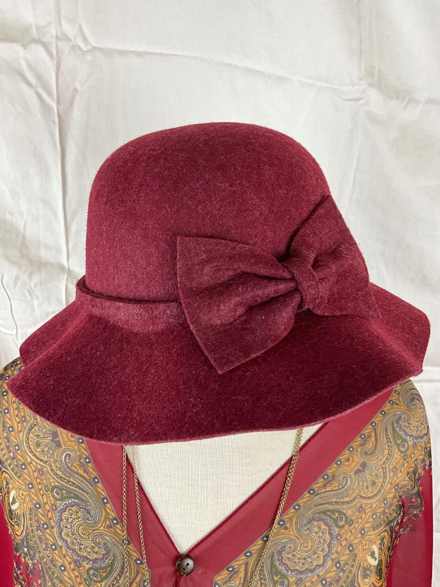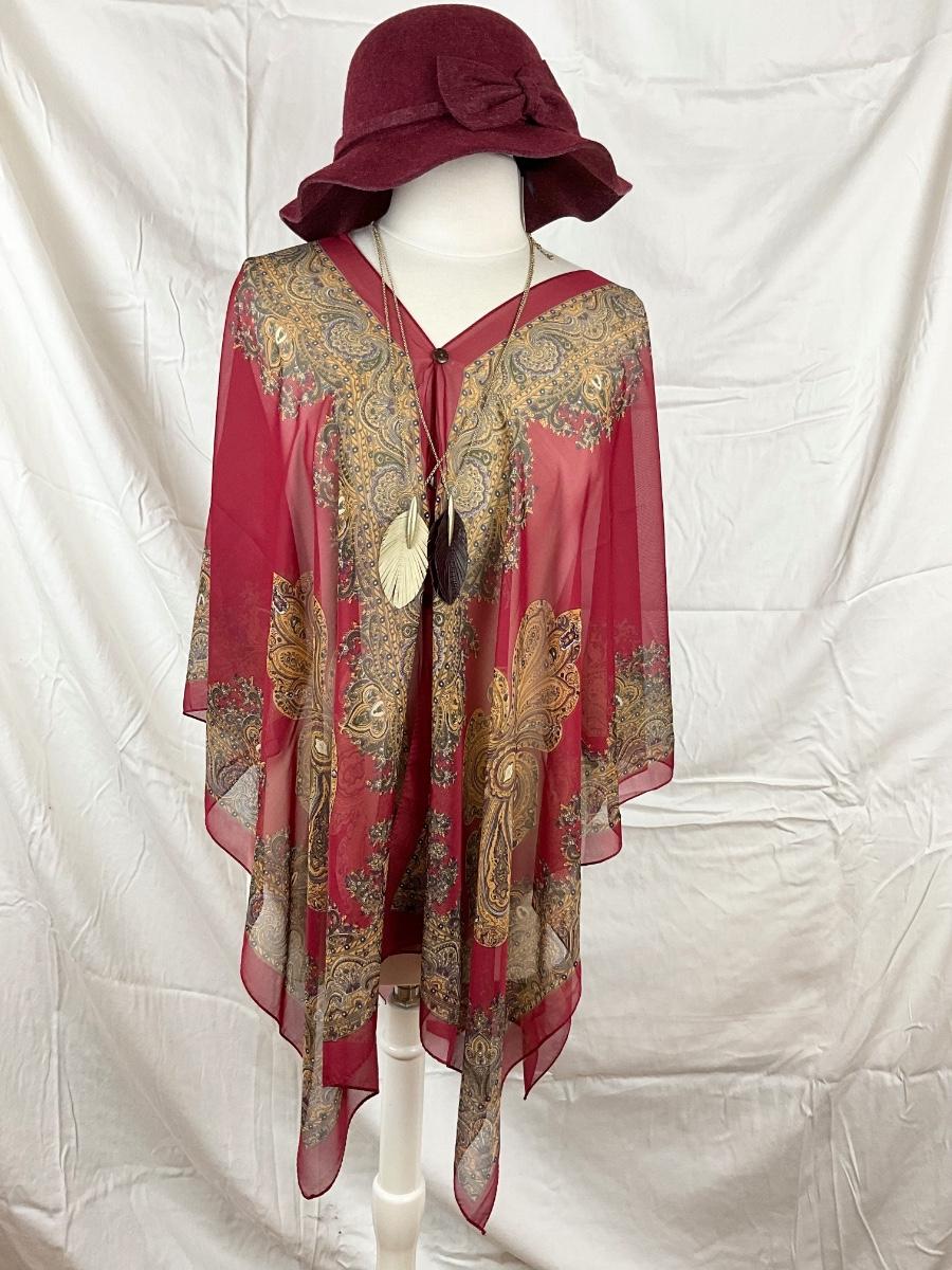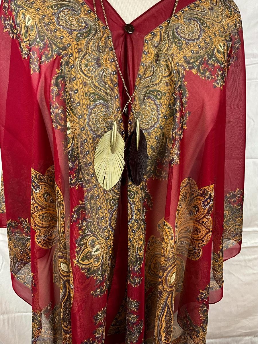 Lot contains red paisley sheer bathing suit cover up ($40) felt burgundy ruffled edge bucket hat ($50) 2 feather necklaces ($20 each) and earrings.