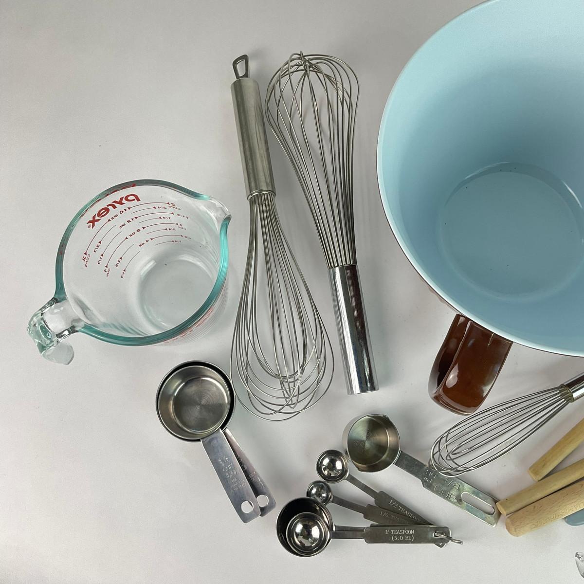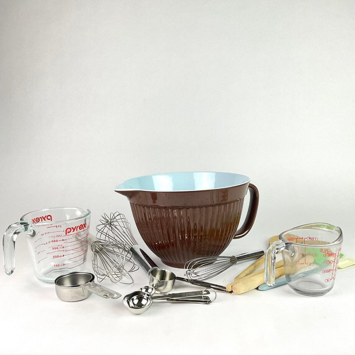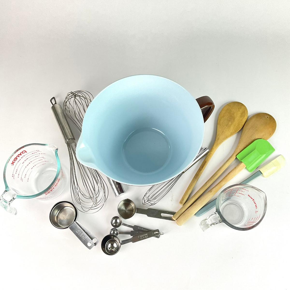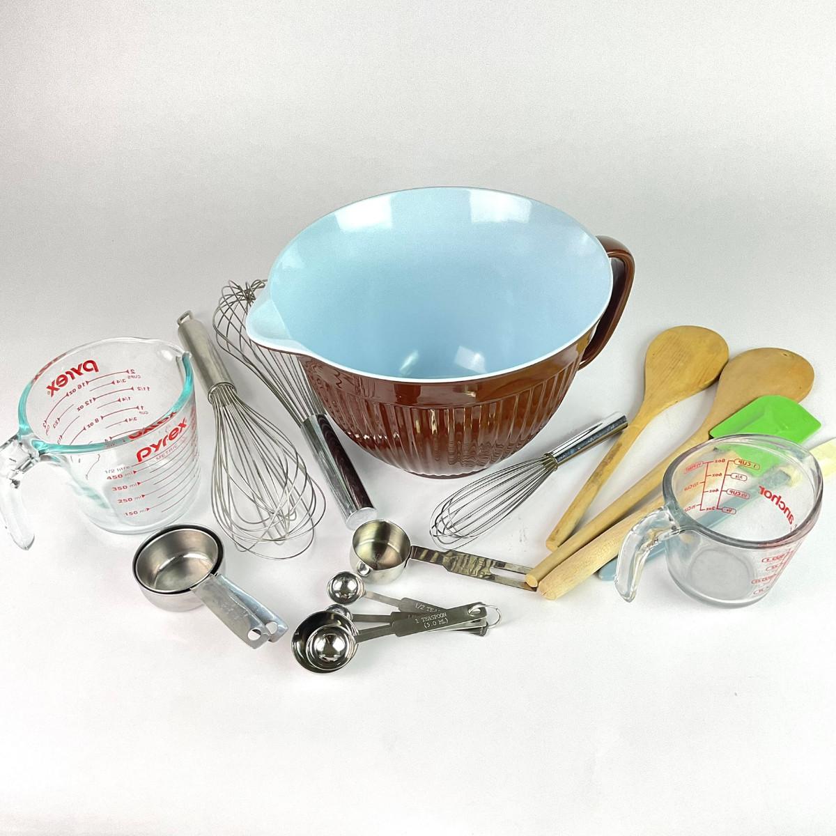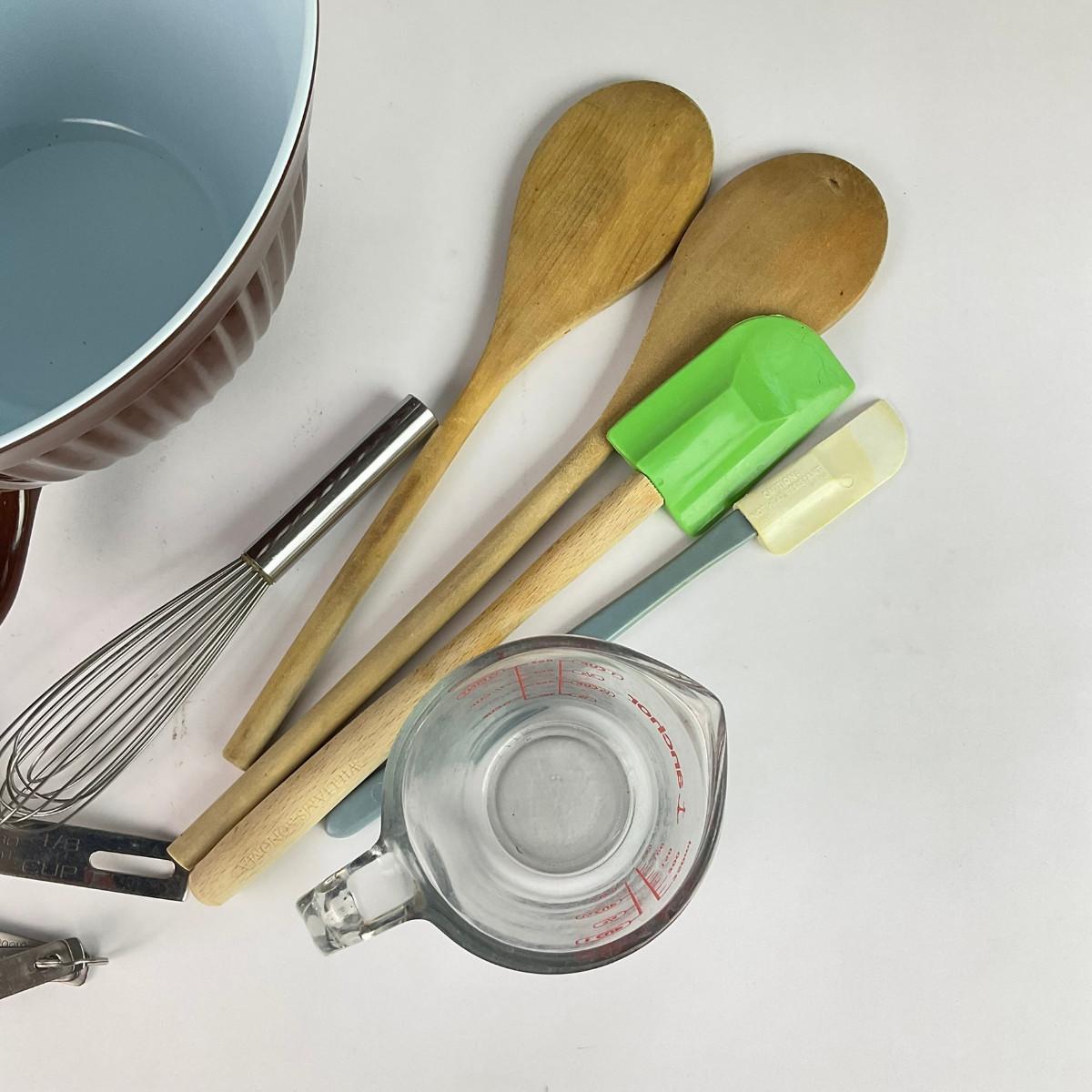 Large plastic mixing bowl, Pyrex measuring cups, whisks, wooden spoons, scrapers, measuring utensils