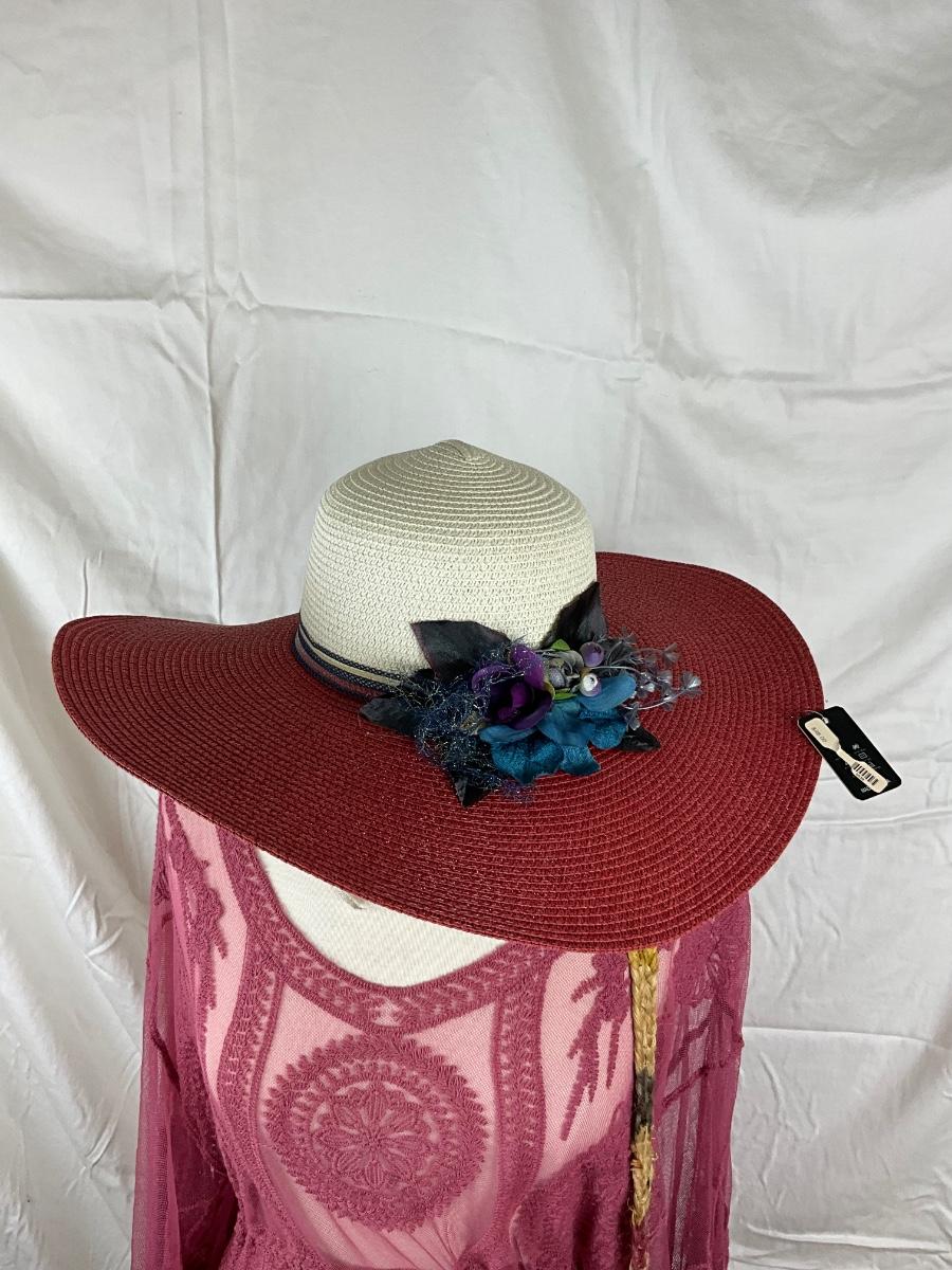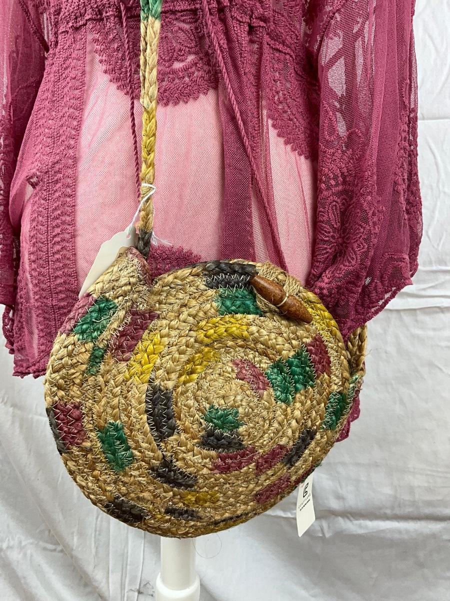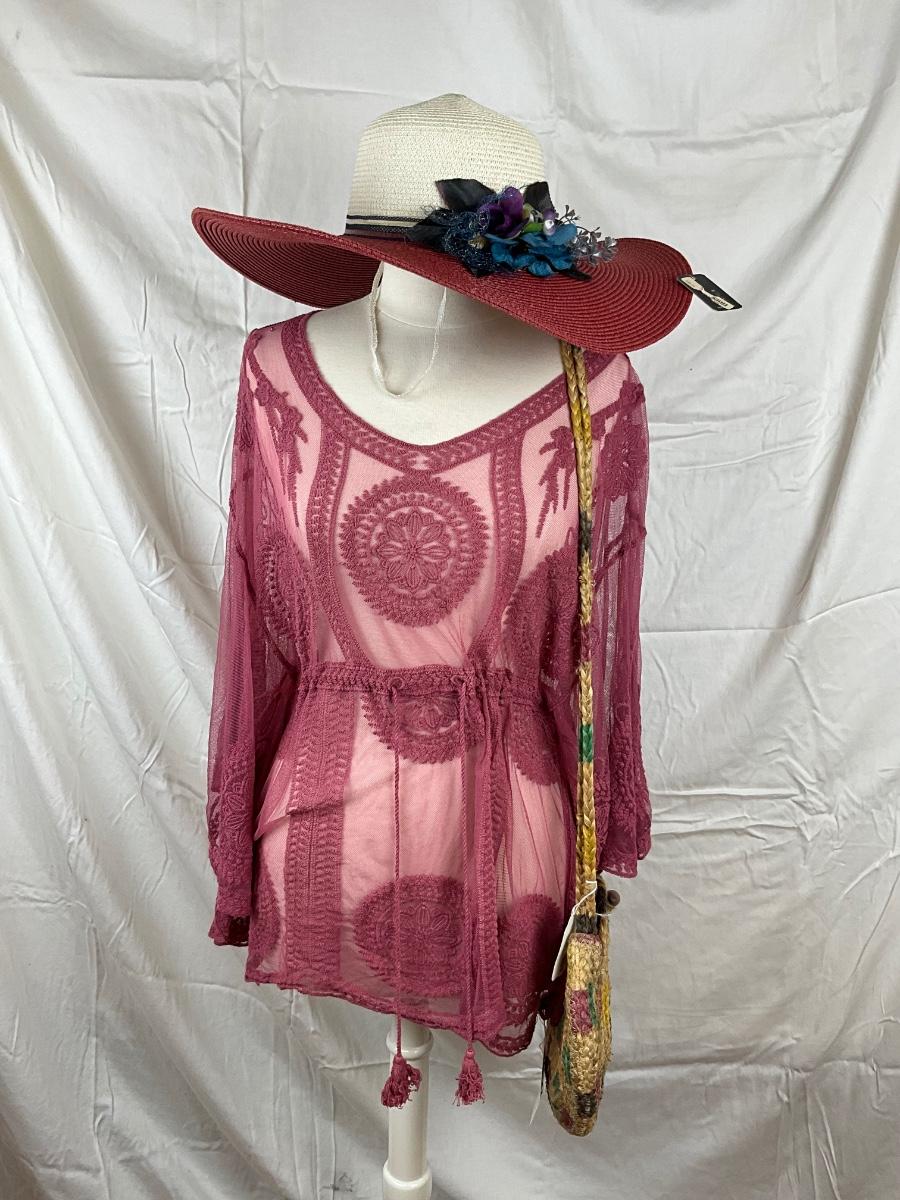 088 Rose Colored Cover Up with Straw Hat and Round Jute Handbag