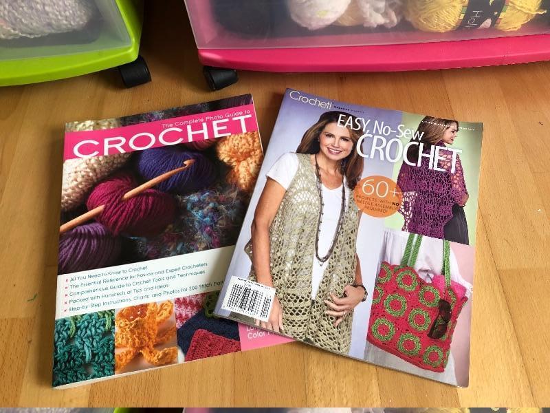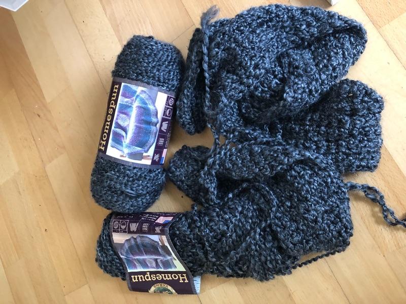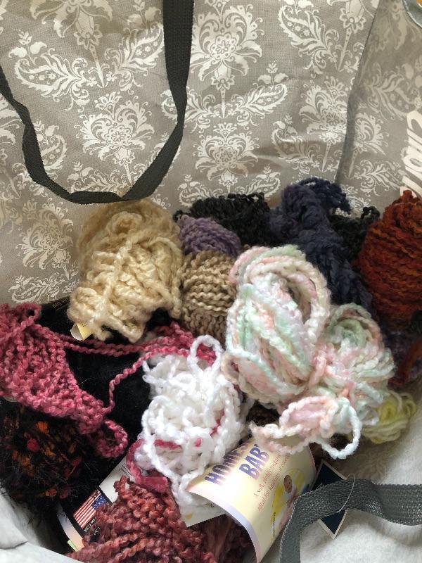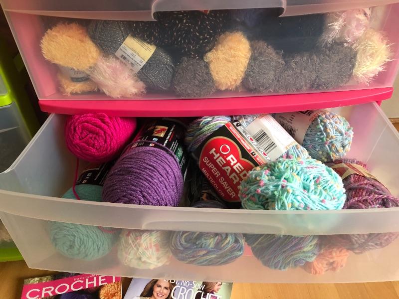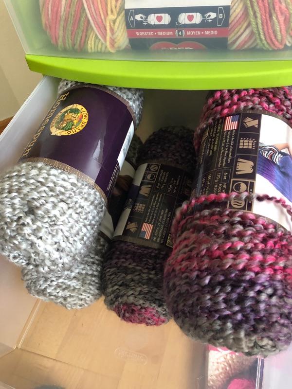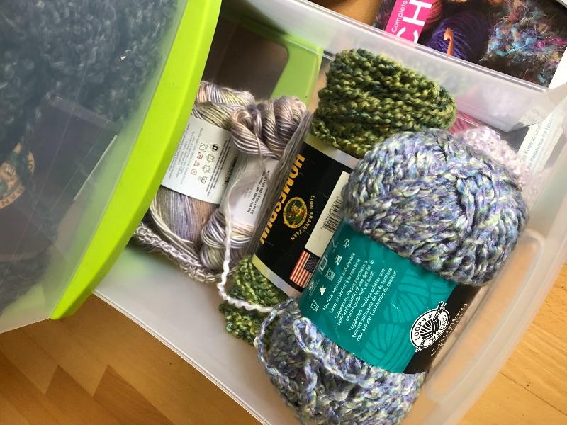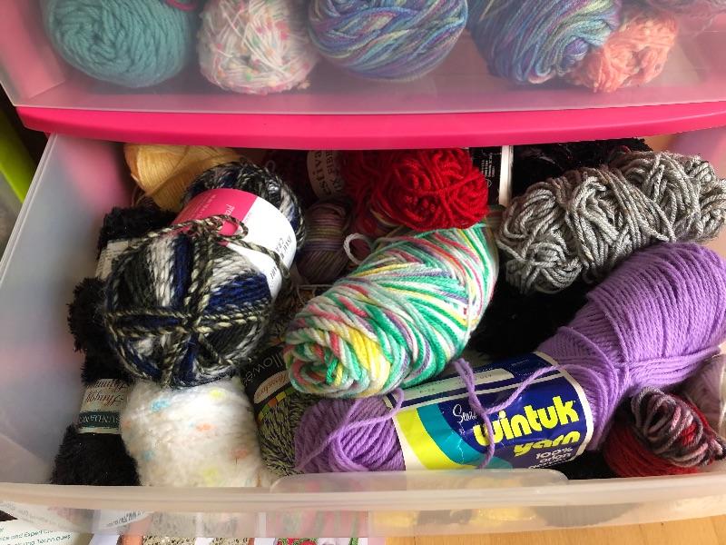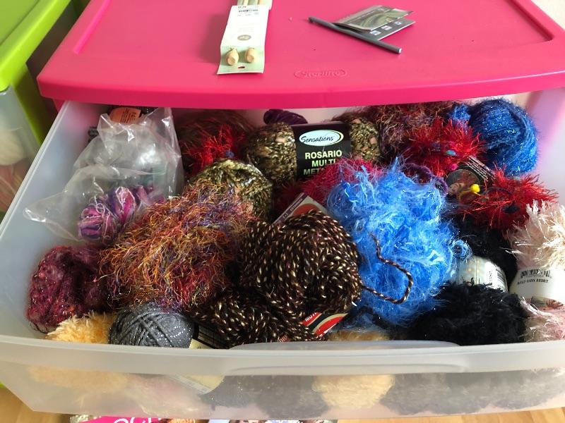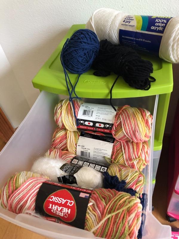 One wide roller bin full of yarn and green bin full too.