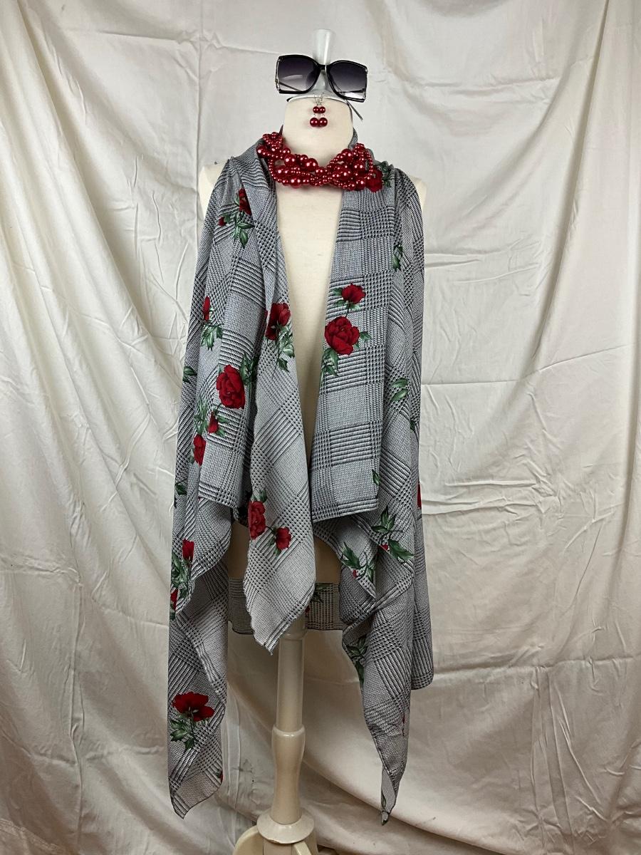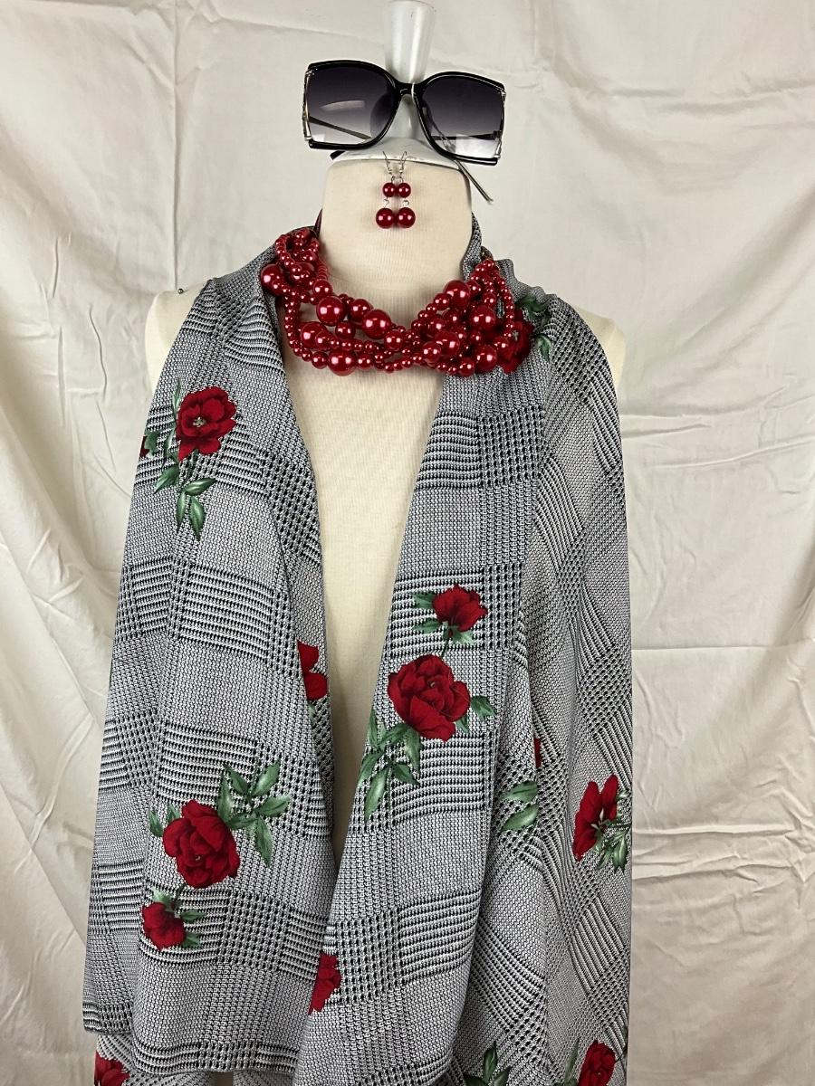 094 Black and White with Red Rose Shawl with Red Beaded Necklace, Earrings and Sunglasses