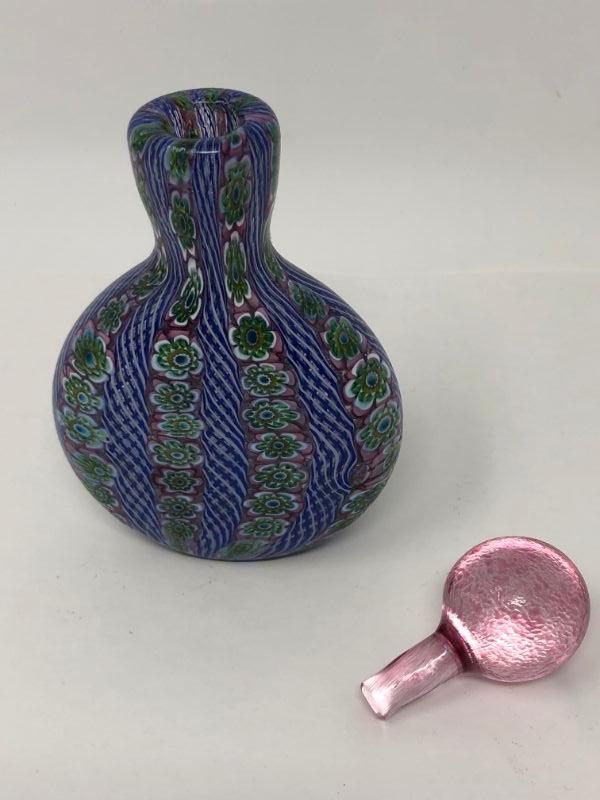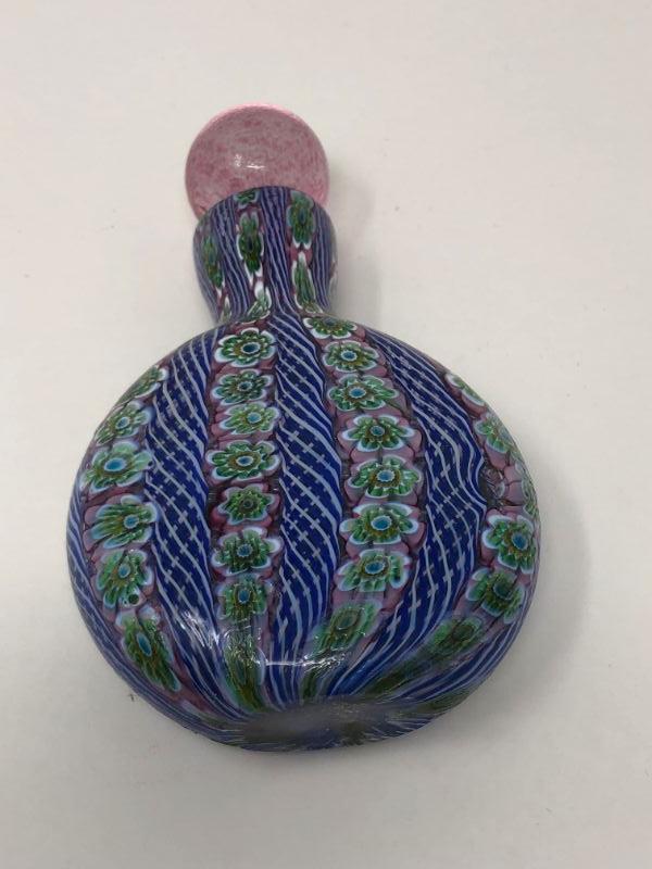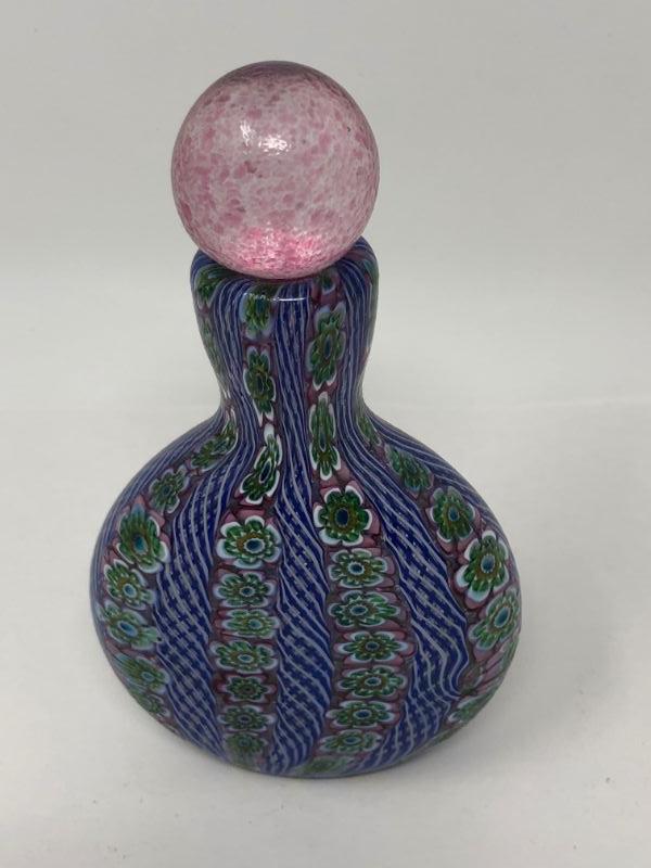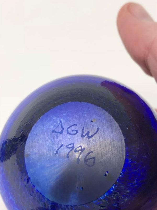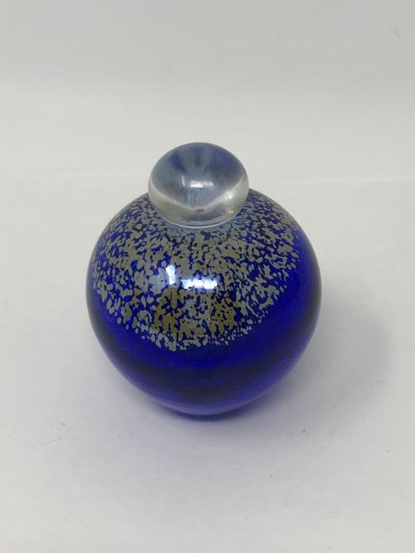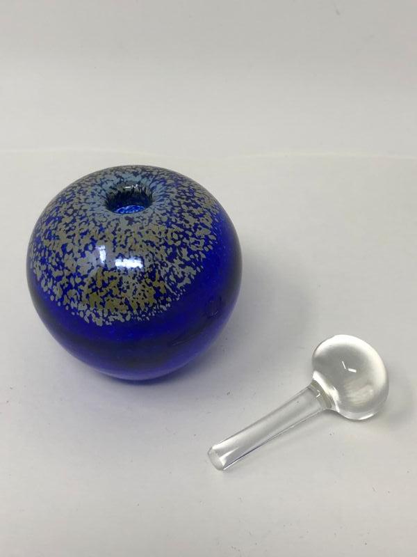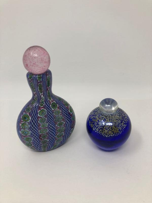 Two Glass Perfume Bottle Paperweights. 1996 (signed DGW) Blue Round 2 inches Tall and Bluegreen Pattern 5.5 inches Tall