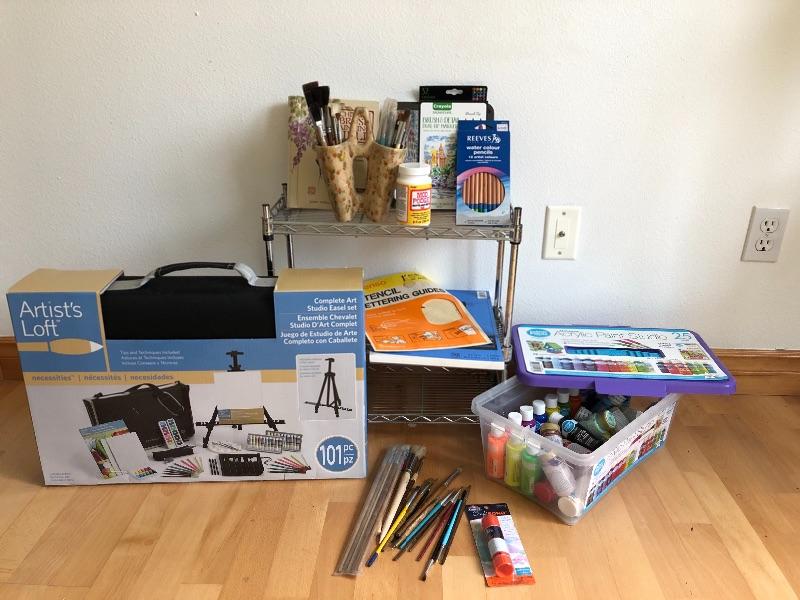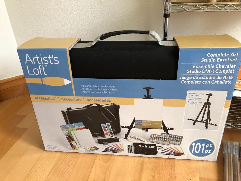 Artists Loft new in box easel and painting accessories. A box full of acrylic paints, several paint brushes, professional markers/colored pencils and other crafting items. See photos.