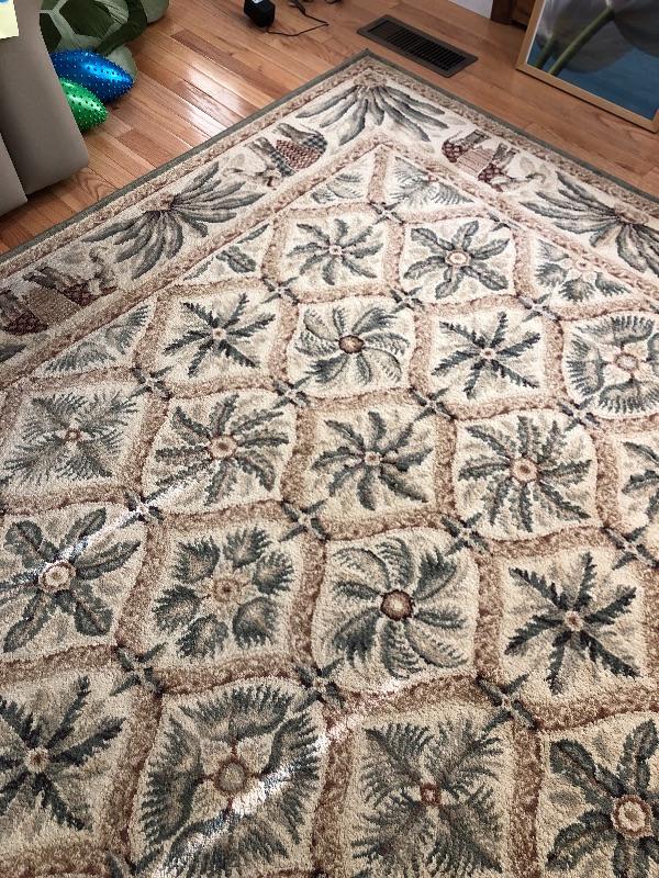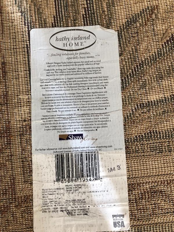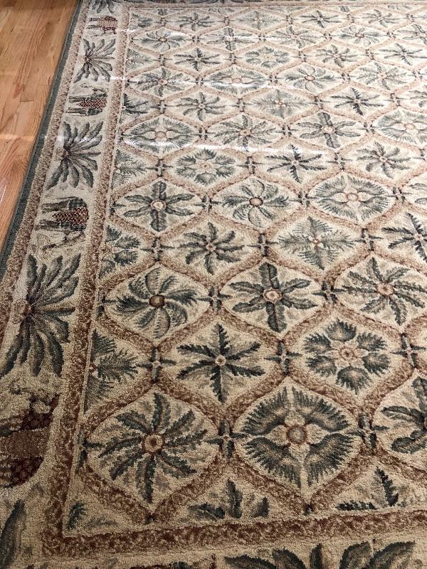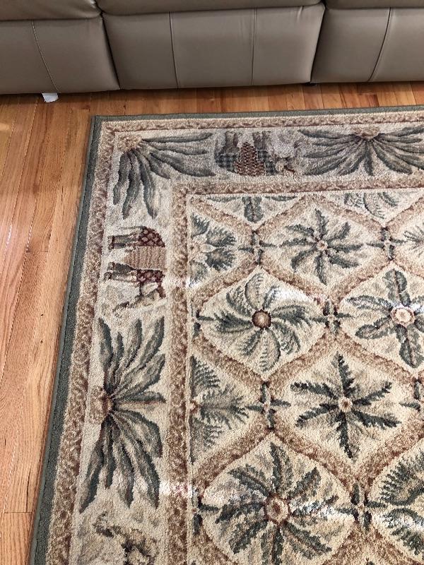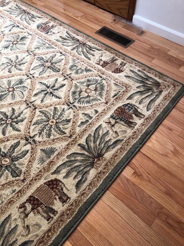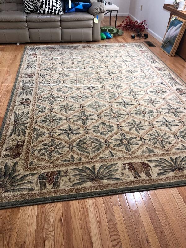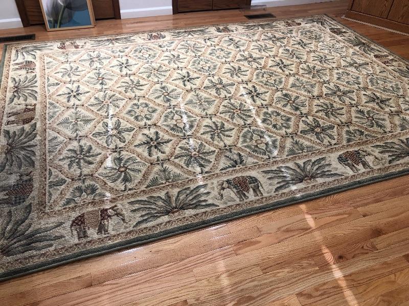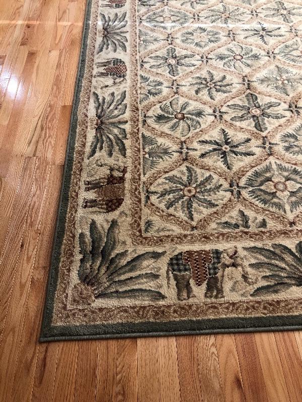 Kathy Ireland Brand Rug. Palm Tree and Elephants, green rim and light beige, good condition. 92 x 131 L