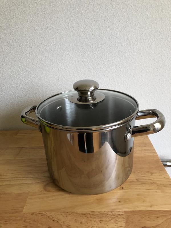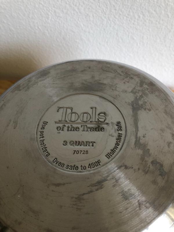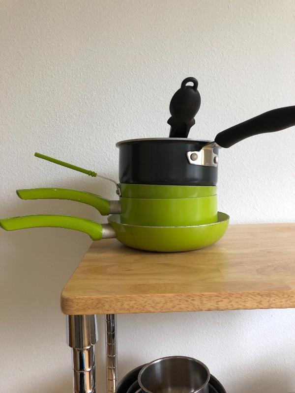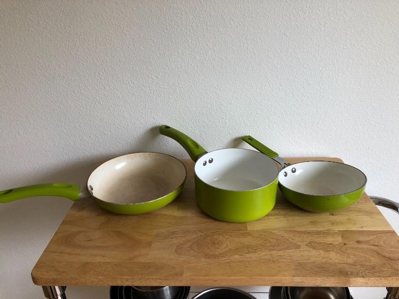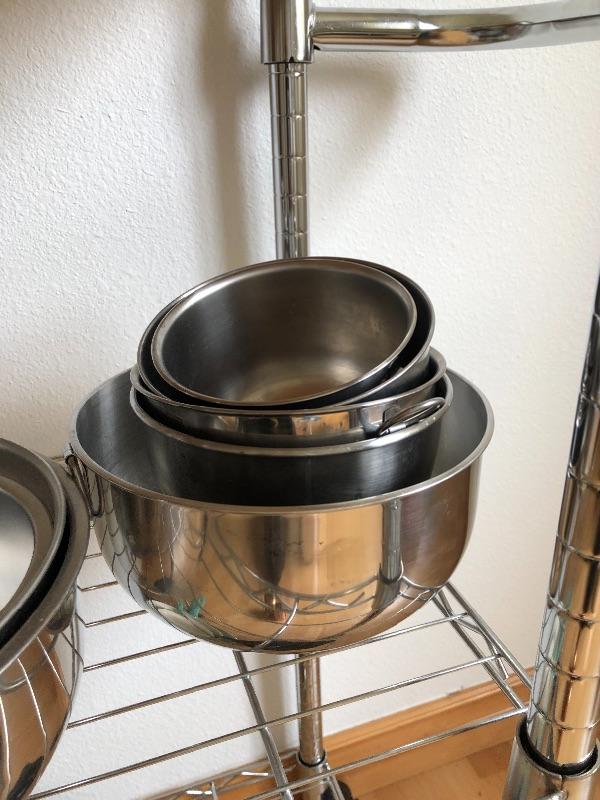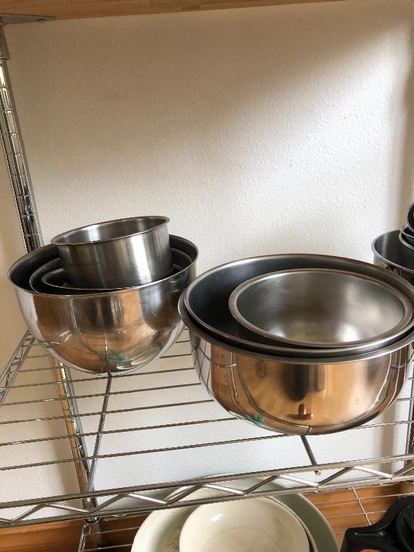 Stainless bowls, skillets, salt and pepper shaker.