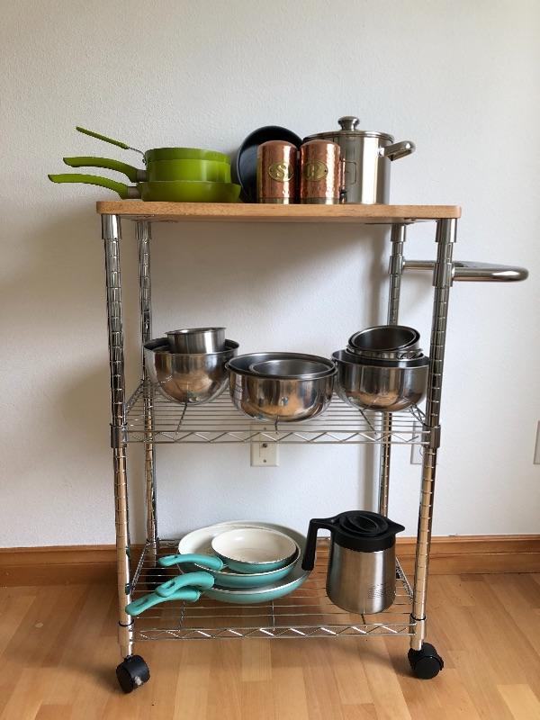 098: Rolling Kitchen Cart Full of Bowls and Pans