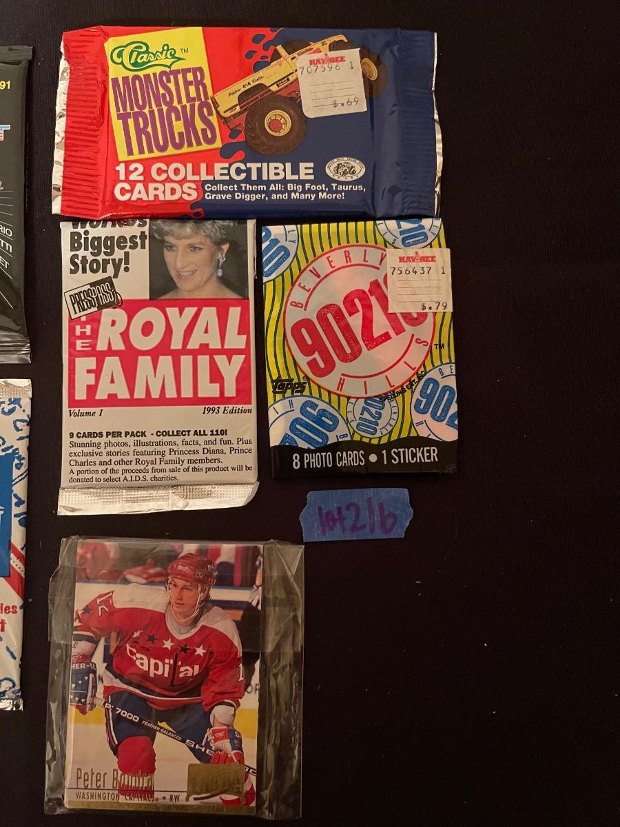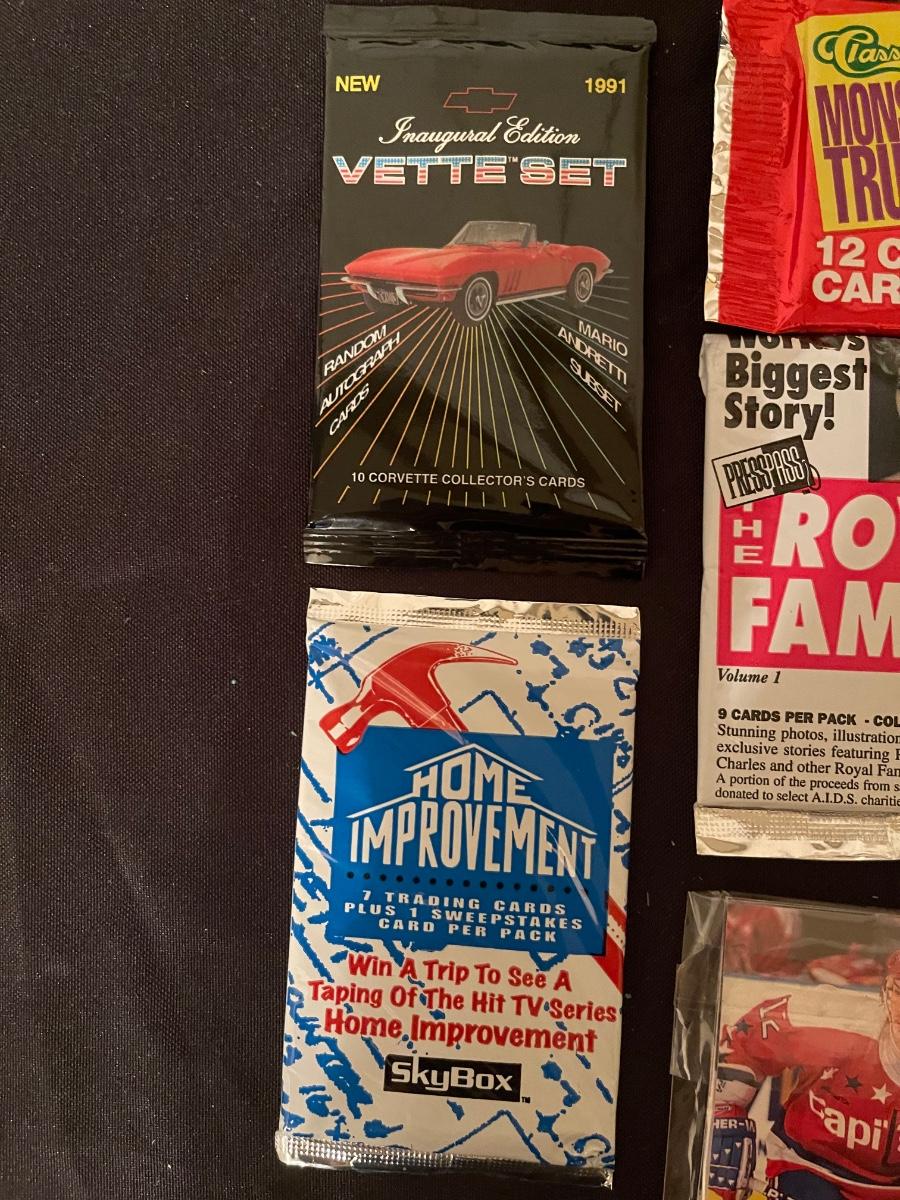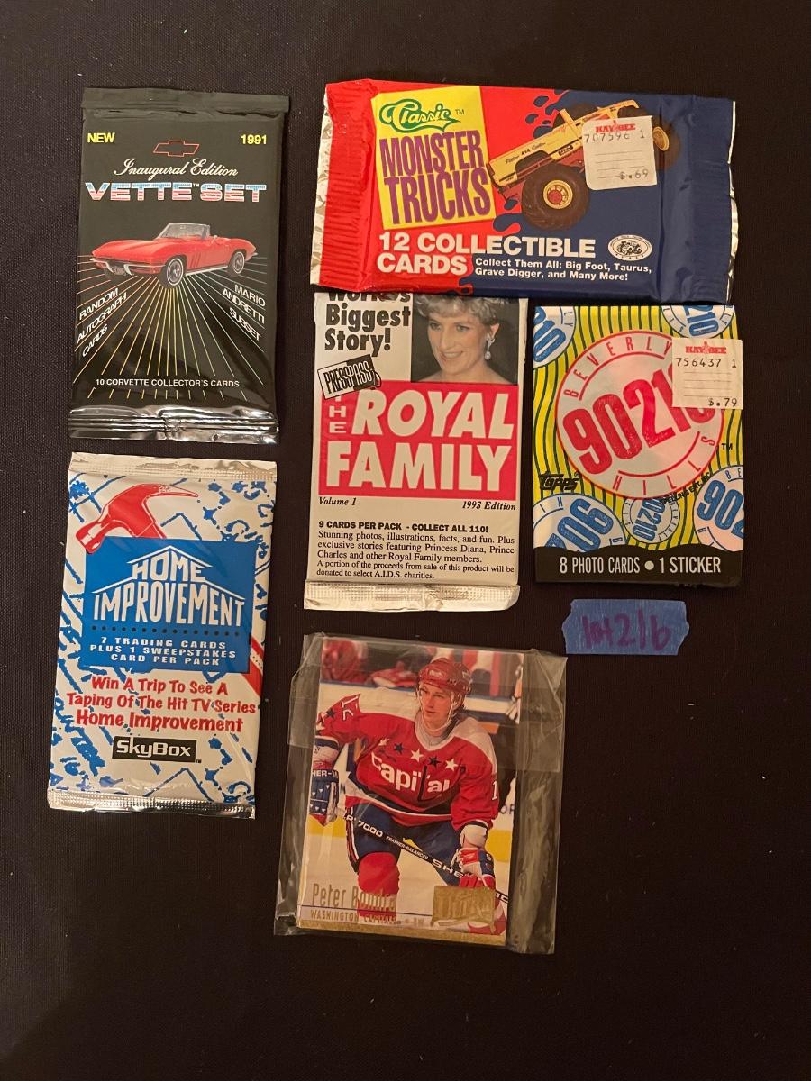 (1) 1991 inaugural edition corvette set, (1) Skybox home improvement, 93-94 caps team set, The Royal family, (1) classic monster trucks, 90210 Beverly Hills.