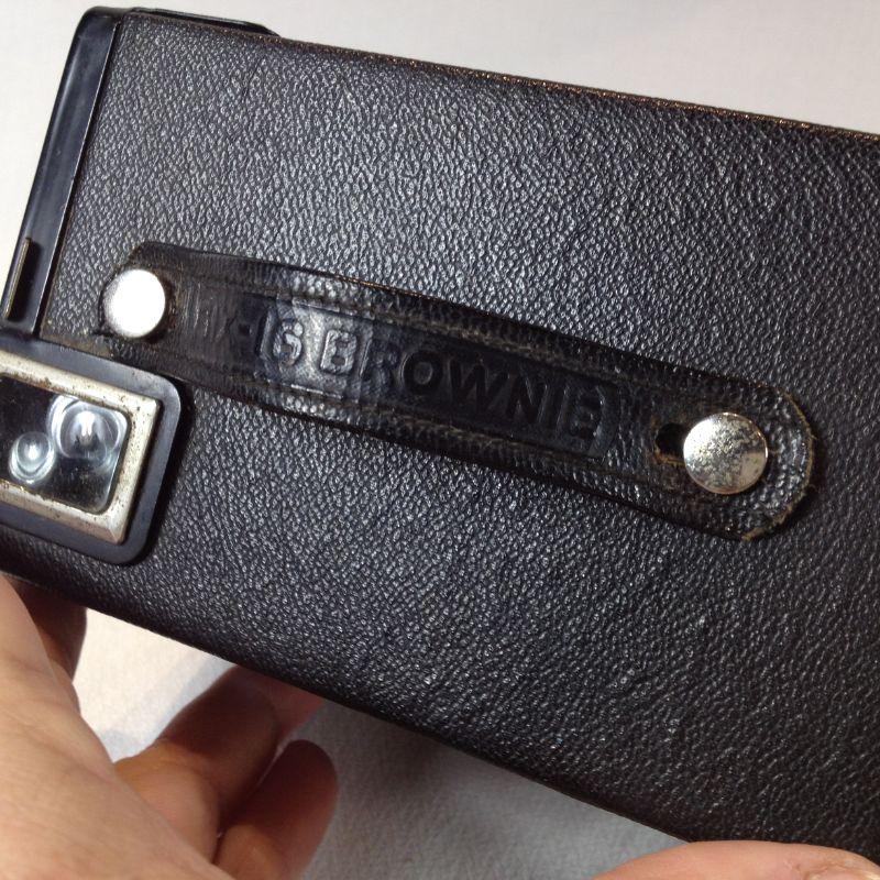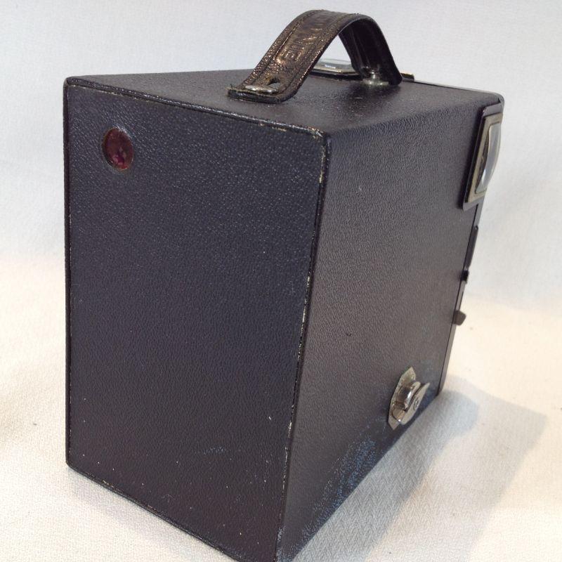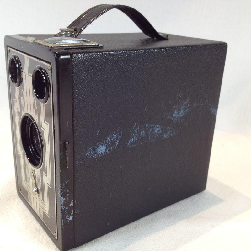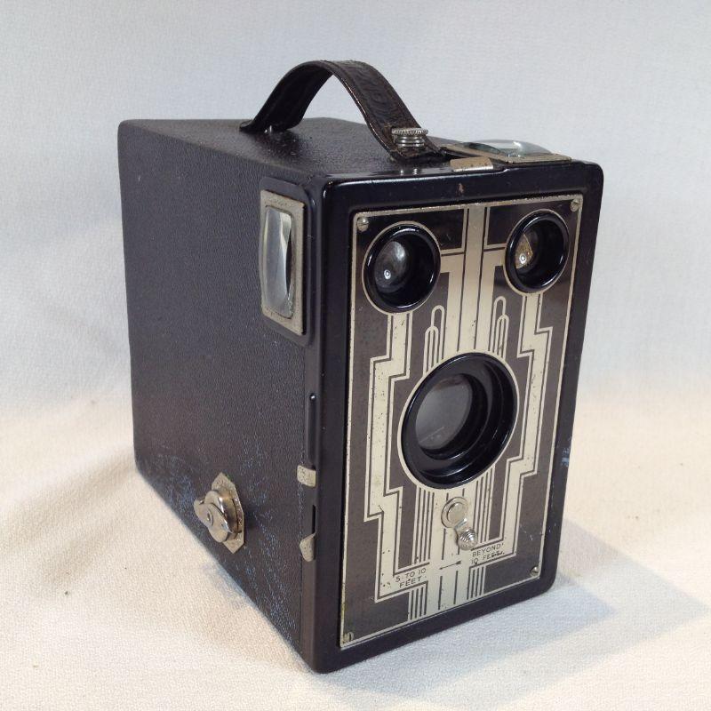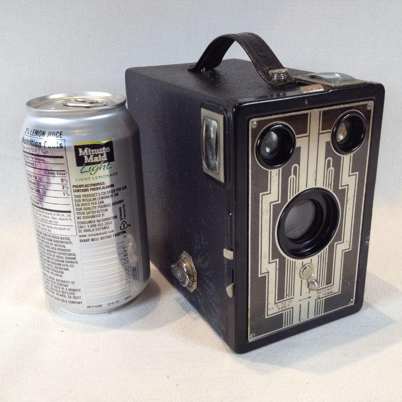 This lot is for a Black Box Camera with designs that set it to the 1920s. The camera is marked on the leatherette handle Six-16 Brownie. The shutter and lens appear to function. Is this a camera-collectors sleeper item? The camera is basically a rectangle box that measures 3.5-inches wide X 5.5-inches long X 5.5-inches high with a the extended handle.