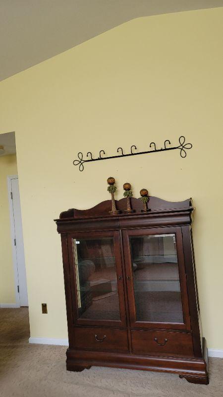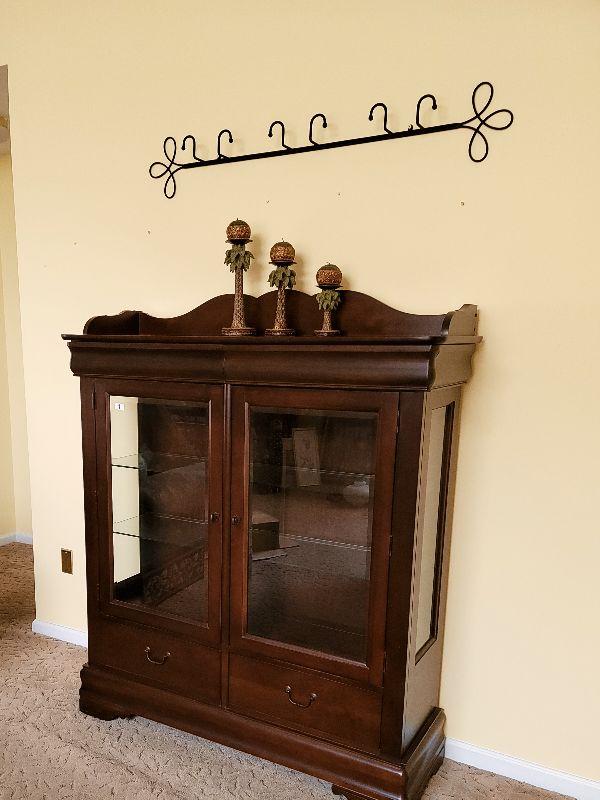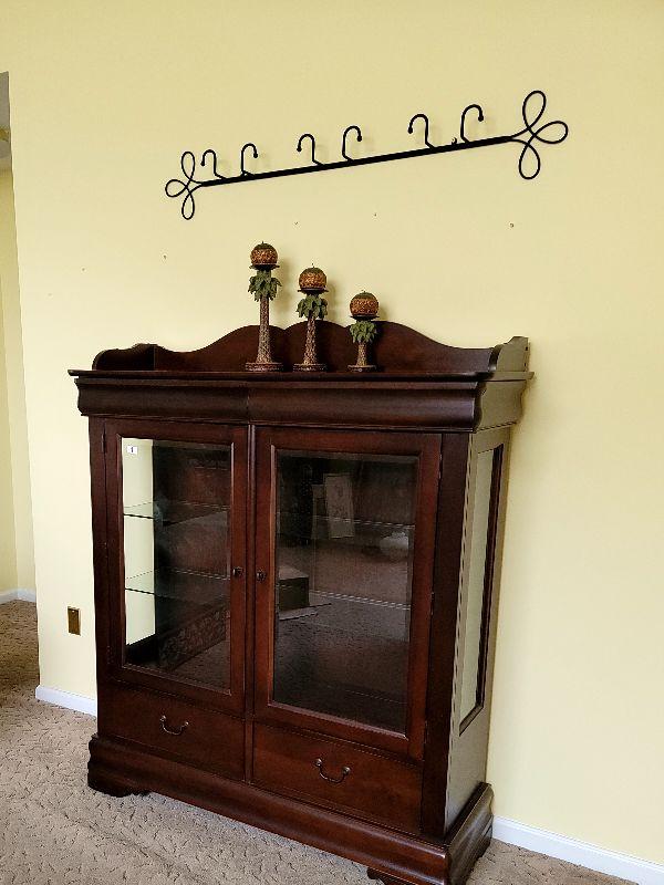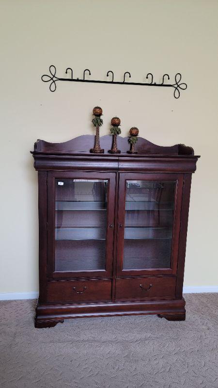 This beautiful cherry china cabinet is 50in x 58in x 18in and is in great condition. This lot comes with everything pictured, the 3 candles and the metal plate rack.