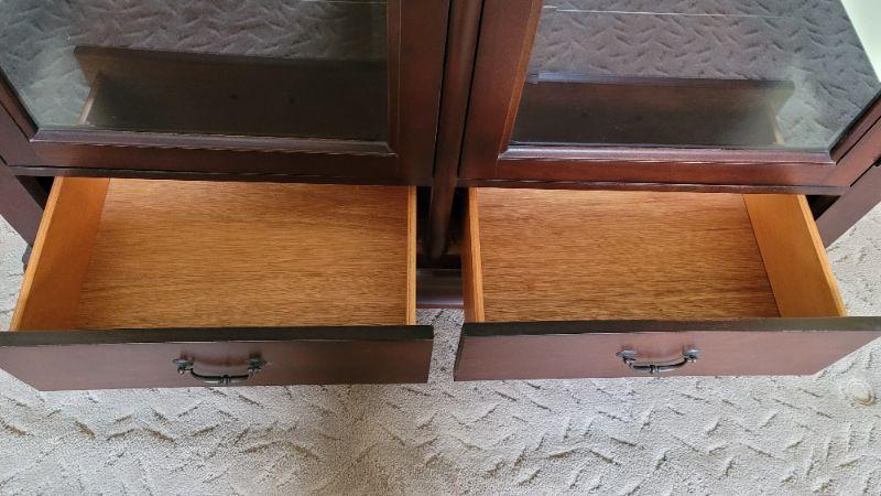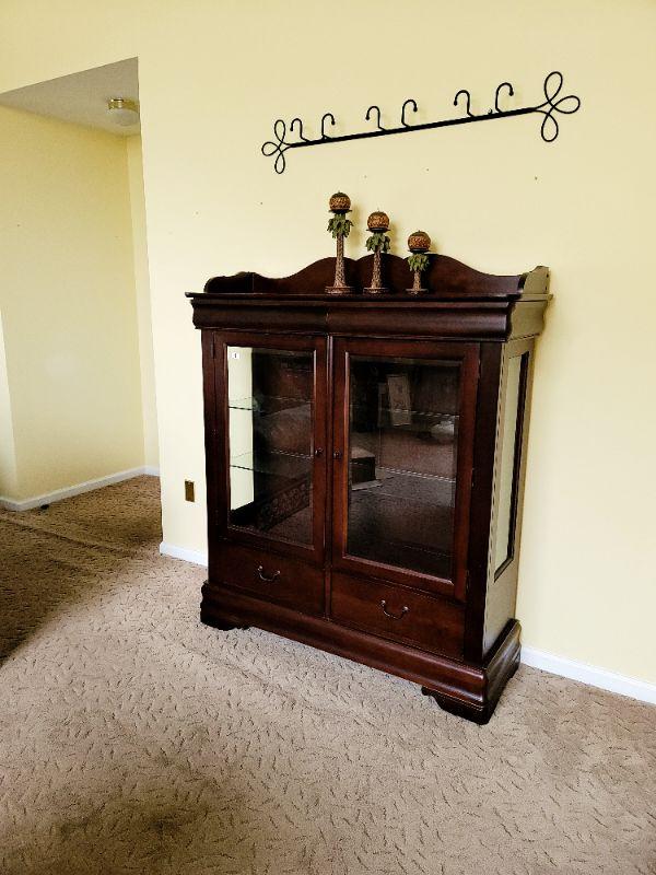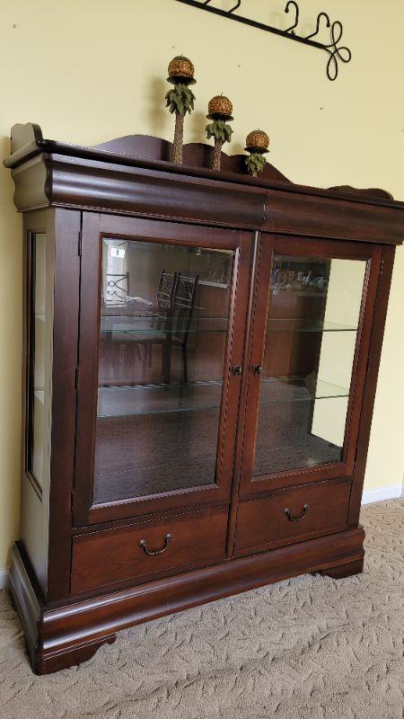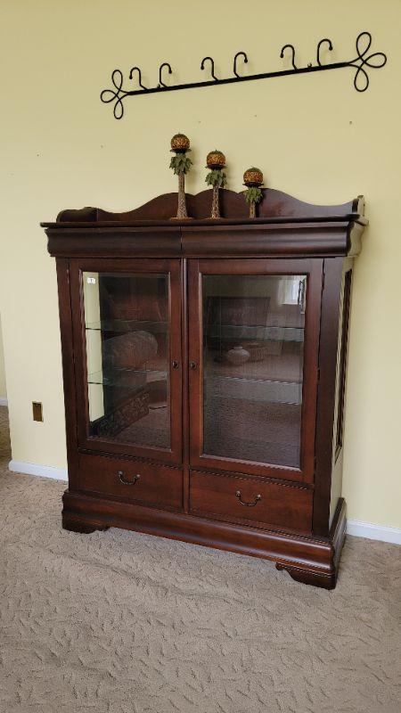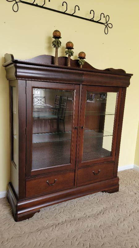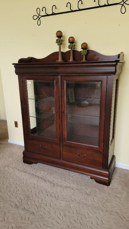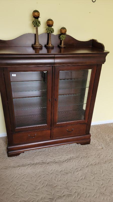 Lot 1: Beautiful Cherry China Cabinet with glass shelves and 2 drawers.