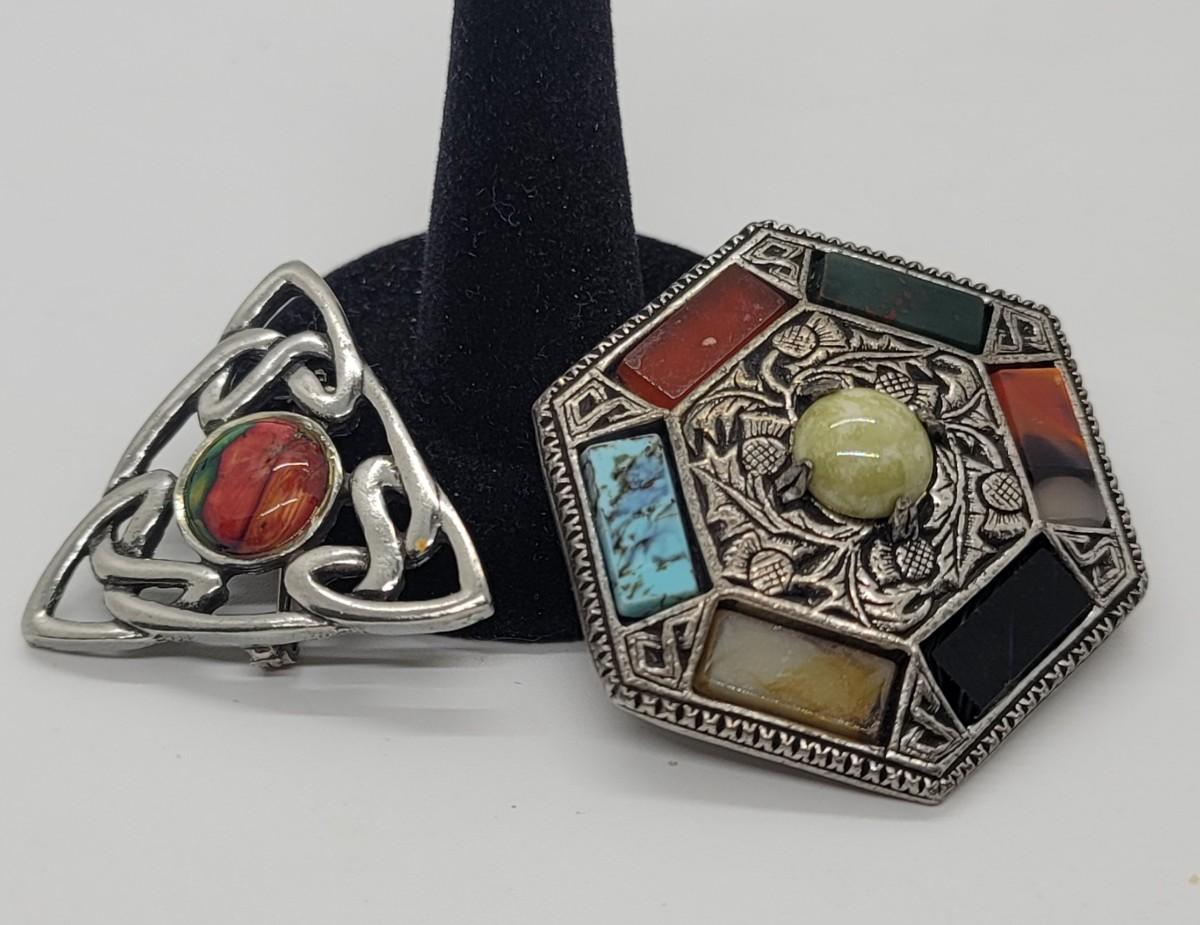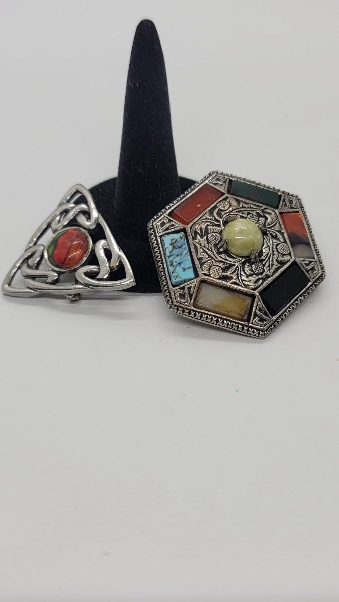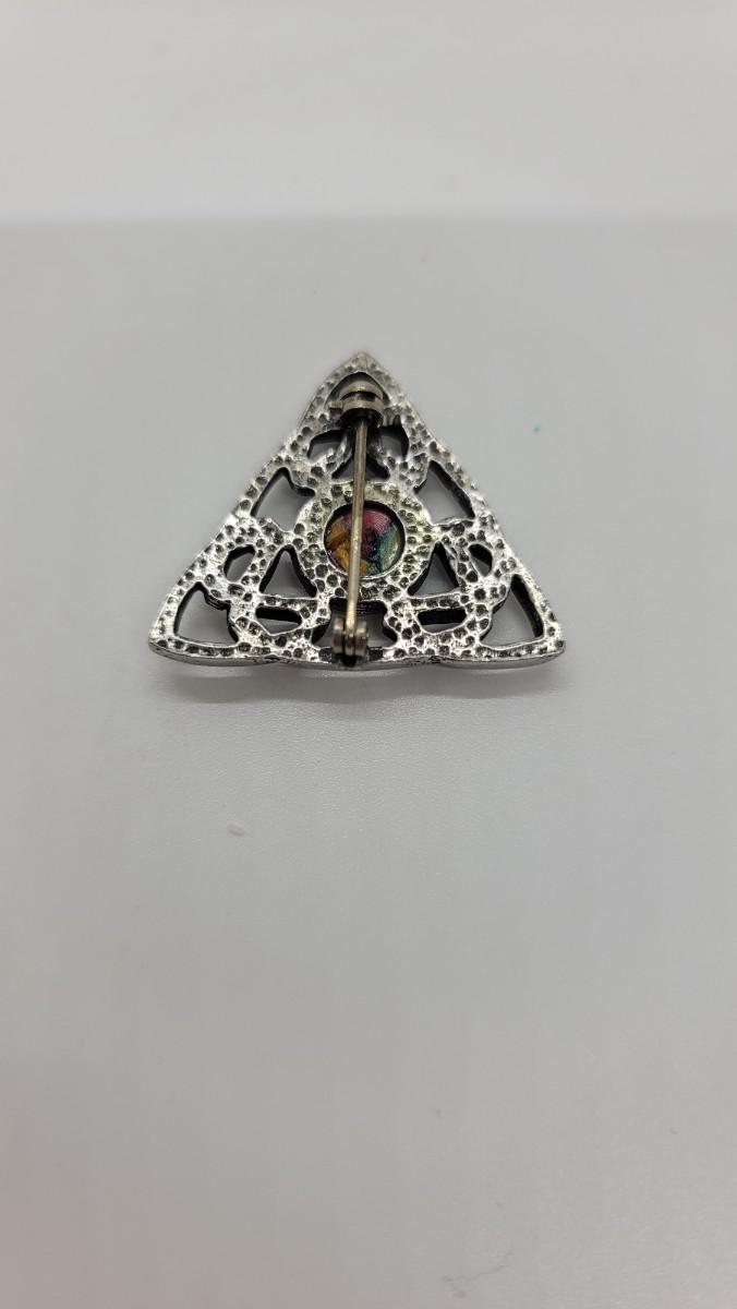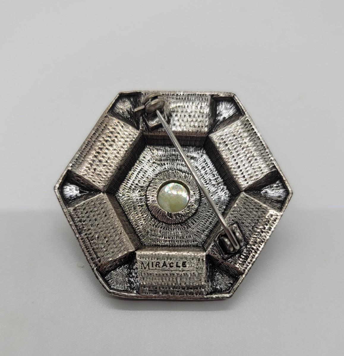 Triangle shaped pin with one stone, 11/5” wide. Hexagon shaped pin with multi-stones, marked Miracle, 13/4” wide.