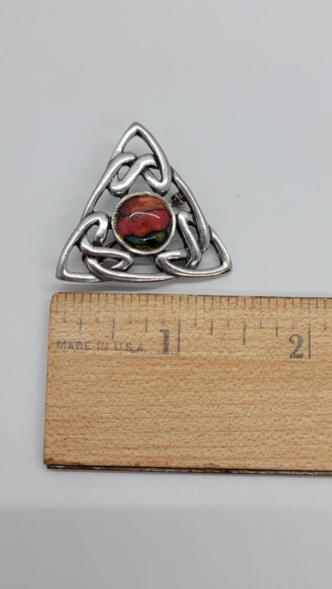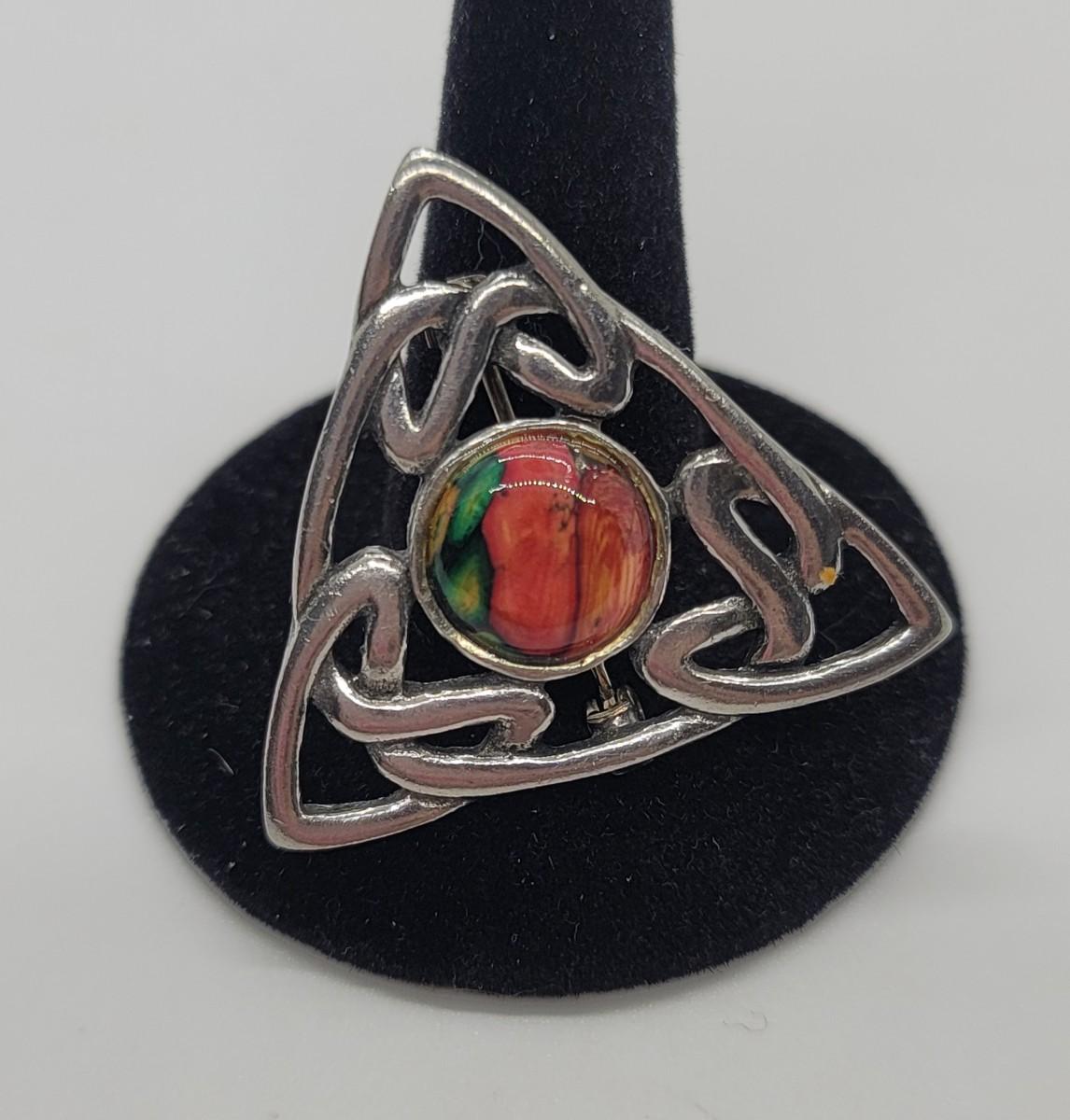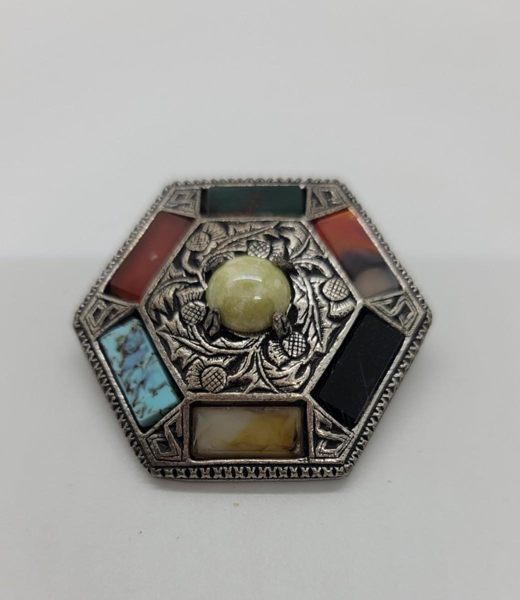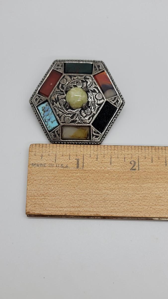 Triangle shaped pin with one stone, 11/5” wide. Hexagon shaped pin with multi-stones, marked Miracle, 13/4” wide.