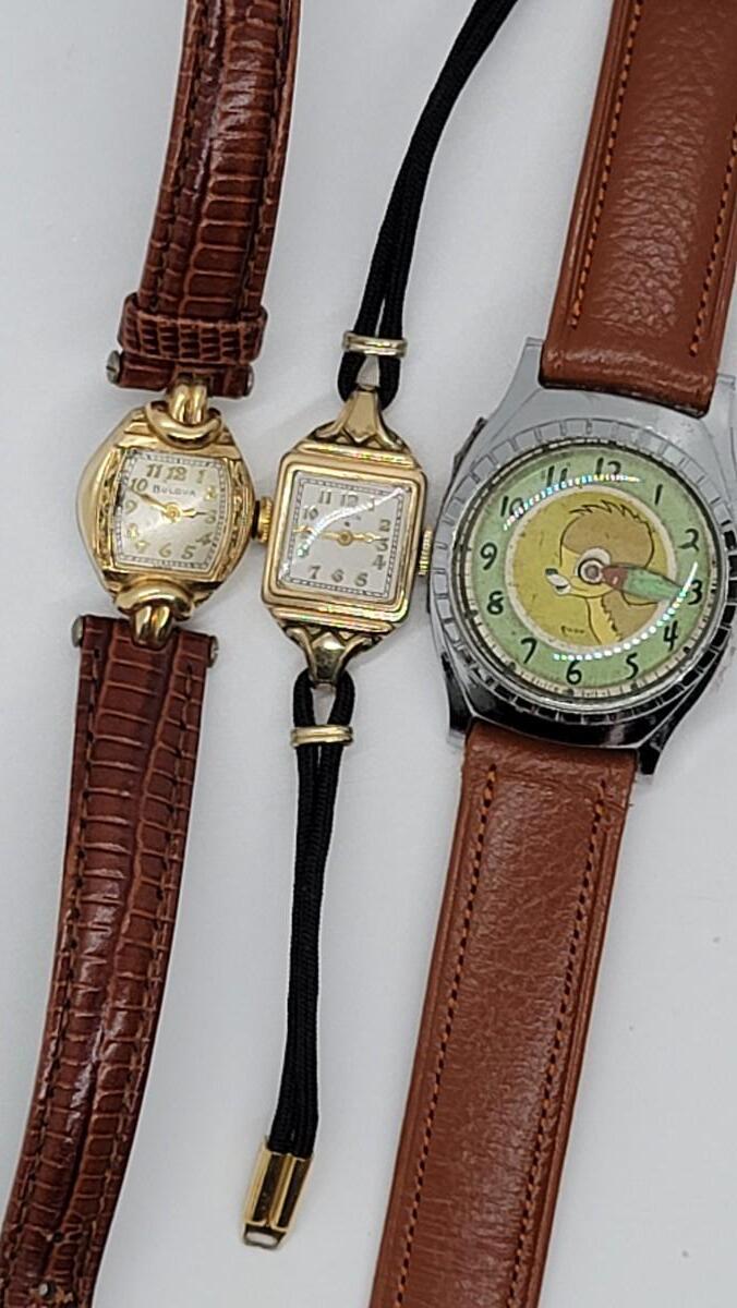 Disney Bambi watch, antique ladies Elgin that WORKS and a Bulova. Two of the three need battery or repair.